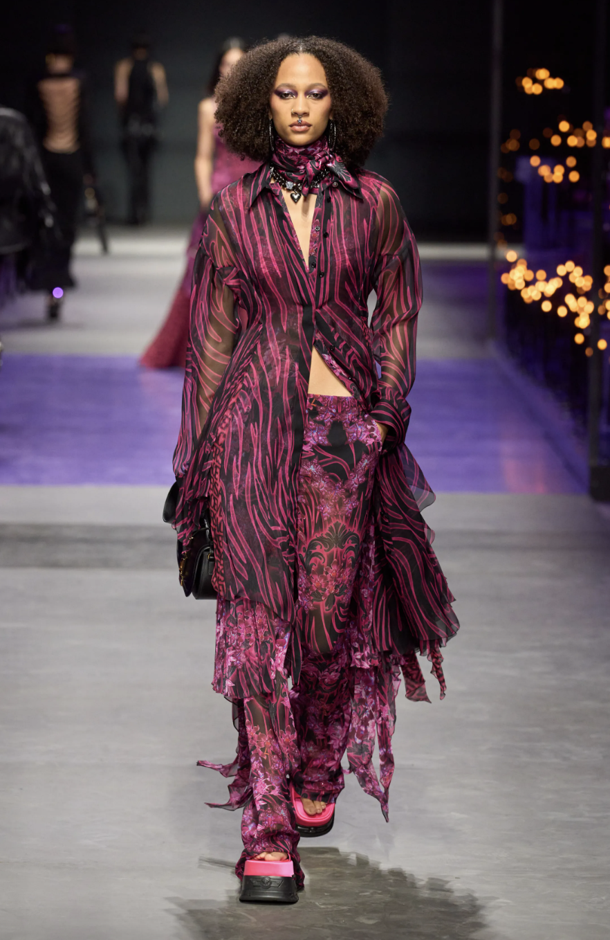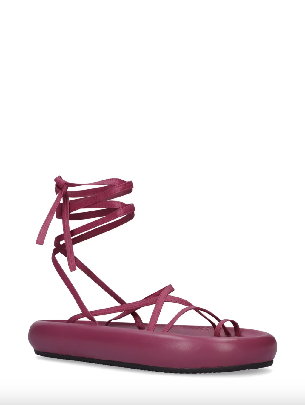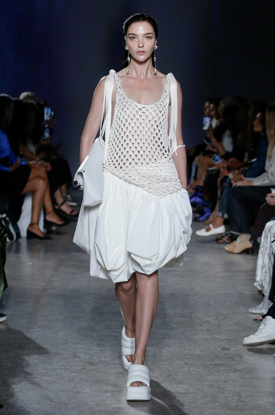 Chunky sandals were more or less everywhere on the SS23 catwalks. Worth mentioning are the bright pink and black ones by Versace, accompanied by prints in tones between natural and animal prints, the fiery red ones by Stella McCartney, asymmetrical, with thin laces and closed at the ankle; Proenza Schouler's white and fluffy ones, paired with a voluminous skirt and crochet top; Monse's green and white ones, worn with a pleated mini skirt and a knitted layer; Jonathan Simkhai's beige ones with a blazer-look micro dress, a slave bracelet and masked glasses.