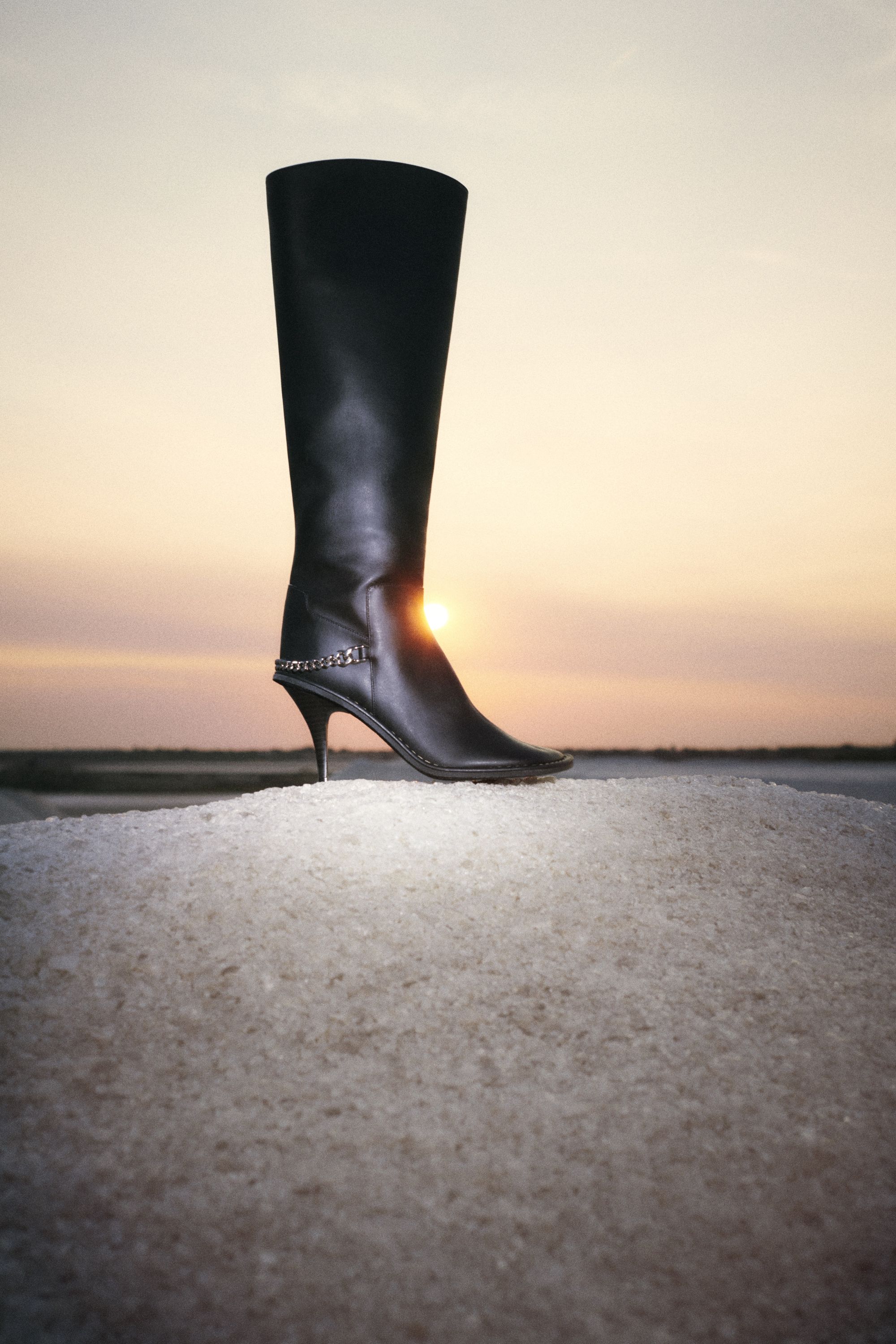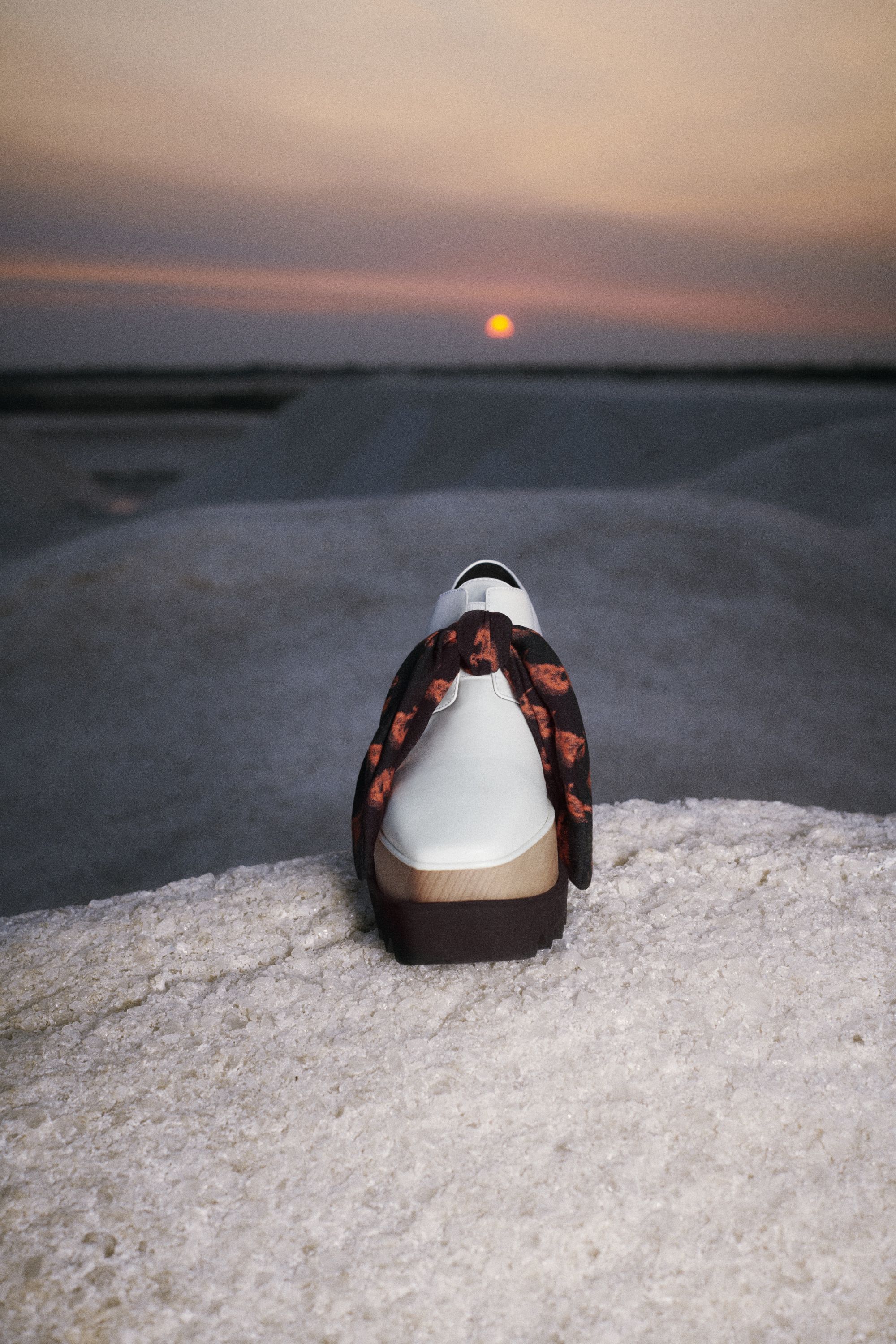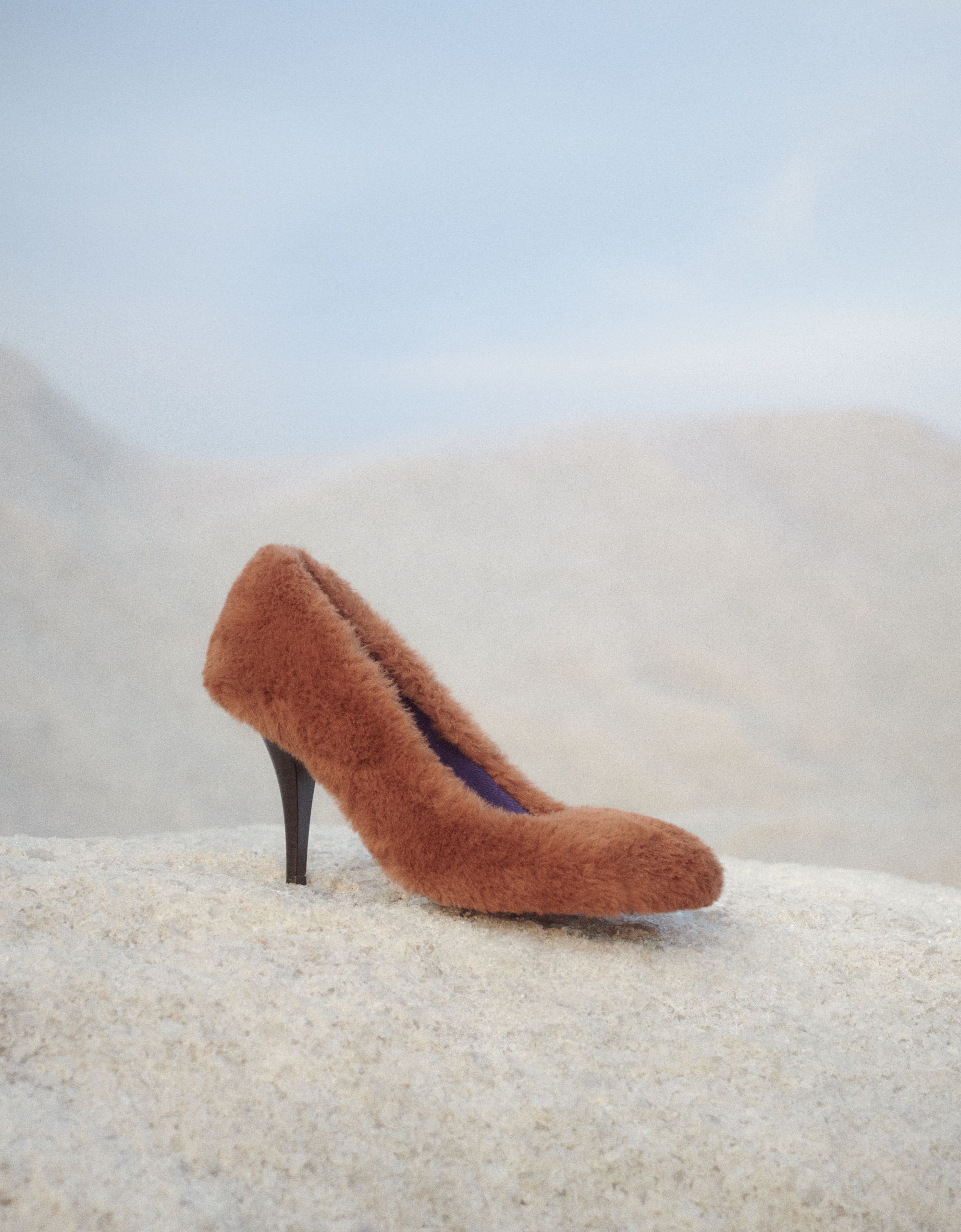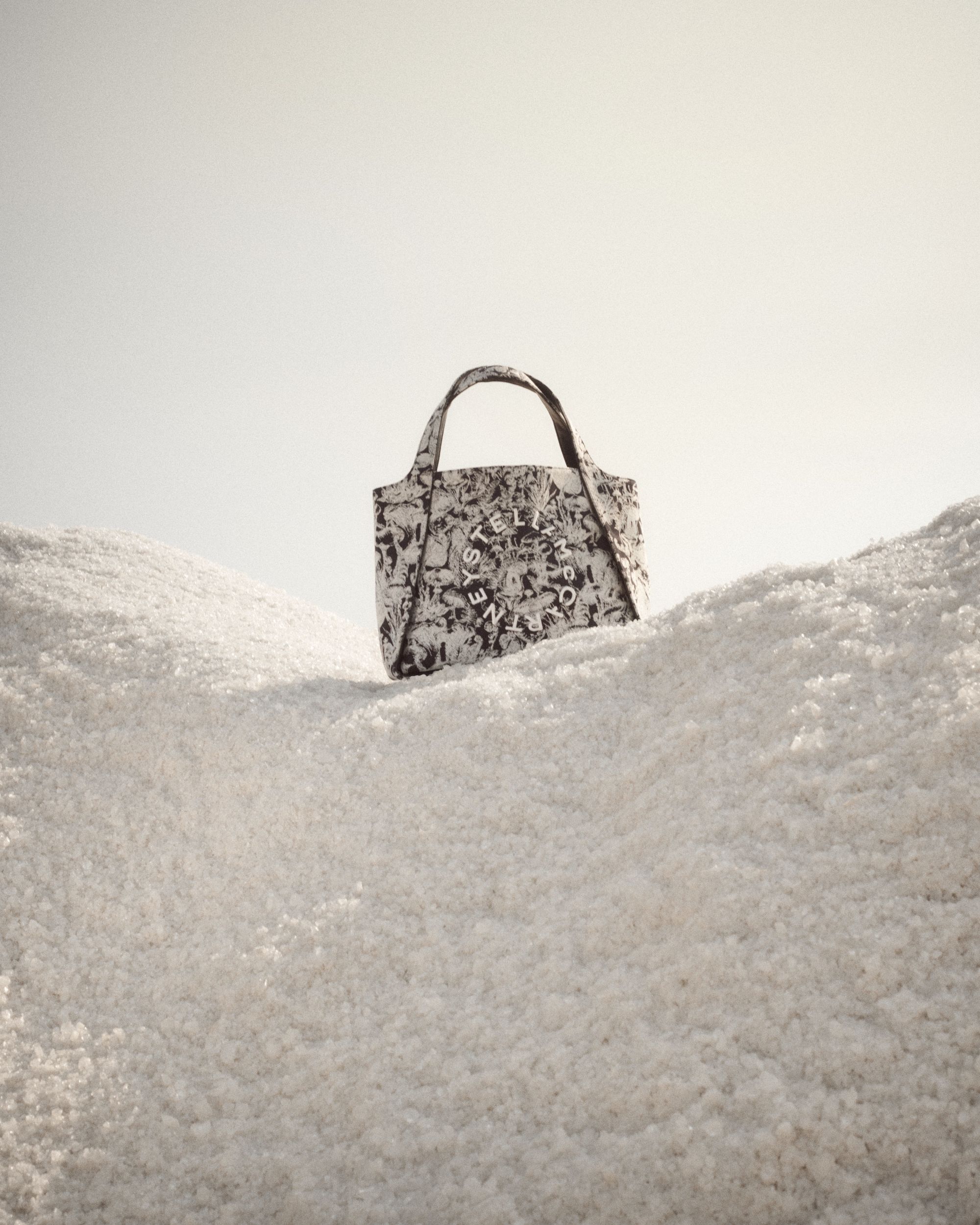 Material innovations include vegan crocodile-effect Frayme bags and S-Wave bags made from apple waste, as well as riding boots made from grape waste. The collection also includes accessories made from mushroom mycelium and MIRUM®, an animal-free alternative to animal leather that is made from plants, not plastic. It is completely natural and circular and can be recycled into new materials or returned to Mother Earth as a nutrient. The prêt-à-porter collection is made from 92% sustainable materials, making it Stella McCartney's most responsible winter collection to date. The brand has never used animal leather, feathers, fur or exotic skins.