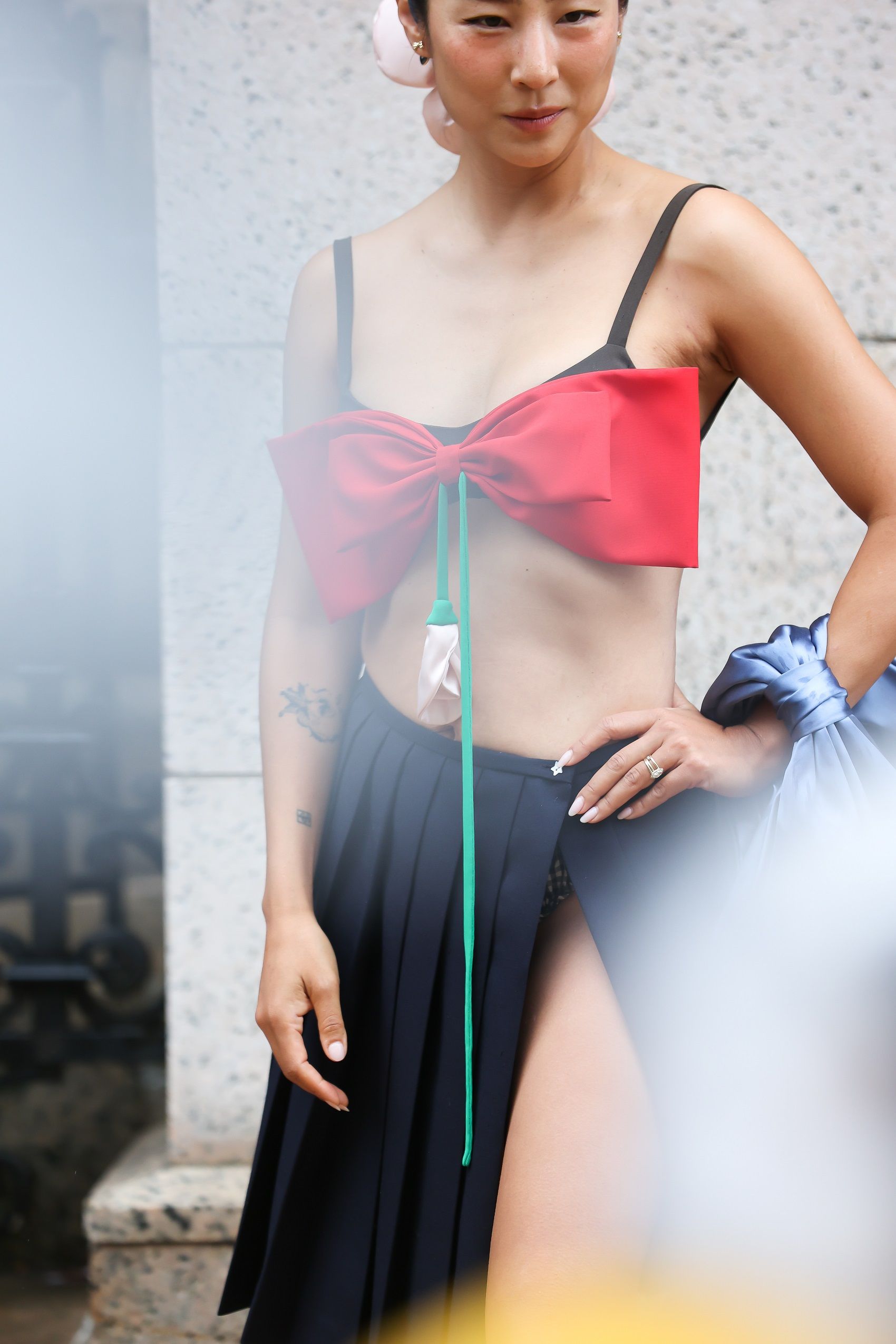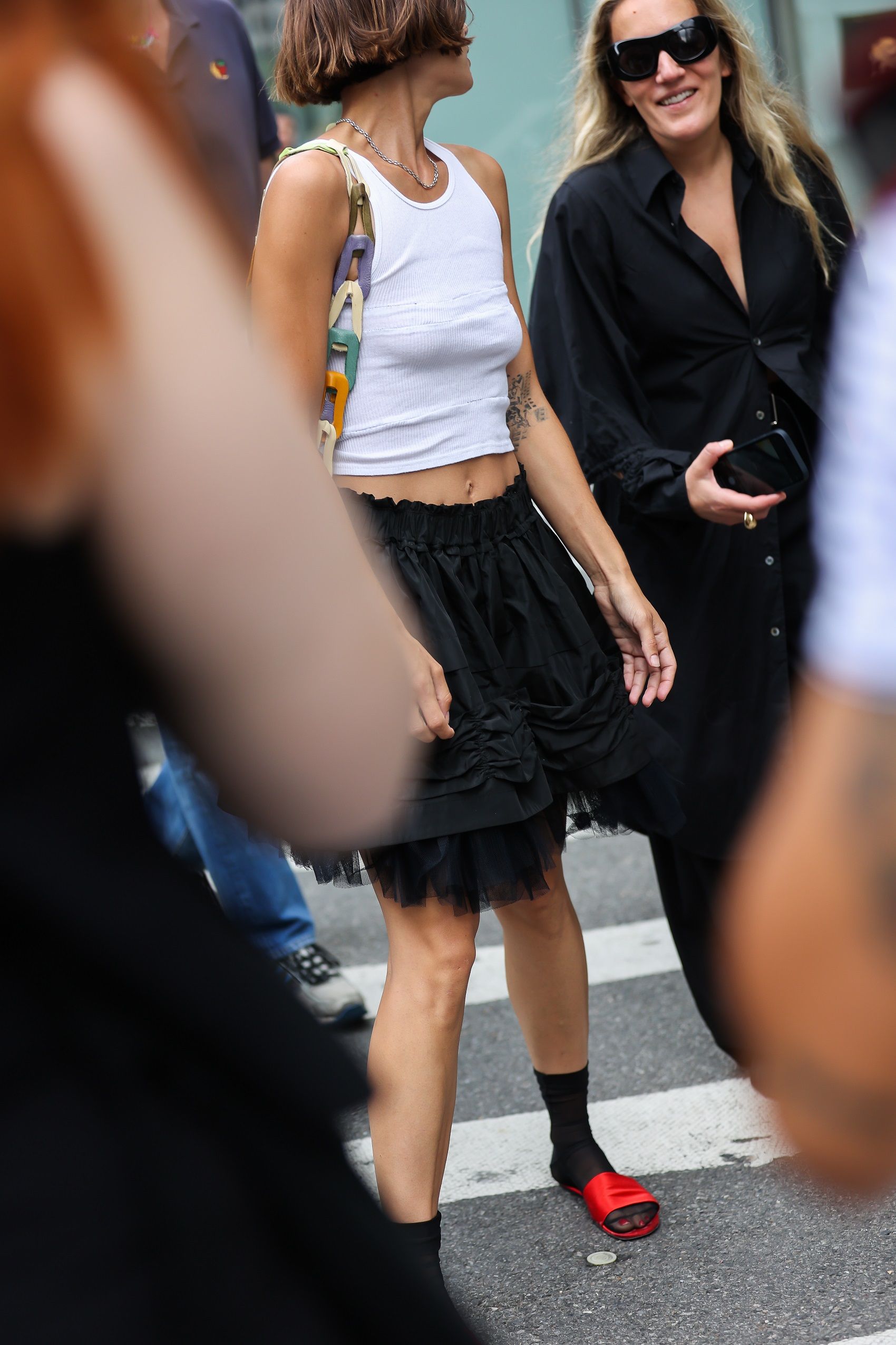 New York Fashion Week opened the fashion month dedicated to SS24. The streets of the Big Apple were filled with covetable outfits that perfectly capture what we've seen on recent catwalks from the likes of Sandy Liang and Proenza Schouler: a return to a certain bitchy femininity on the one hand, and a search for a cleaner and more minimalist, quiet luxury aesthetic on the other. On the beauty side, the braids and bows triumph, appearing not only on the dresses but also in the hair, becoming a kind of super-sweet statement. The make-up? The faces of the parade participants are clean, with a focus on the eyes, thanks to the graphic cat eyes. Colour-wise, the classic dualism of black and white returns, with hints of red, yellow and blue. When it comes to accessories, sunglasses, white socks and mini bags in various colours and materials - from leather to canvas to the popular crocodile - are still a must-have.