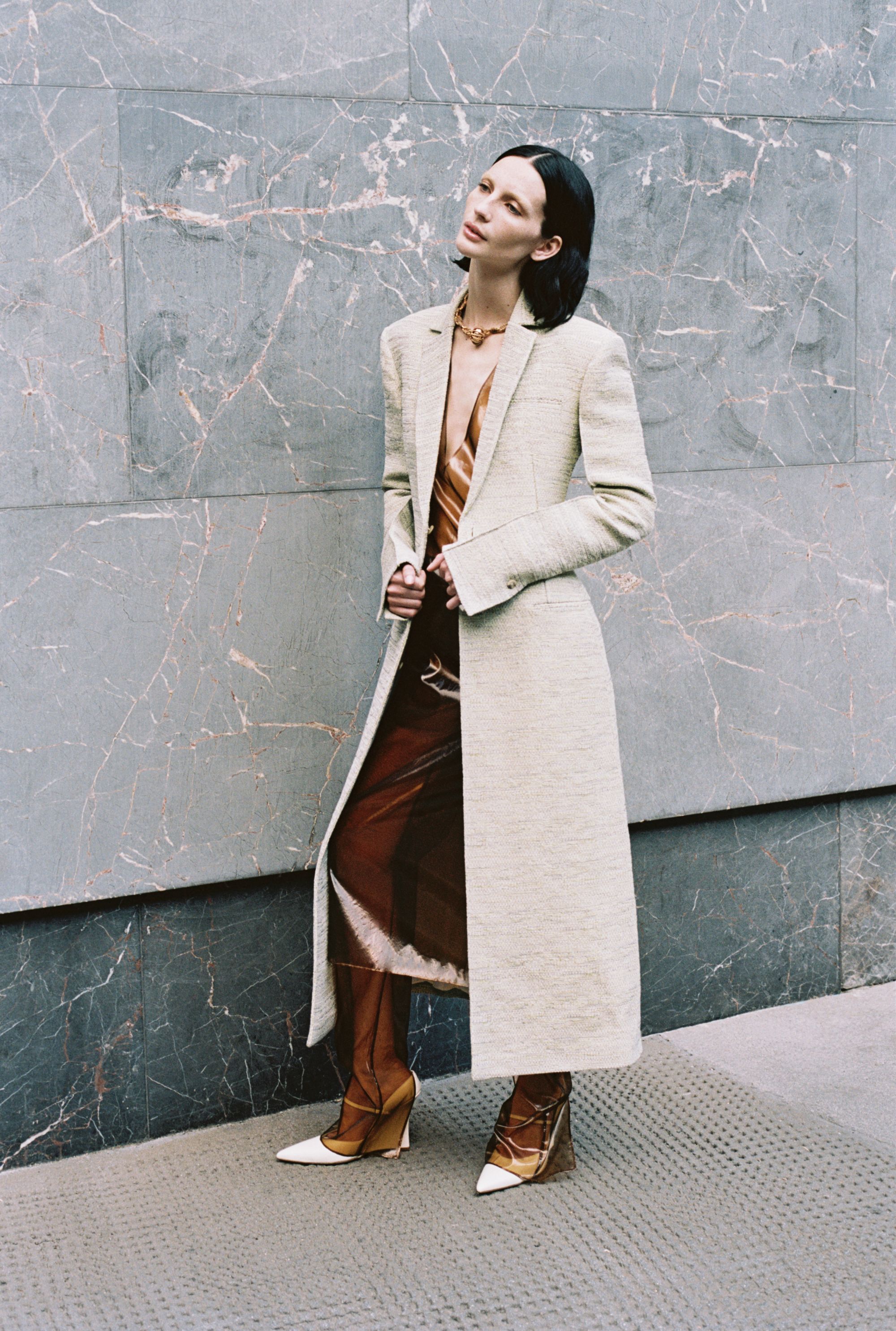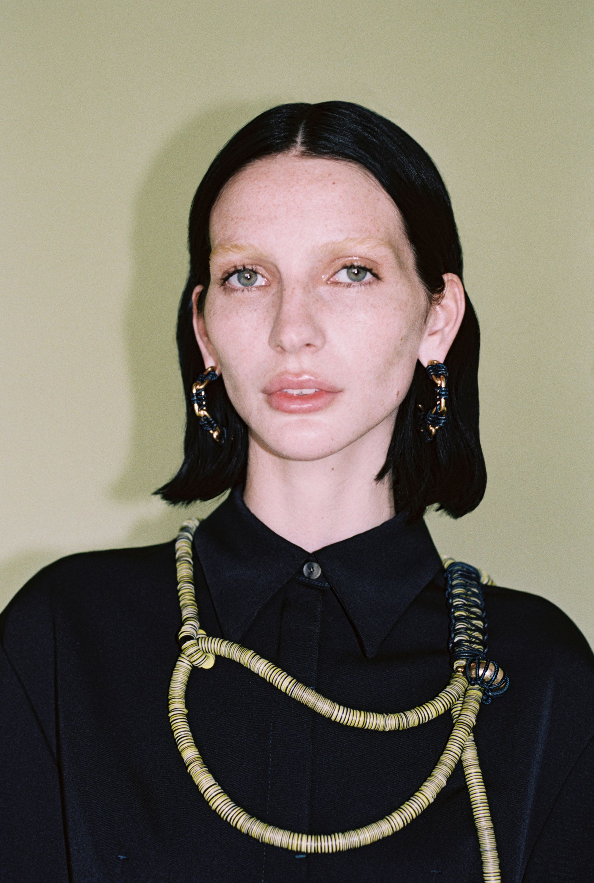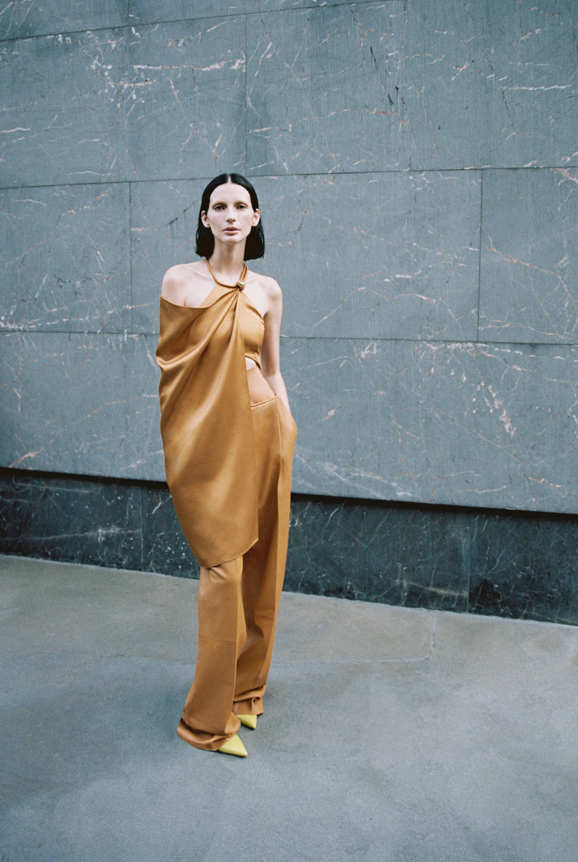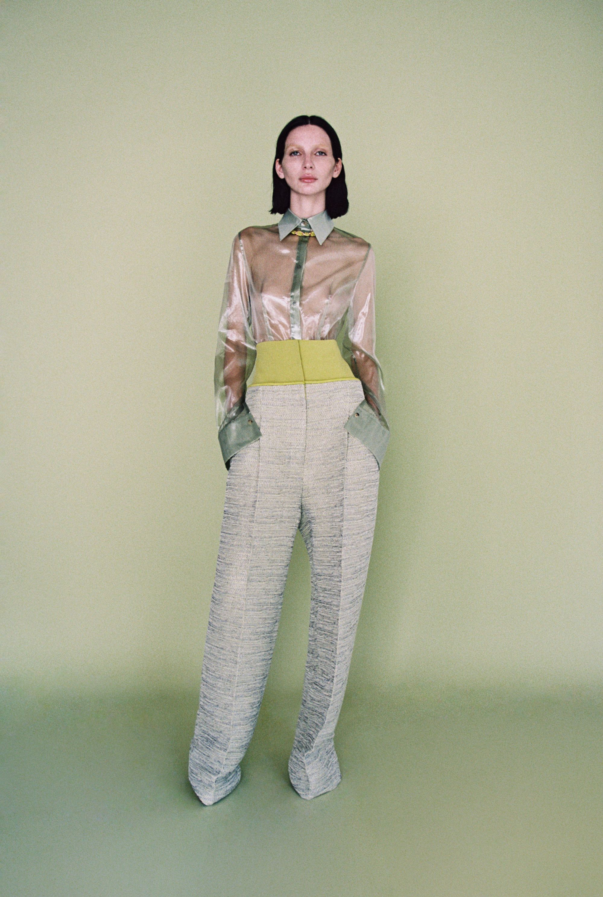 What is surprising about this SS24 collection is its multi-coloured register of styles. Gabriele Colangelo challenges gender conventions and boldly mixes masculine and feminine elements. The garments shift from heavy to light, opaque to transparent, creating a unique balance between solidity and ethereality. "The motif of the cape and the suit is also found in the outerwear, which in this case consists of a continuous piece of the jacket and the shirt itself, all in a masculine cut." Tailored outerwear in diagonal matte wool alternates with slip dresses in lustrous silk, while mini scarf dresses in soft nappa leather co-exist with mottled cotton coats. "Rigid metal chains knotted with leather cords form semi-circles for necklaces, earrings and bracelets, bringing vibrant shades of lime green mixed with white, camel and navy blue, the signature colours of the collection."