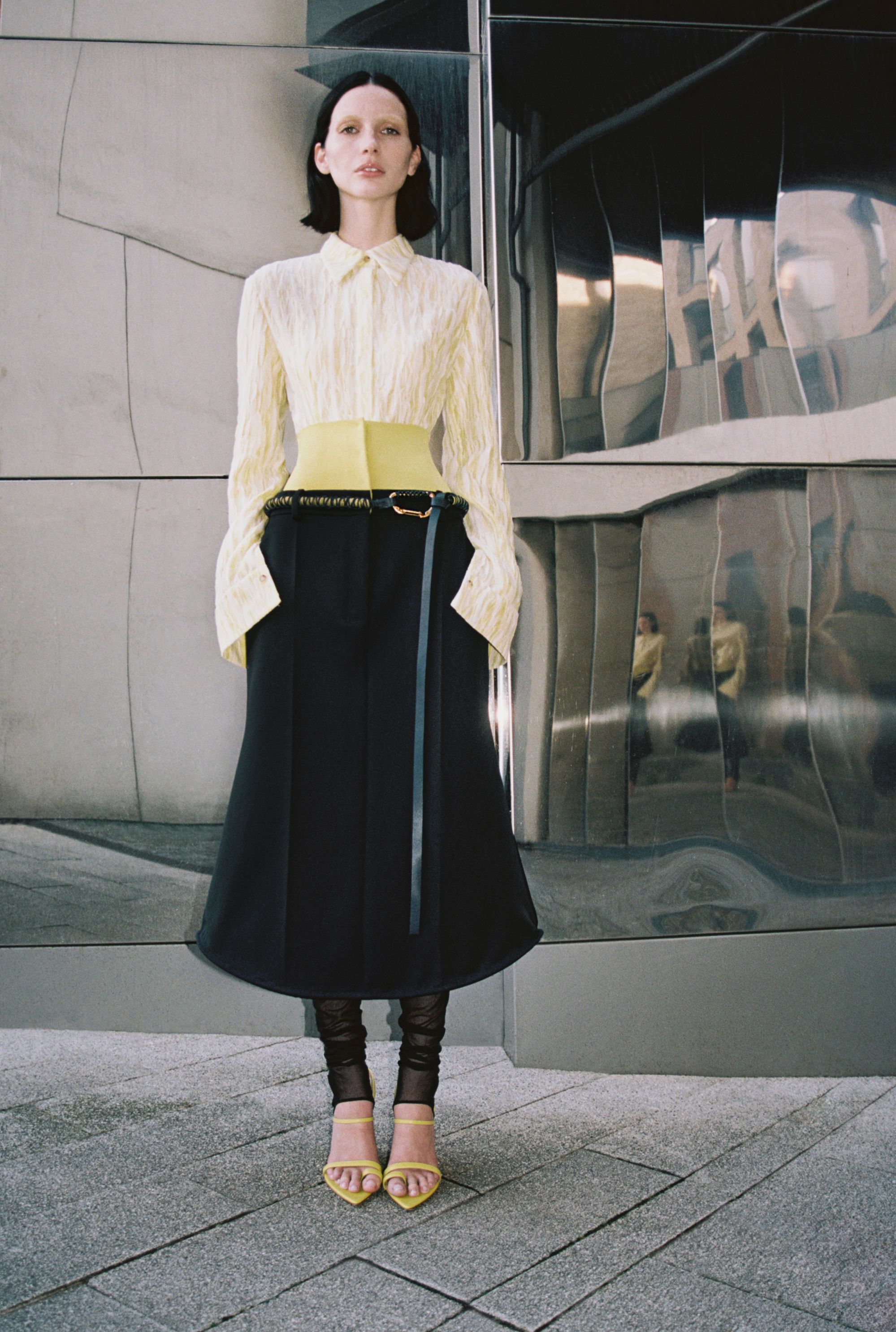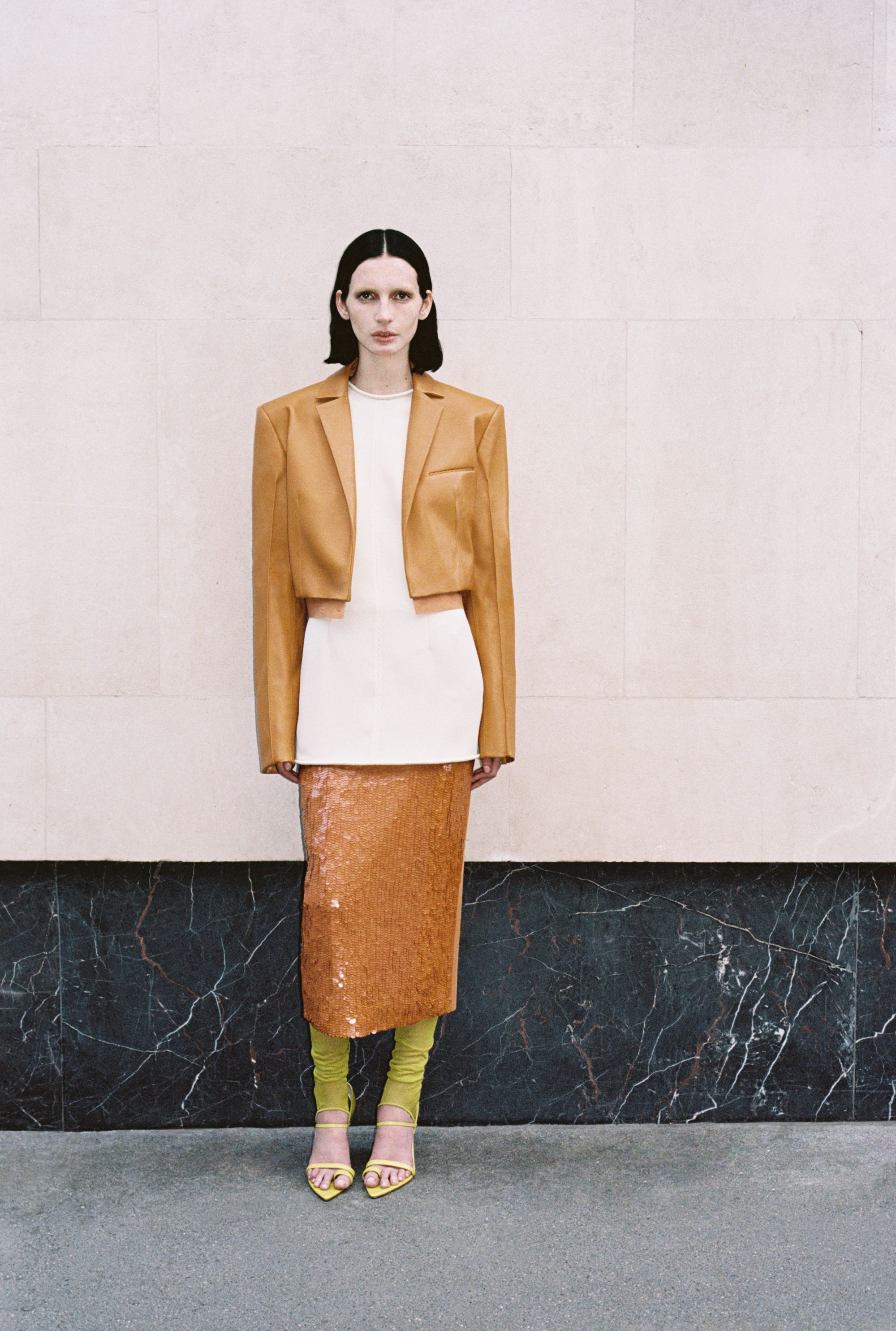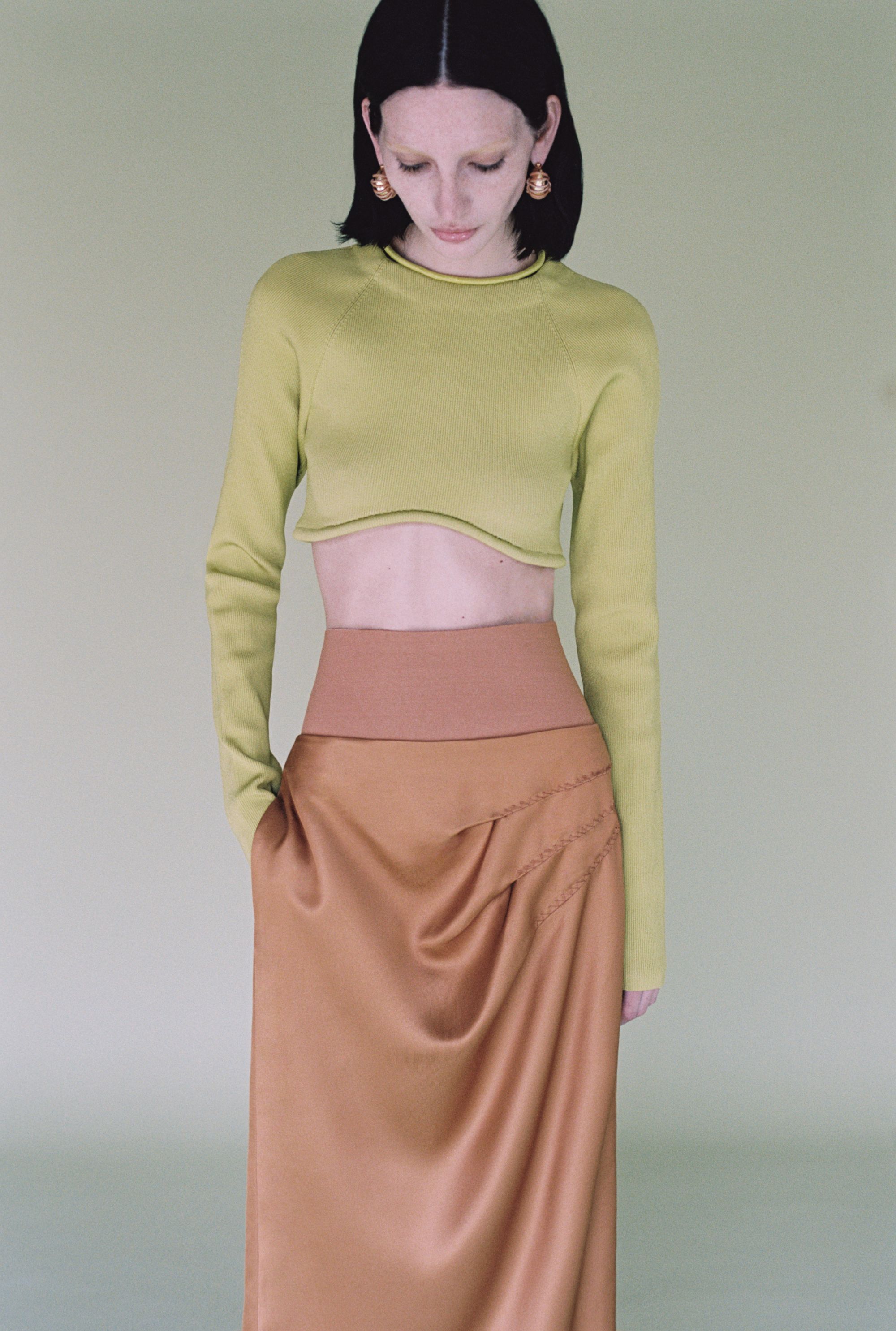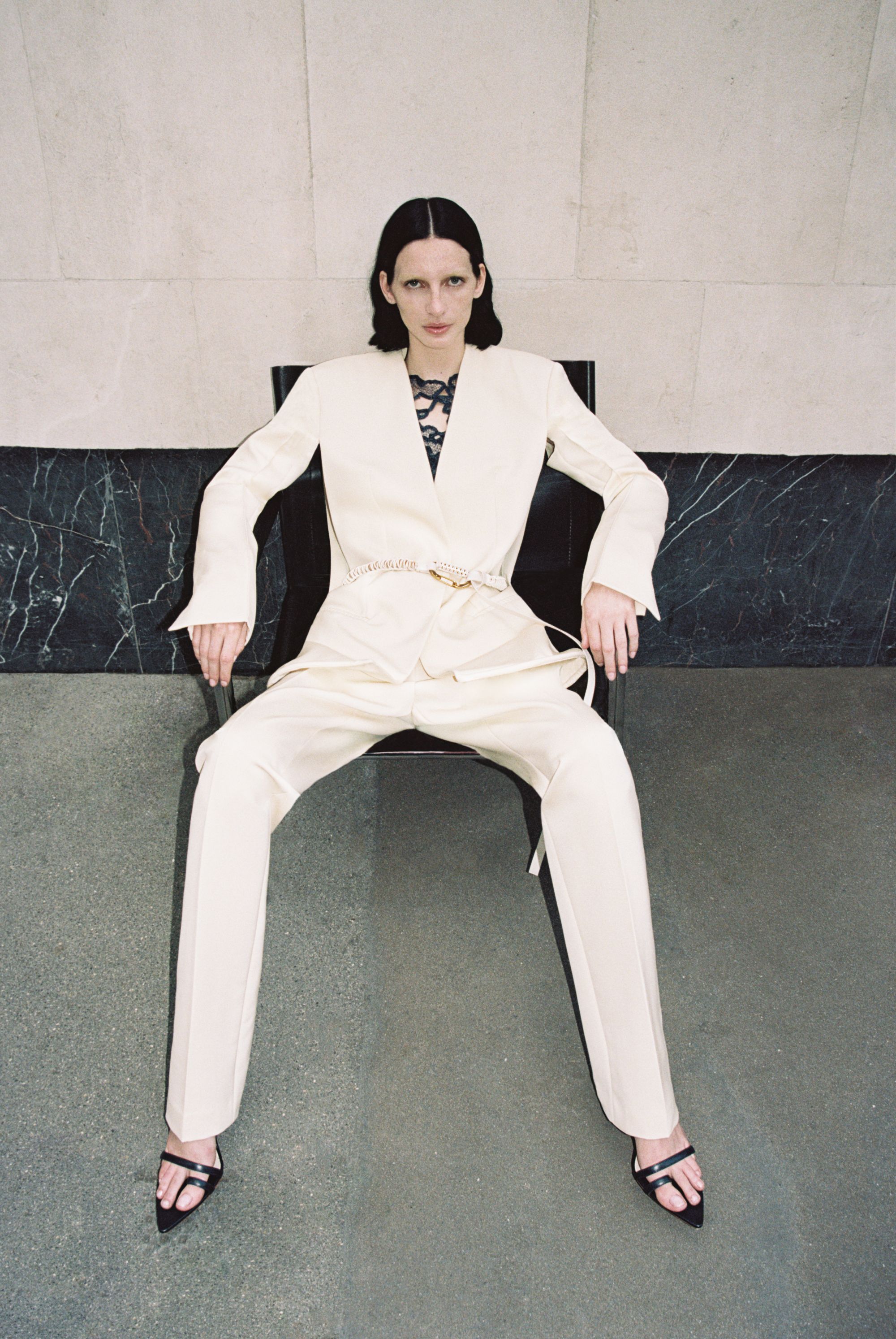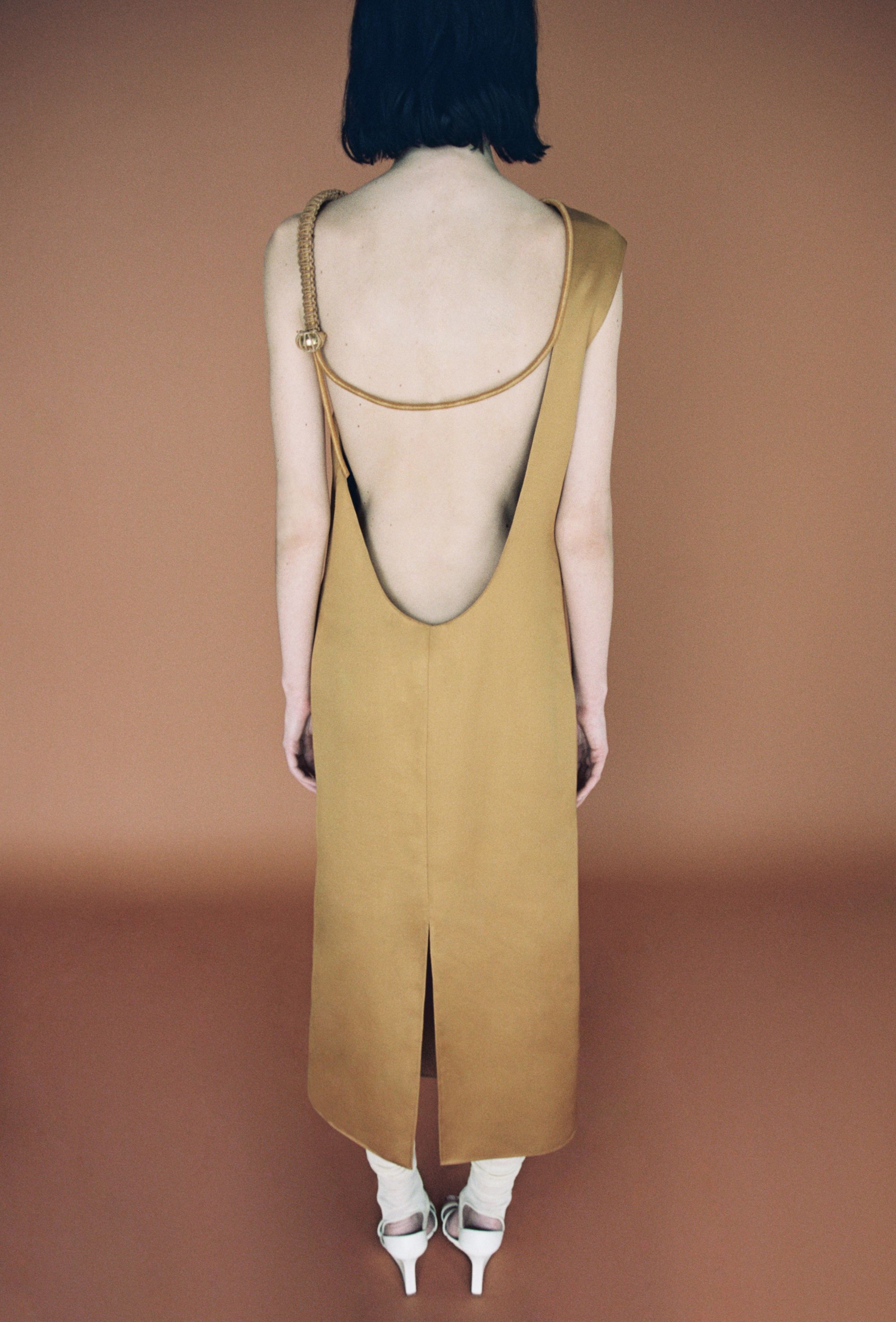 What is surprising about this SS24 collection is its multi-coloured register of styles. Gabriele Colangelo challenges gender conventions and boldly mixes masculine and feminine elements. The garments shift from heavy to light, opaque to transparent, creating a unique balance between solidity and ethereality. "The motif of the cape and the suit is also found in the outerwear, which in this case consists of a continuous piece of the jacket and the shirt itself, all in a masculine cut." Tailored outerwear in diagonal matte wool alternates with slip dresses in lustrous silk, while mini scarf dresses in soft nappa leather co-exist with mottled cotton coats. "Rigid metal chains knotted with leather cords form semi-circles for necklaces, earrings and bracelets, bringing vibrant shades of lime green mixed with white, camel and navy blue, the signature colours of the collection."