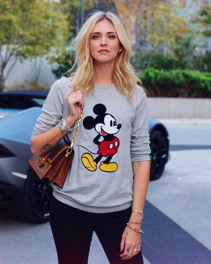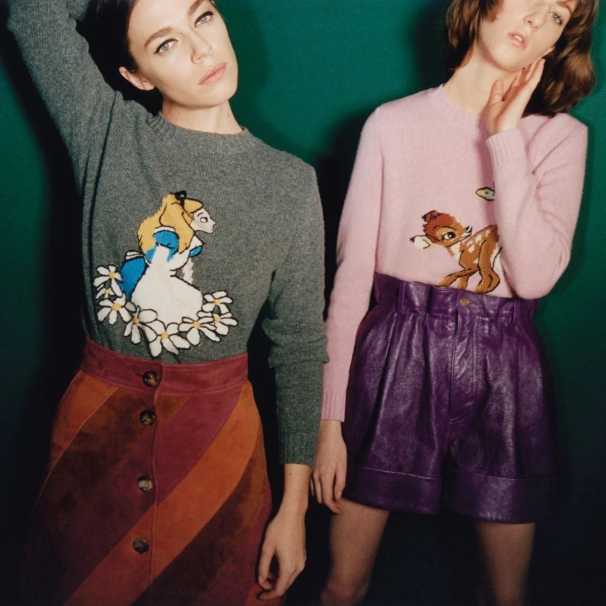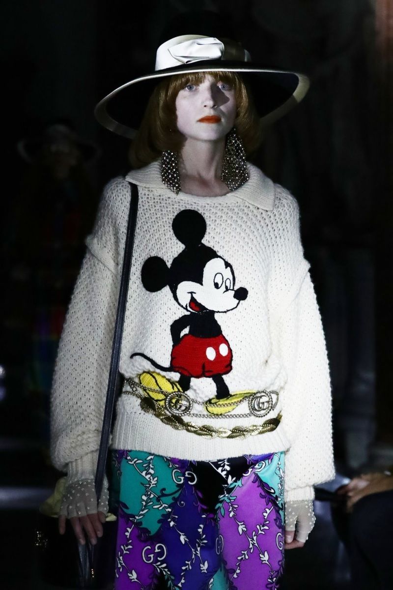 For Burberry's SS19, Riccardo Tisci winked at the classic Bambi T-shirt with the words "Why Did They Kill Bambi?". But even earlier, when he was creative director of Givenchy, for SS13 he decided to pay homage to the cute fawn with a graphic that juxtaposed Bambi with the image of a naked woman. The result? The T-shirt went viral and was worn by many celebrities such as fashion editor Carine Roitfeld. in 2014, British designer Bobby Abley presented several looks inspired by The Little Mermaid and Aladdin at London Fashion Week; Dolce & Gabbana evoked the atmosphere of Beauty and the Beast in FW16; The Blonds dedicated SS19 to Disney villains like Cruella De Vil and Ursula; and Moschino referenced Cinderella and Snow White in FW16. Even Alessandro Michele celebrated Disney characters several times during his time at Gucci, from Donald Duck to Snow White to Mickey Mouse. Remember the bag with the perfectly recreated head of Mickey Mouse designed for SS19? There are many fashion tributes to Disney's iconic character that have been seen on several catwalks in recent years, adorning T-shirts, dresses and accessories from brands such as Marc Jacobs, Jeremy Scott, Iceberg and Opening Ceremony.