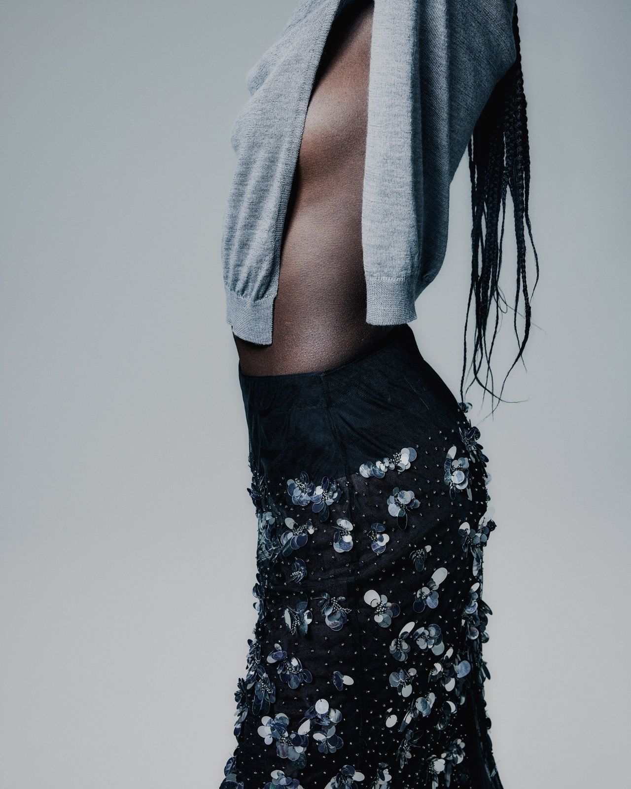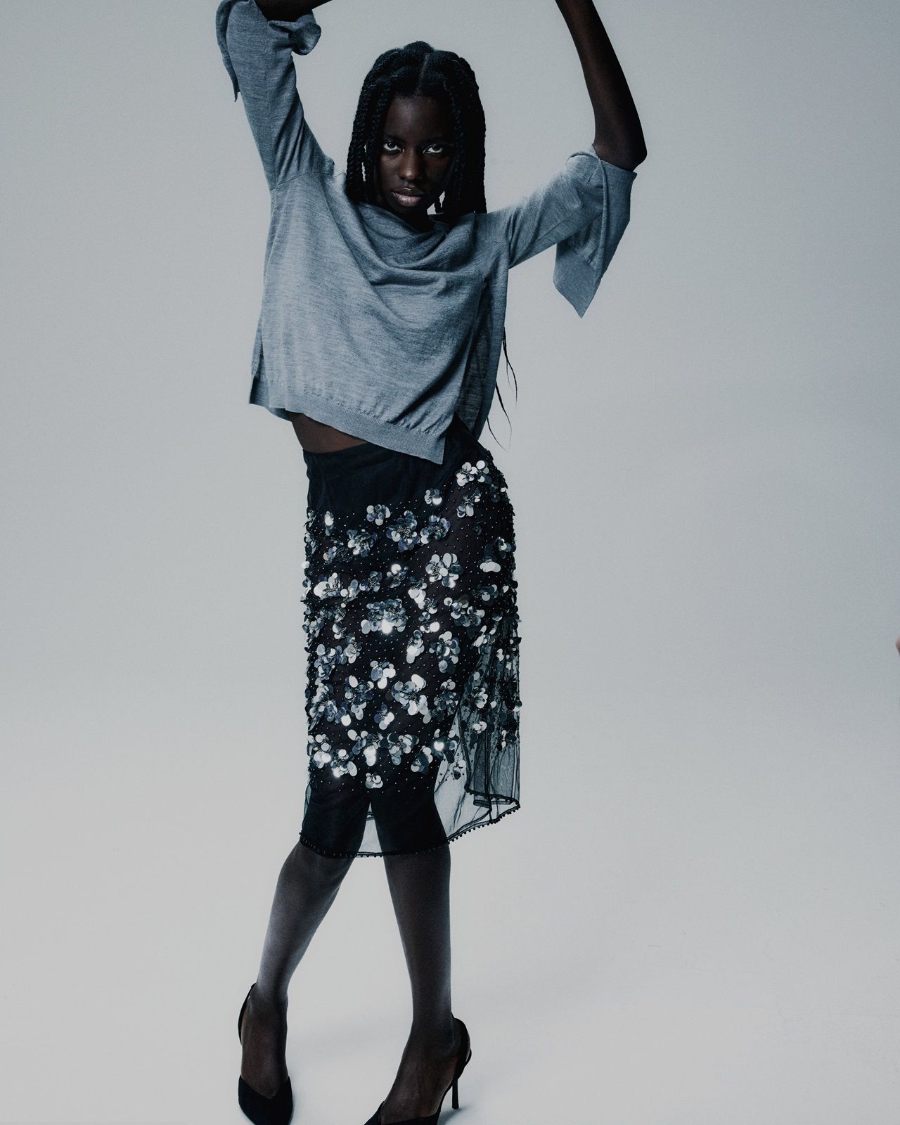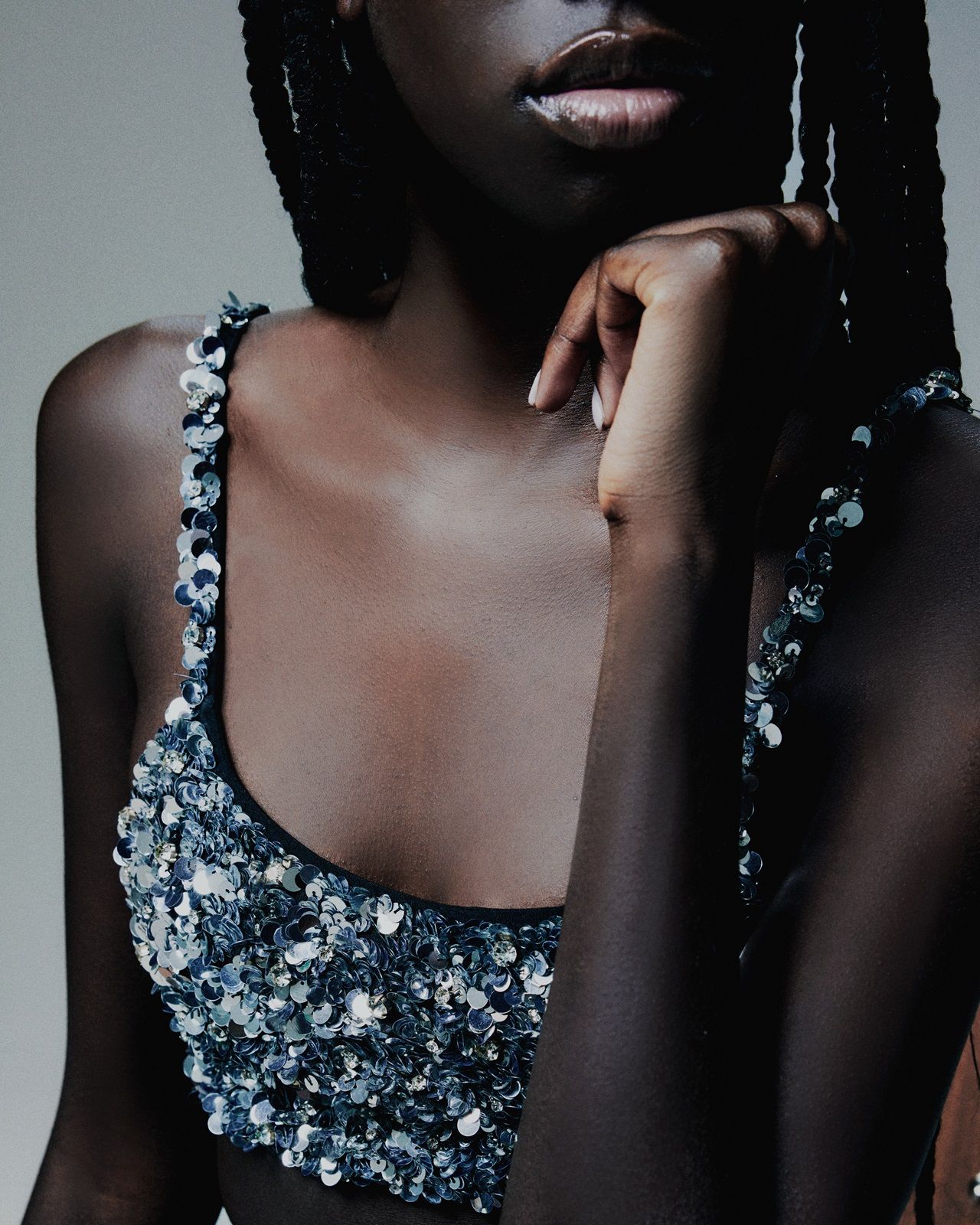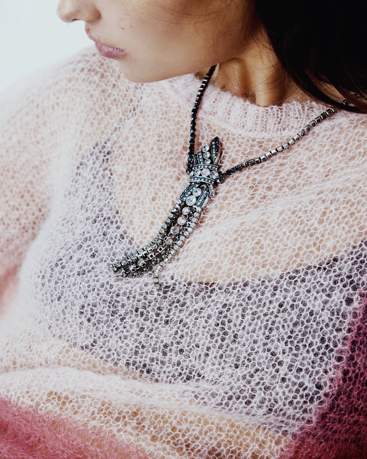 Drapes. Geometric shapes. Degradé effects. Fringes. Knots. Embroidery and graphics. They are all distinctive elements that make up the heart and soul of the Vionnet esthetic and are brought back to life in Vivid Memories of the Future. The novelty? The sparkle of sequins and crystals that catch the light and create volume and movement in garments with an essential silhouette such as the Jerry shorts, the Tom bralette, the Tobias midi skirt and the Blake midi dress, which are also made special by a range of materials hand-embroidered on black tulle. Asymmetric silhouettes, side knots and draping characterize tops and sweaters, but also the Dennis kaftan in silver lurex. Dynamism, movement and a soft fit make the capsule's garments refined and comfortable, but always with a special twist such as the fringes of the Arthur dress or the tricolor mohair inlay of the Bob sweater, a reference to the creative partnership between Madeleine Vionnet and the artist Thayaht, who introduced dynamic geometries and dégradé colors into the textile decoration. The collection is completed by the jewelry, the shiny Noah earrings and the Kai necklace, which embody the elegance and spirit of the Roaring Twenties with their sparkling silver-look gemstones.