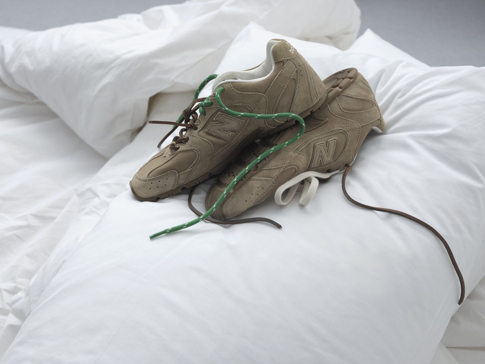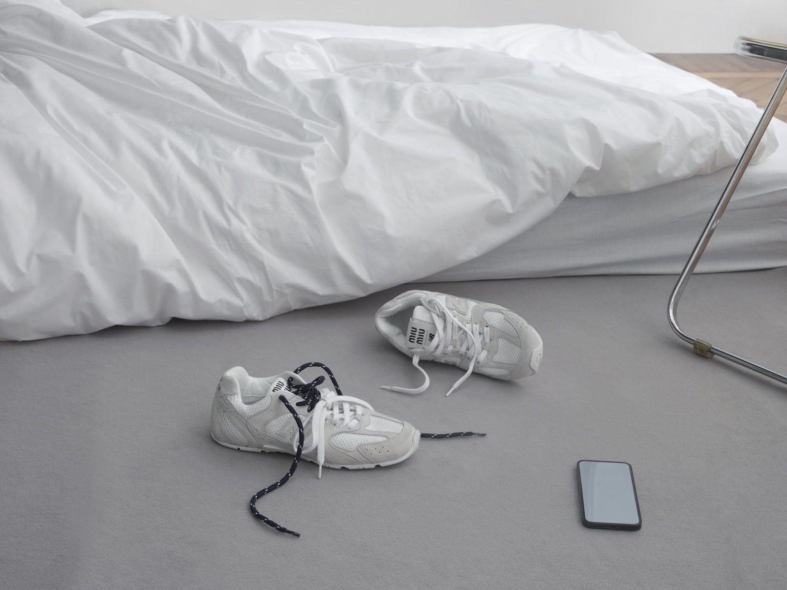 The arrival of the 530 SL New Balance x Miu Miu in stores is accompanied by an advertising campaign photographed by Alessandro Furchino Capria and styled by Lotta Volkova. In front of the photographer's lens are Peris Adolwi, Julie Hoomans and Florine Wildeboer, portrayed in an intimate, private setting with white walls and crumpled sheets. The mood is relaxed and playful, as if these are stolen moments in which the viewer can revisit or reflect on their own thoughts, encouraging free self-expression. Just as Miu Miu always does. Also in the new collaboration with New Balance.