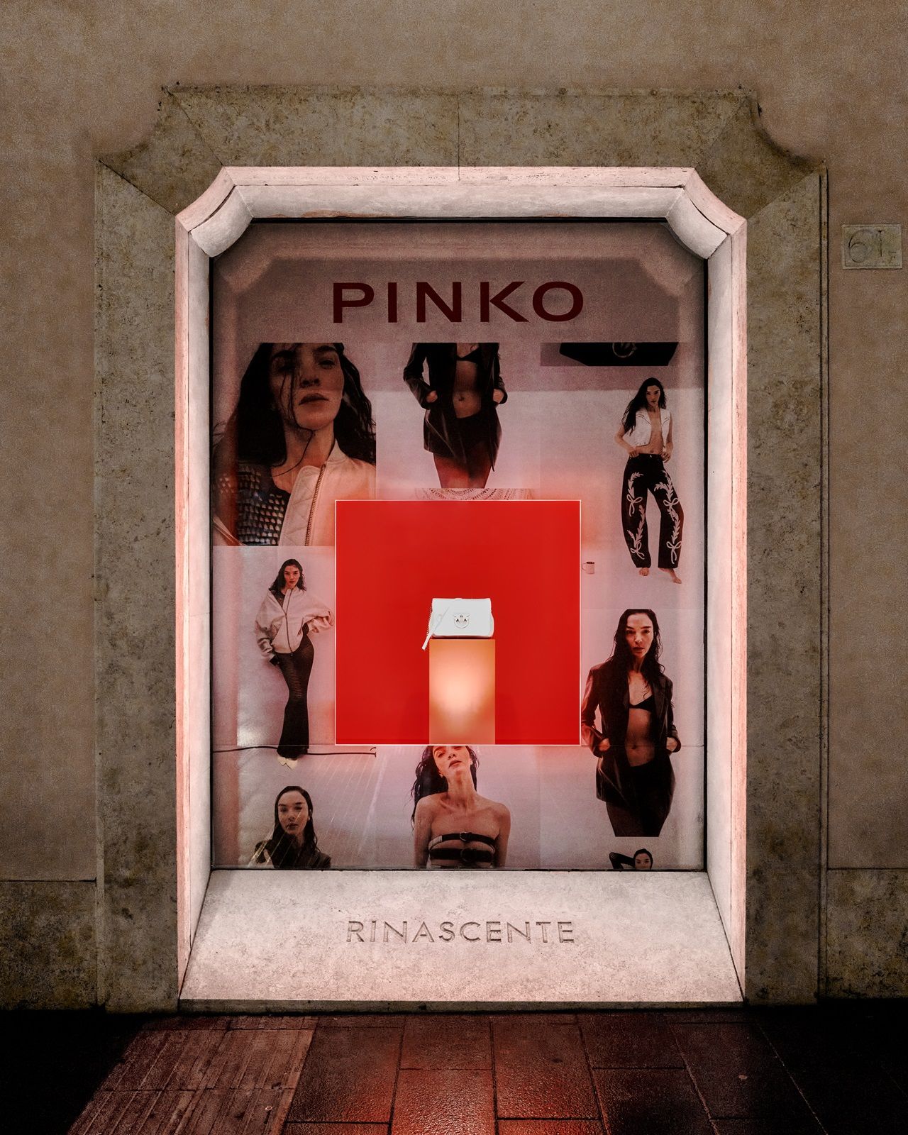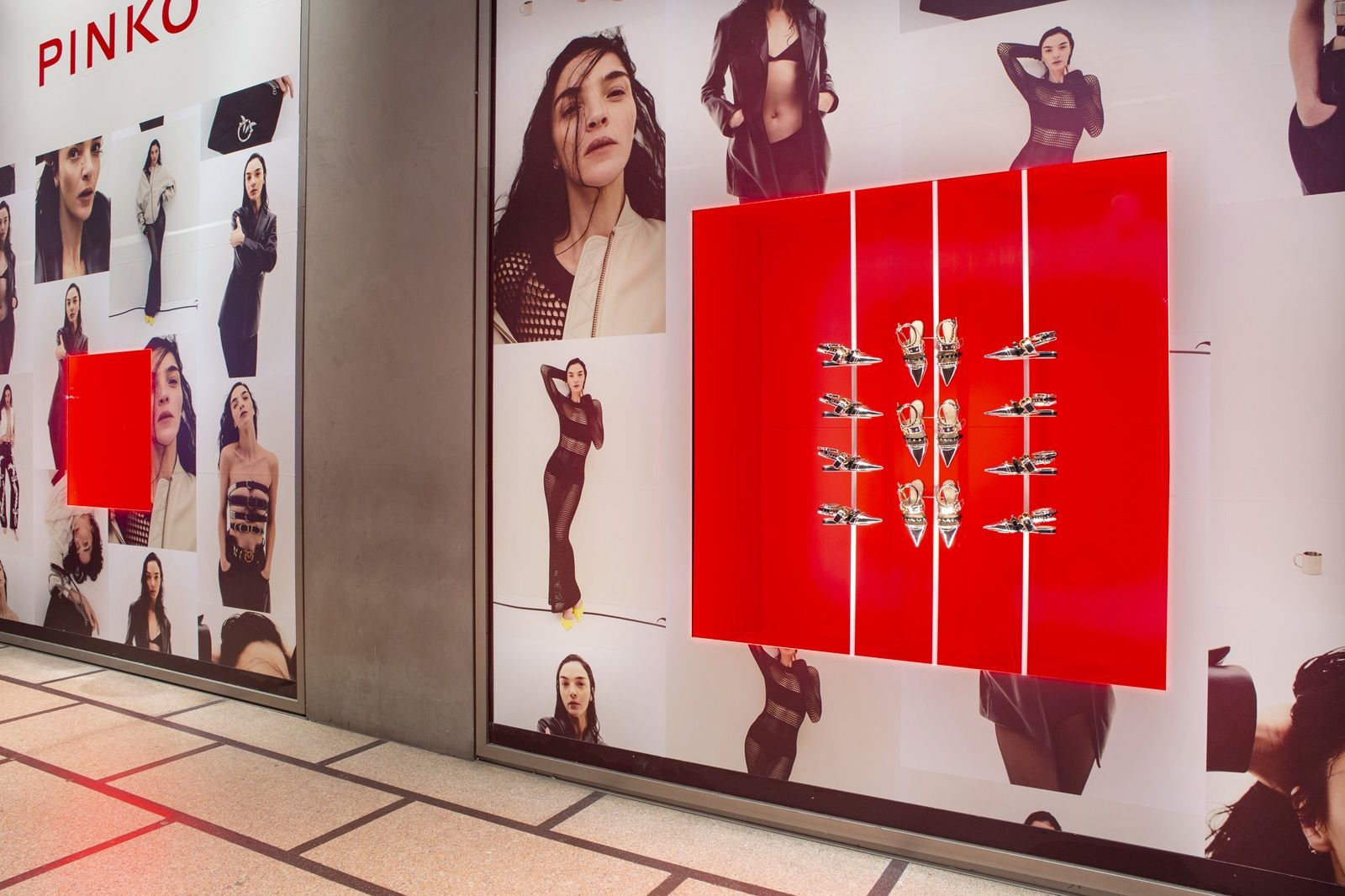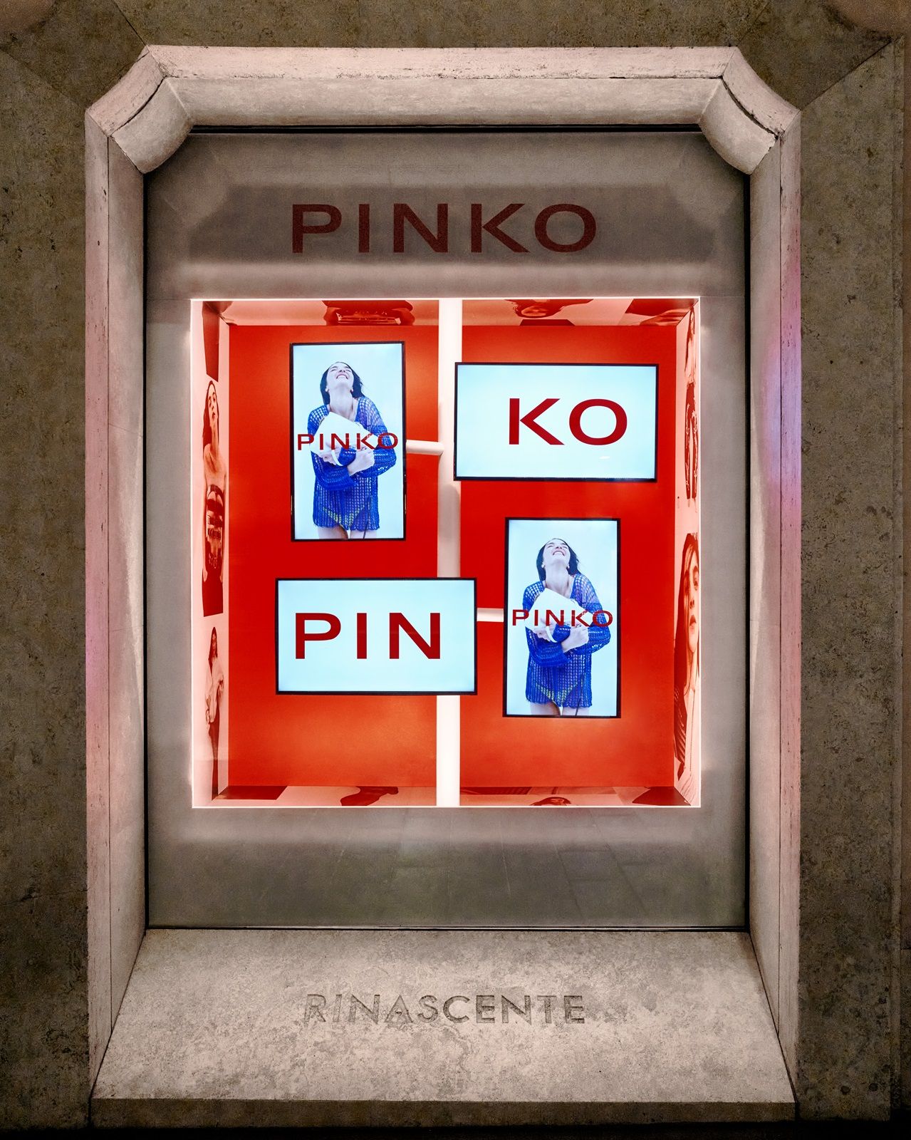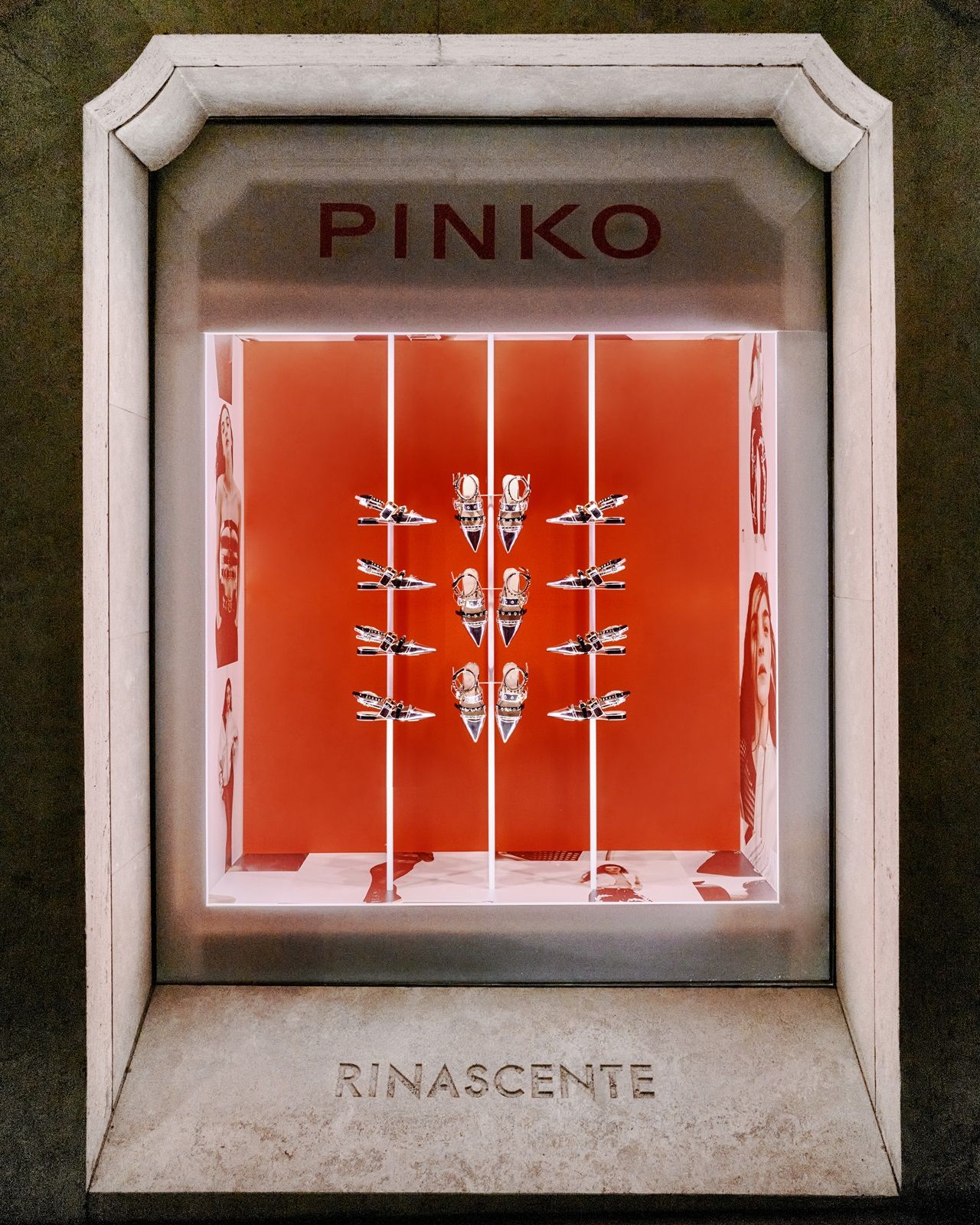 The Pazzesco Pinko signature look at Rinascente in Piazza Duomo in Milan and Via del Tritone in Rome doesn't stop at the windows or entrance doors, but also adds a touch of 90s glam to the escalators and elevators, as well as the 4th floor, which has been transformed into a pop-up store entirely dedicated to shoes. Here, visitors can experience a fascinating, temporary space that reflects Pinko's bold, sensual and never banal DNA. The plus? 15 models displayed in a metallic monolith, inviting the Pinko community to interact and share the codes of esthetic freedom and personal style.