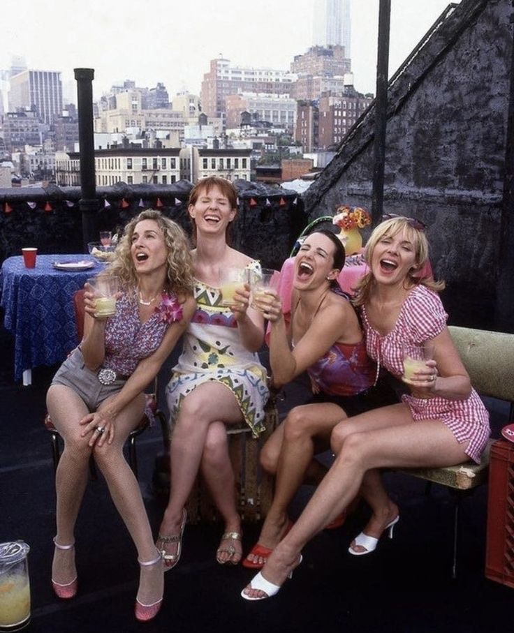 In the controversial episode 18 of season 3 of Sex and the City, after insults, throwing a bucket of water, and various offenses to sex workers that she could hear on the street outside her apartment, Samantha throws a party on the terrace as a way to correct her mistakes. While the ladies drink Flirtinies, made by Destiny, they also share some great summer fashion ideas. While Miranda has a boho dress, Charlotte has a floral spaghetti tee and black shorts. As for Samantha, she's wearing a gingham set. And Carrie, a gray mini shorts with a black belt with a diamond-like detail in the middle, a multi-colored polka-dot top and a floral pin.