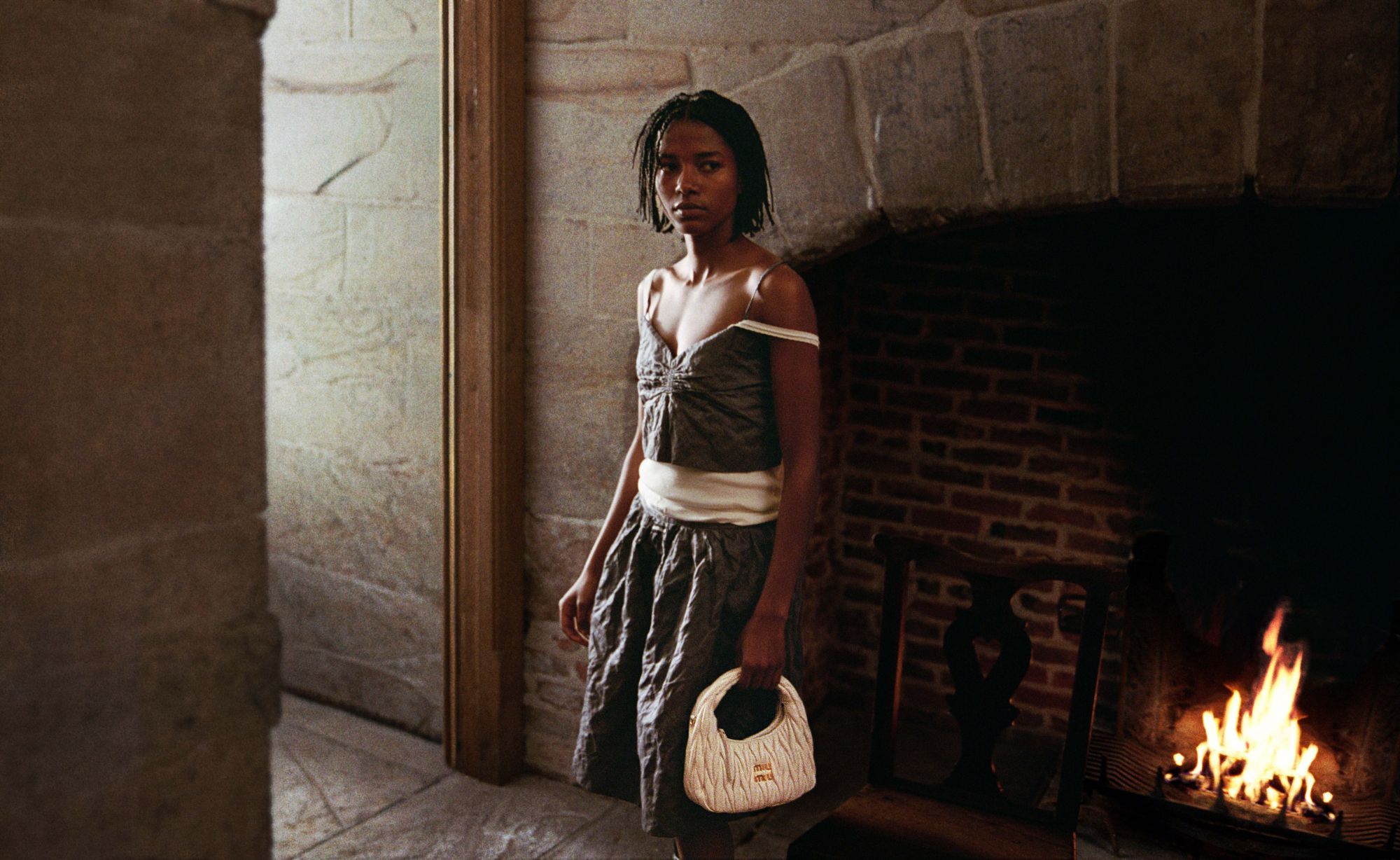 Captured on a Super 8 camera and photographed on film, the campaign upholds an authentic and tactile aesthetic. Ancient brick work and scarred stones evoke a marked and emotionally resonant contrast between the antique, in places ruined, splendor of the surroundings and the youth and pristine beauty of those who inhabit it. Here is a family mansion, revealed in its purest form, one that exists as a permanent expression of the majesty of time passing. The contrasts that lie at the core of the Miu Miu name are integral: the effortless elegance and high spirits of the young women interacting are set against the stately grandeur of a monolithic stone fireplace: their attitude is as strikingly at odds with this backdrop as it is natural and spontaneous.