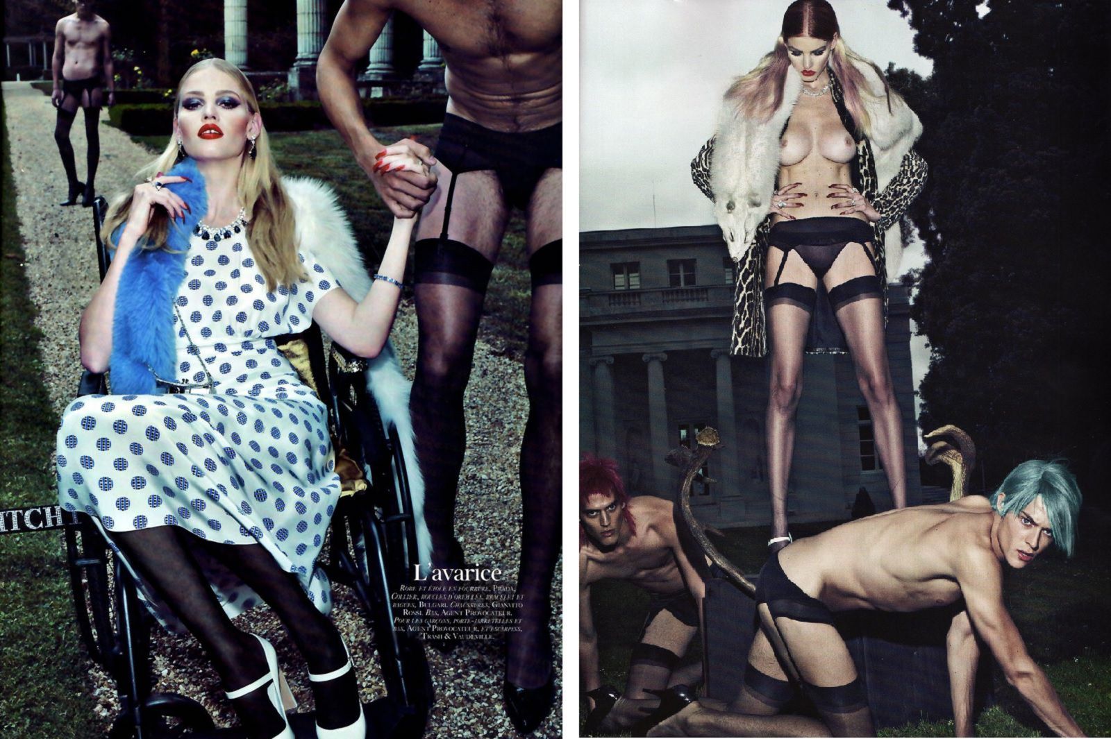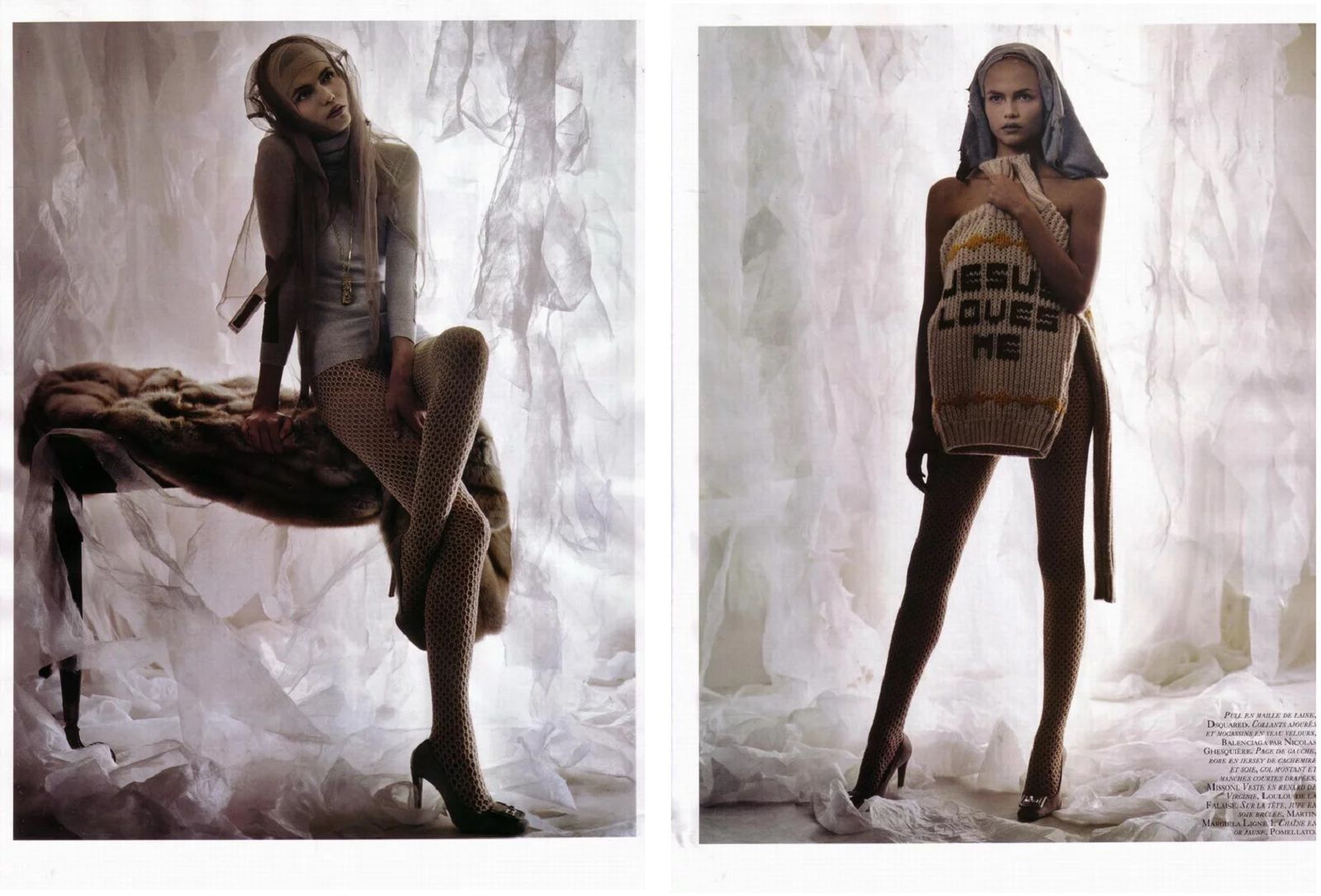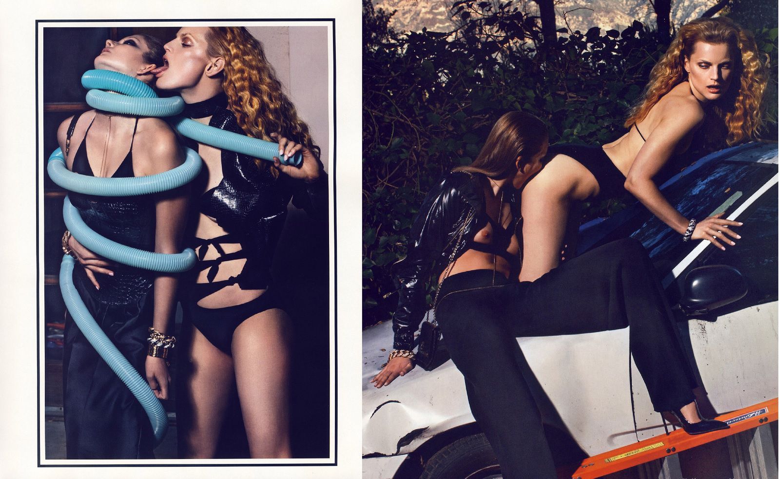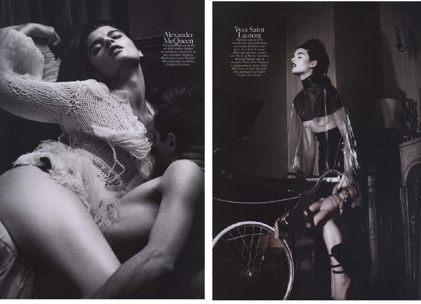 Carine's provocative editorials, always at the limit, have led to a new way of conceiving the image in fashion magazines. Her aesthetic is deeply connected with that of Helmut Newton, with his seminal black and white portraits of independent and dominant women. With her photo shoots, Roitfeld has staged funny, perverse sex, sadomasochistic, transvestism, self-mutilation, blood, slaughtered animals, satanism, selfless motherhood and much more. Unforgettable are the shots of Eva Herzigova in a butchery version for The Face magazine of 1997, as well as Raquel Zimmermann dressed in fur that shows the middle finger to environmentalists, Eniko Mihalik, naked, with the wrinkled and stained arms of an elderly woman, or Lara Stone (one of Carine's favorite models) in a controversial blackface version.