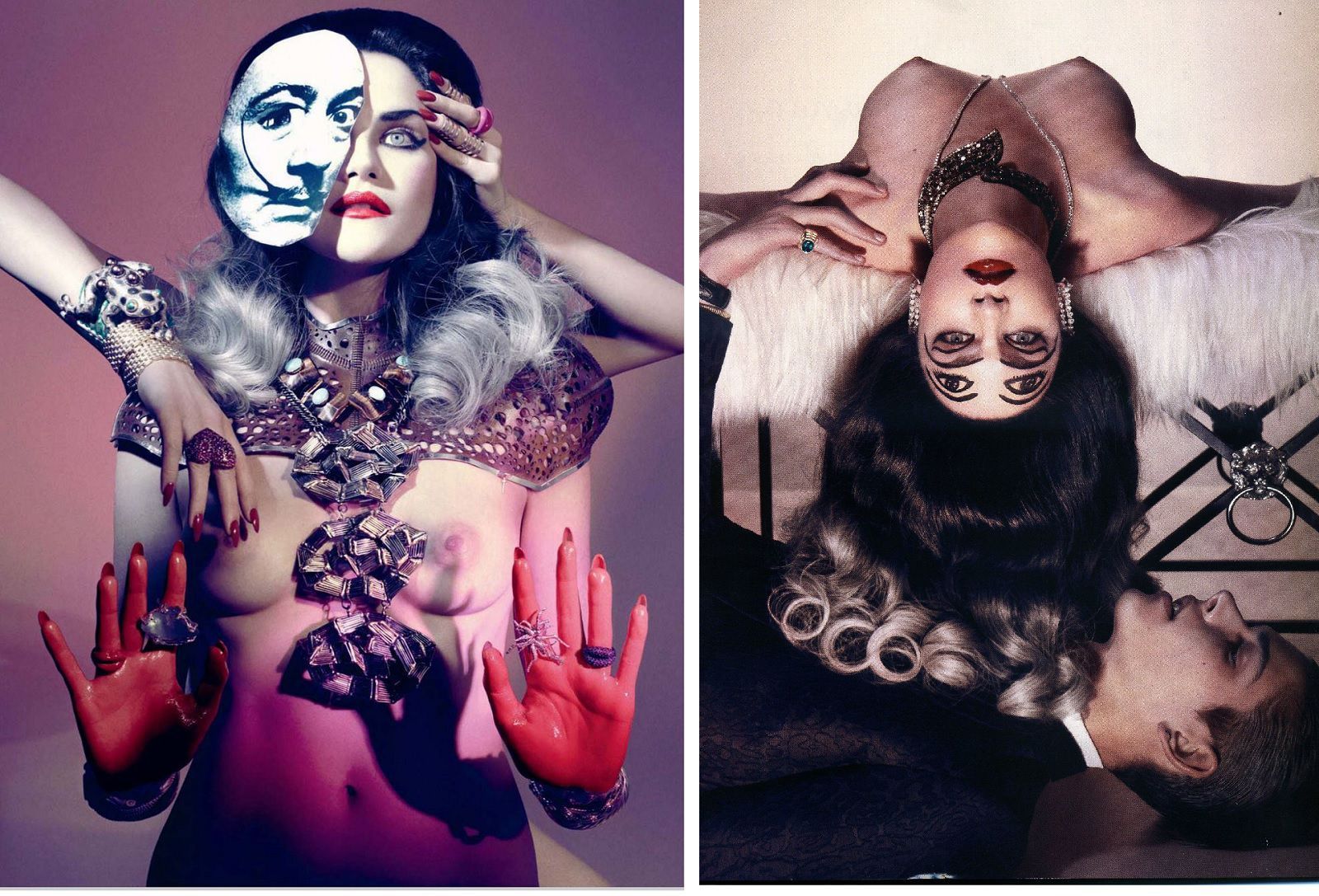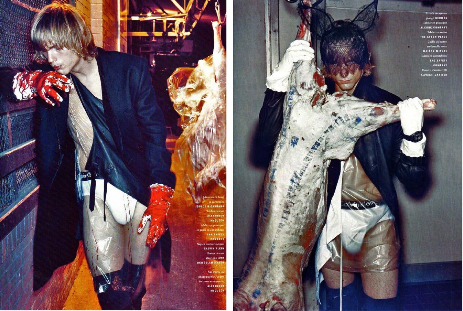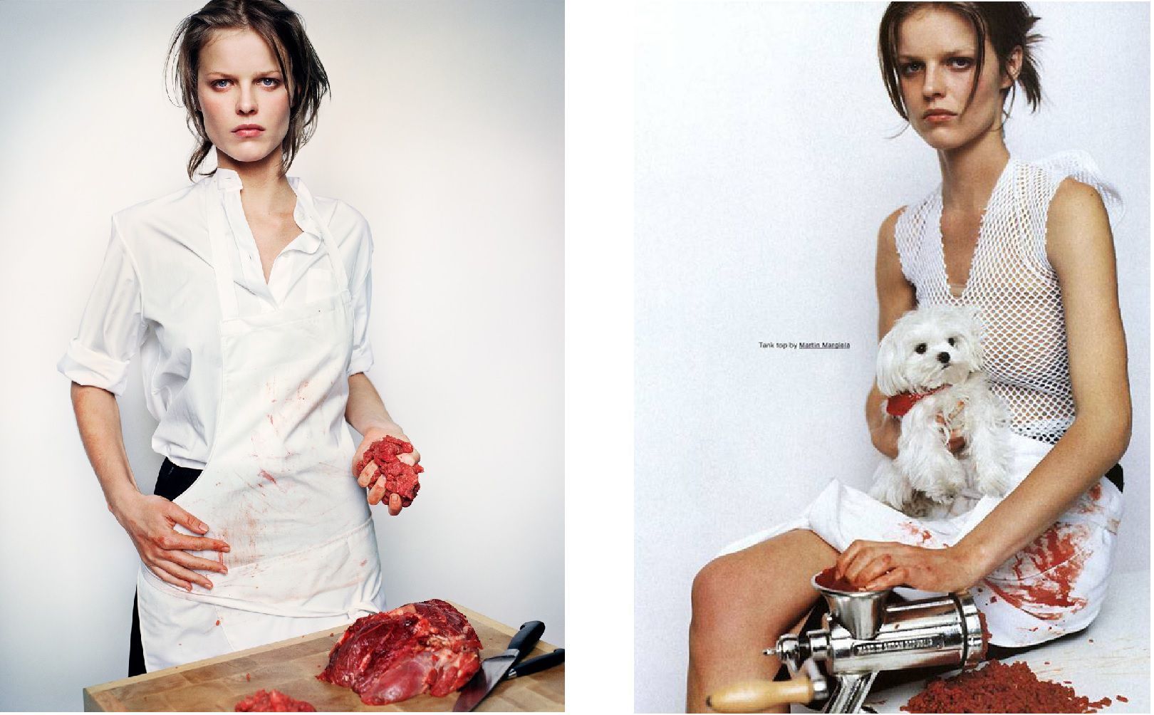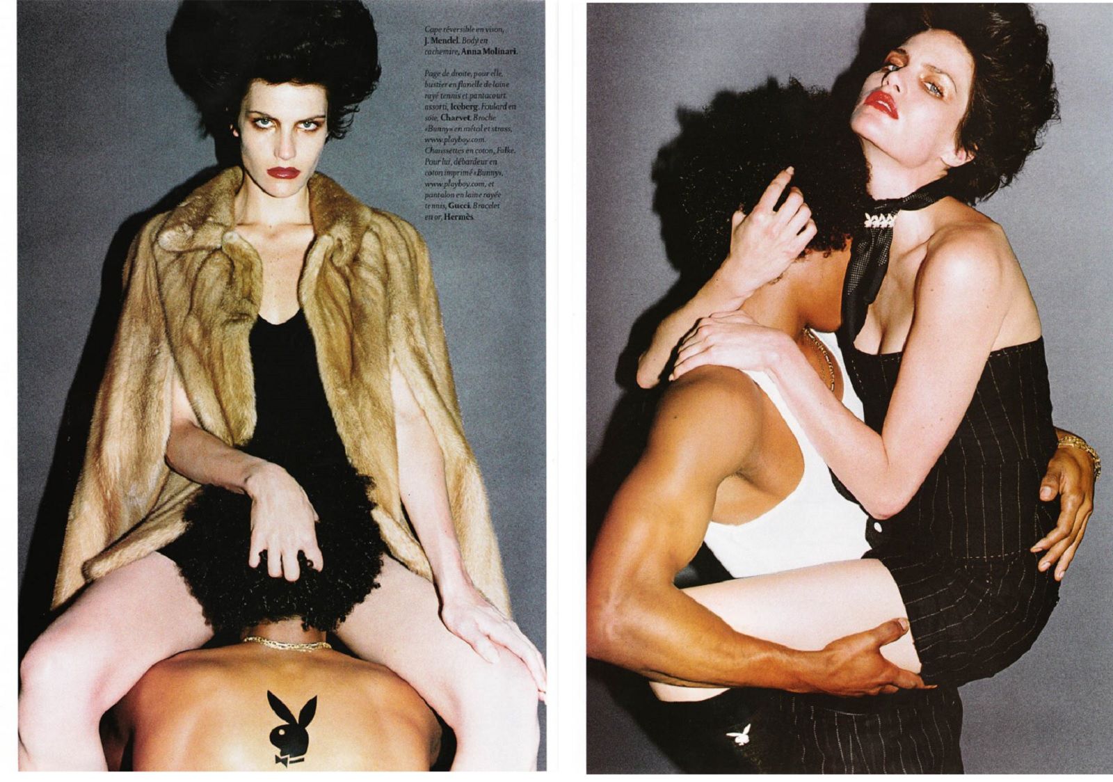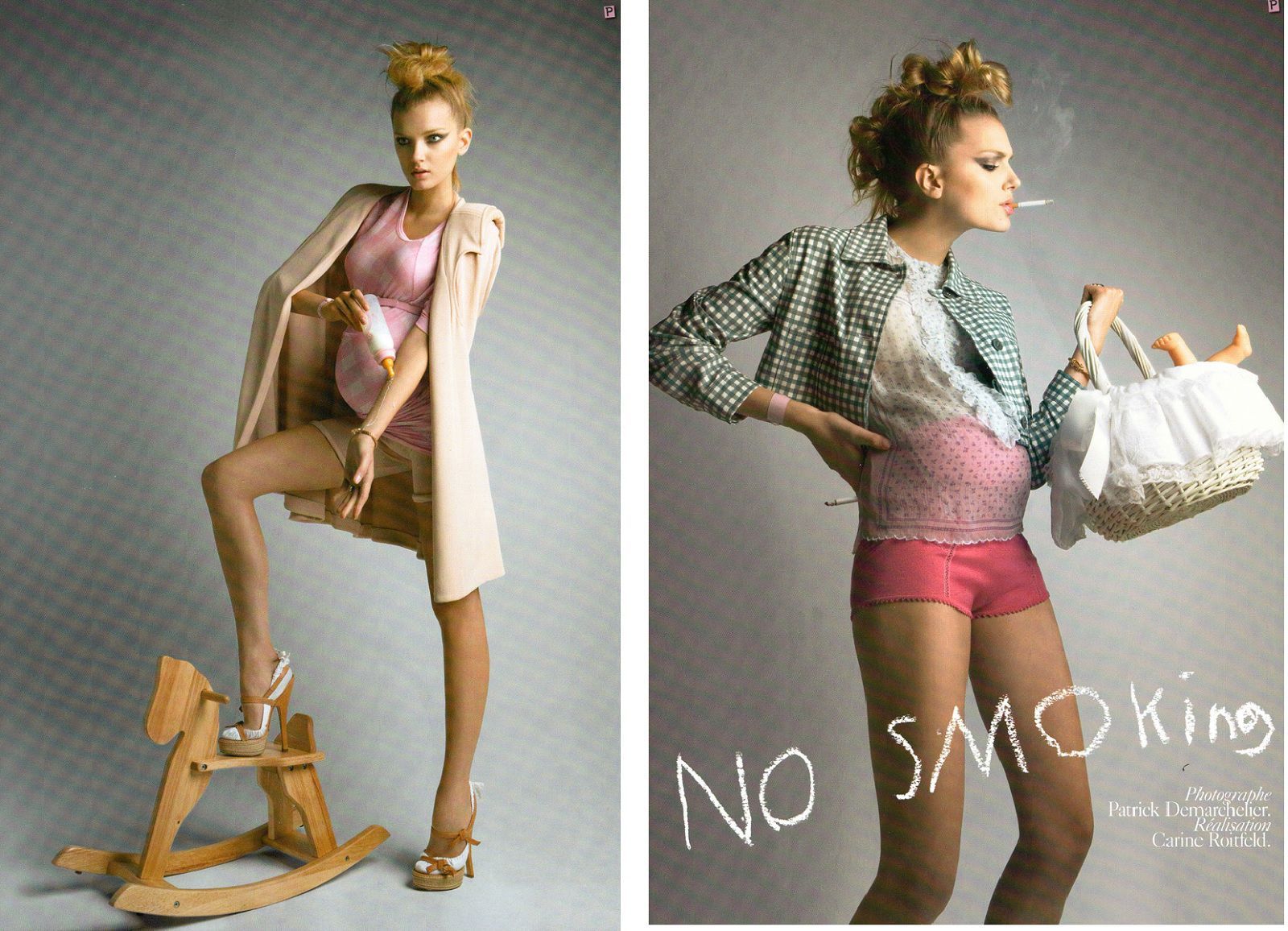 Carine's provocative editorials, always at the limit, have led to a new way of conceiving the image in fashion magazines. Her aesthetic is deeply connected with that of Helmut Newton, with his seminal black and white portraits of independent and dominant women. With her photo shoots, Roitfeld has staged funny, perverse sex, sadomasochistic, transvestism, self-mutilation, blood, slaughtered animals, satanism, selfless motherhood and much more. Unforgettable are the shots of Eva Herzigova in a butchery version for The Face magazine of 1997, as well as Raquel Zimmermann dressed in fur that shows the middle finger to environmentalists, Eniko Mihalik, naked, with the wrinkled and stained arms of an elderly woman, or Lara Stone (one of Carine's favorite models) in a controversial blackface version.