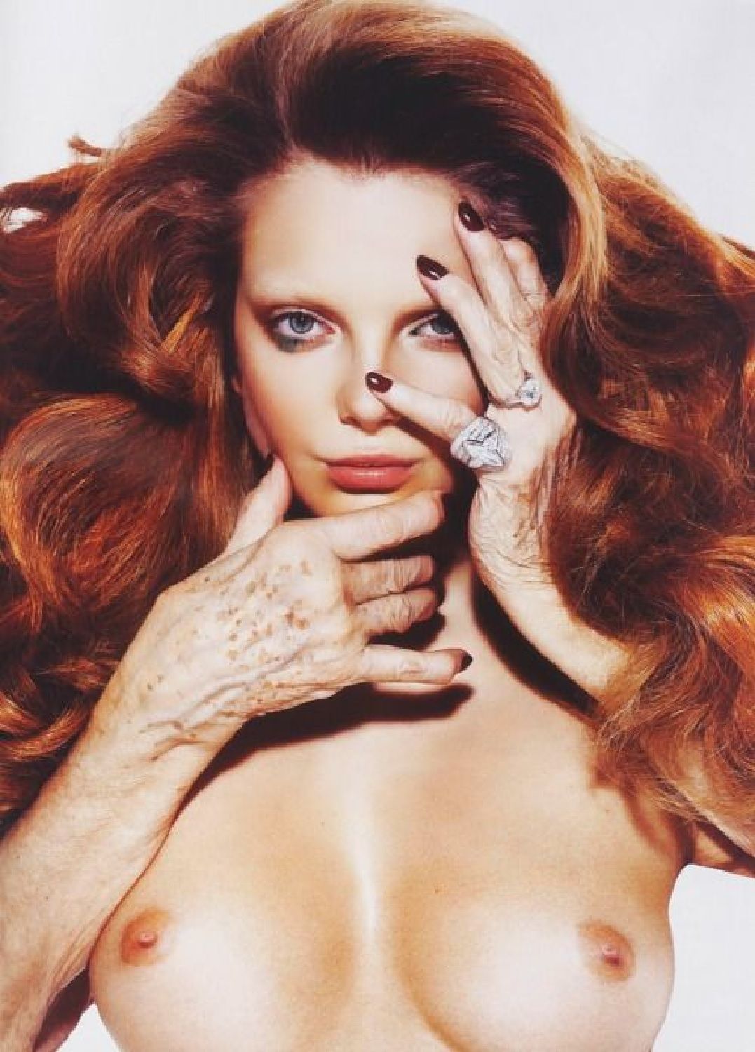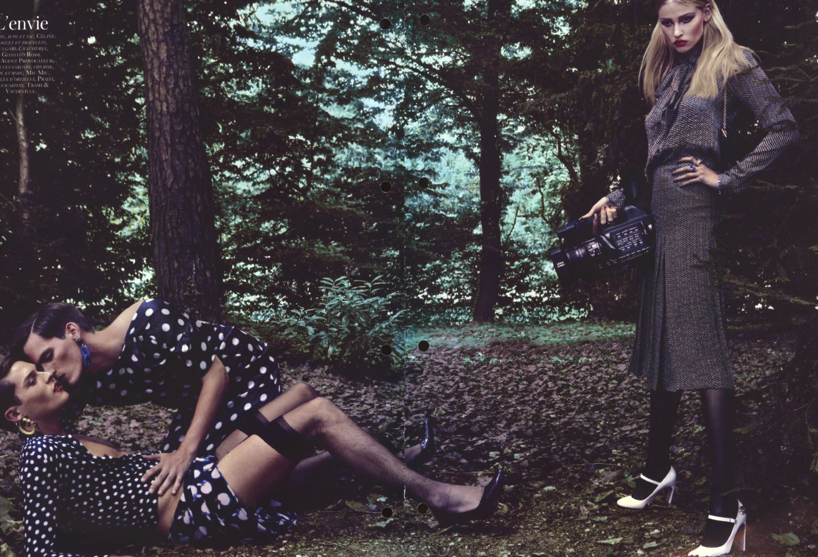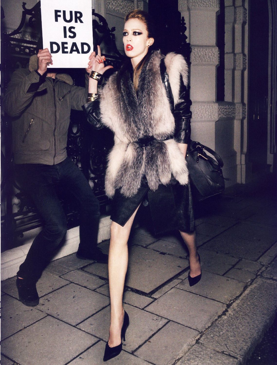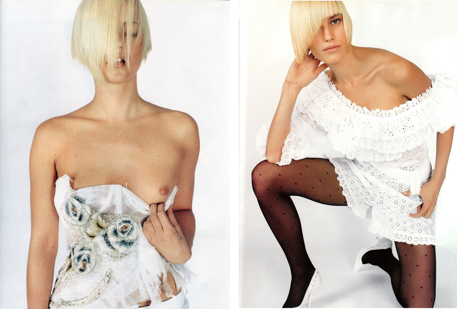 Carine's provocative editorials, always at the limit, have led to a new way of conceiving the image in fashion magazines. Her aesthetic is deeply connected with that of Helmut Newton, with his seminal black and white portraits of independent and dominant women. With her photo shoots, Roitfeld has staged funny, perverse sex, sadomasochistic, transvestism, self-mutilation, blood, slaughtered animals, satanism, selfless motherhood and much more. Unforgettable are the shots of Eva Herzigova in a butchery version for The Face magazine of 1997, as well as Raquel Zimmermann dressed in fur that shows the middle finger to environmentalists, Eniko Mihalik, naked, with the wrinkled and stained arms of an elderly woman, or Lara Stone (one of Carine's favorite models) in a controversial blackface version.