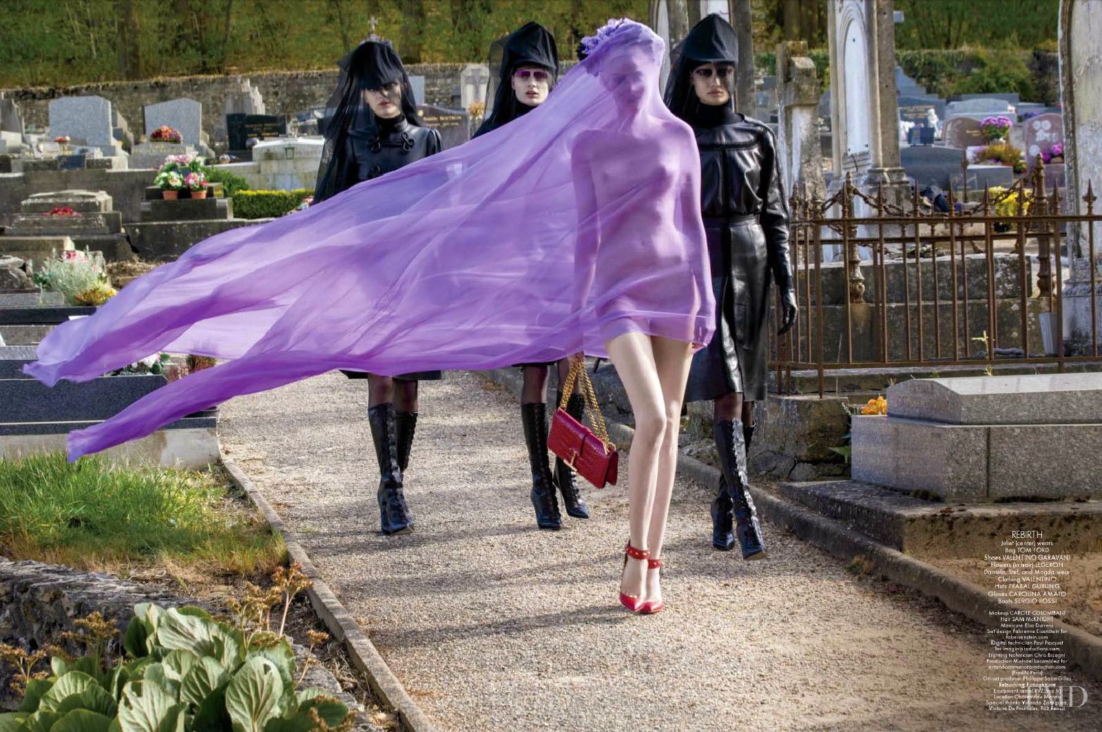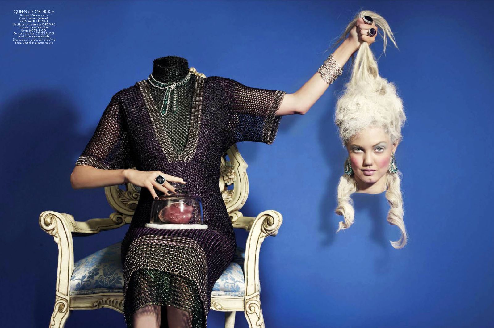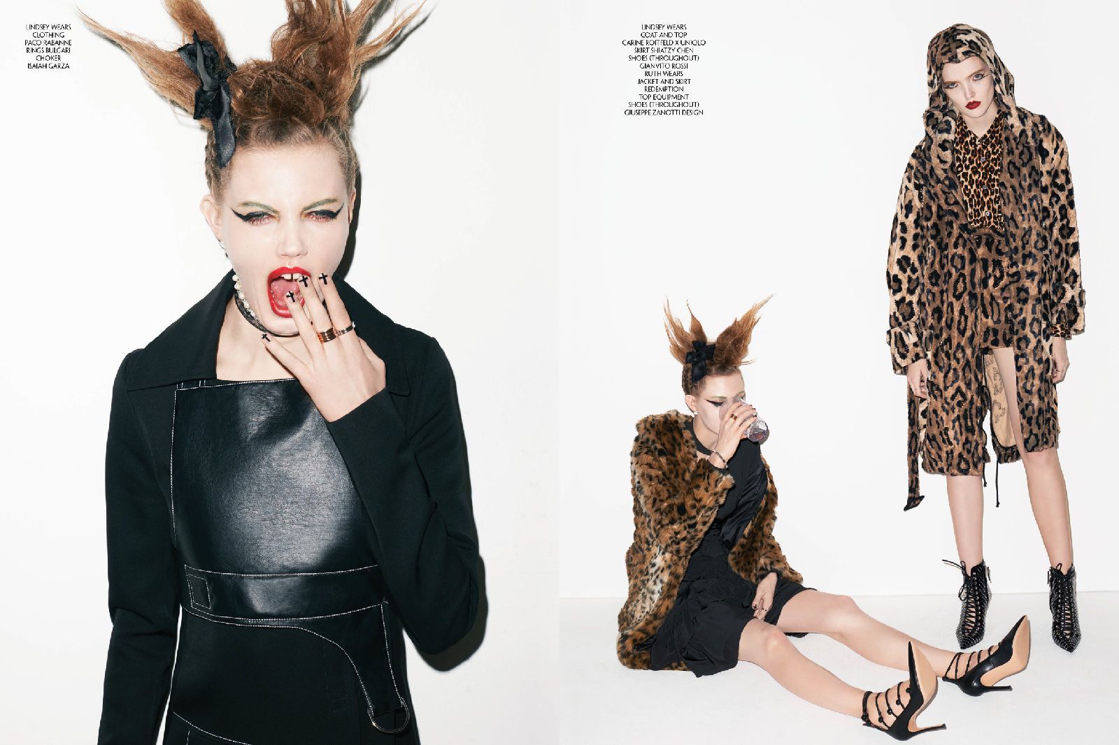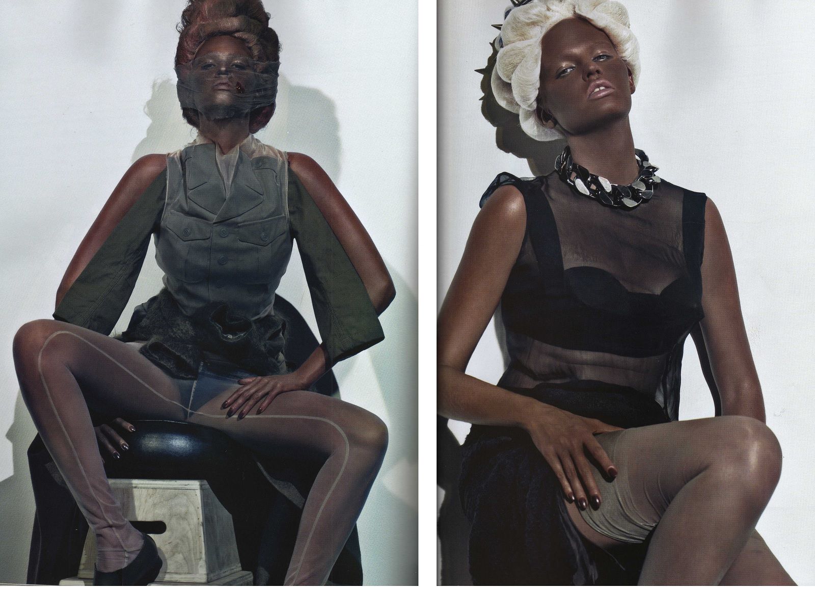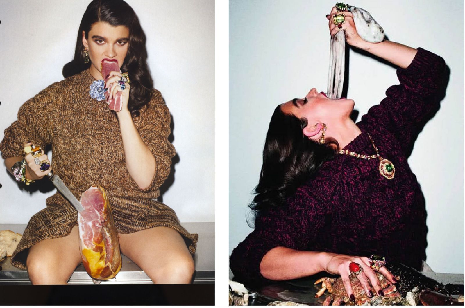 Carine's provocative editorials, always at the limit, have led to a new way of conceiving the image in fashion magazines. Her aesthetic is deeply connected with that of Helmut Newton, with his seminal black and white portraits of independent and dominant women. With her photo shoots, Roitfeld has staged funny, perverse sex, sadomasochistic, transvestism, self-mutilation, blood, slaughtered animals, satanism, selfless motherhood and much more. Unforgettable are the shots of Eva Herzigova in a butchery version for The Face magazine of 1997, as well as Raquel Zimmermann dressed in fur that shows the middle finger to environmentalists, Eniko Mihalik, naked, with the wrinkled and stained arms of an elderly woman, or Lara Stone (one of Carine's favorite models) in a controversial blackface version.