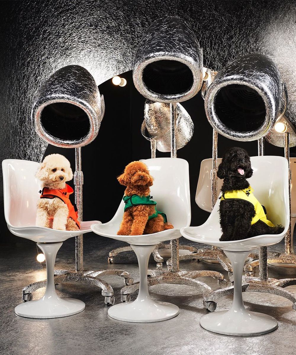 One of the last year’s most successful brands, Marine Serre, transforms its own fluid design vision into pet pieces to be worn by the most fashionable dogs out there. The iconic crescent moon of the logo gets featured on harnesses with and without pockets, collars and puffers in different sizes to promote inclusivity even in the animal world.