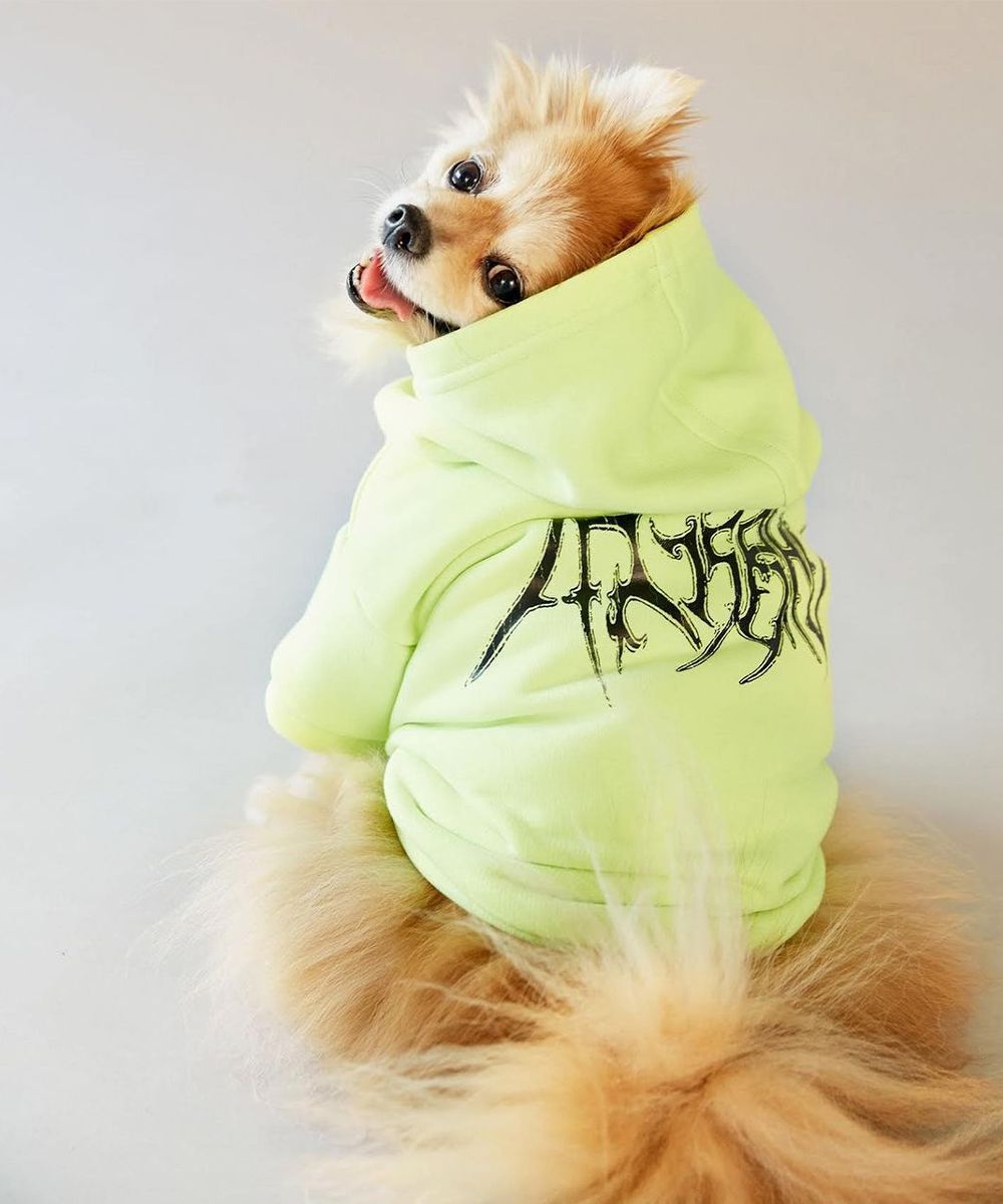 Dog-size hoodies, puffers, t-shirts and bandanas meant to be worn over studded collars decorated in monogram (in full MISBHV style) make up a collection created for tough guys as well as adorable pups who might wear it as well. Lime green Puffer Jackets that might do in a particularly dark evening, or hard rock t-shirts suitable for every Sunday morning at the park: the choice is all yours.