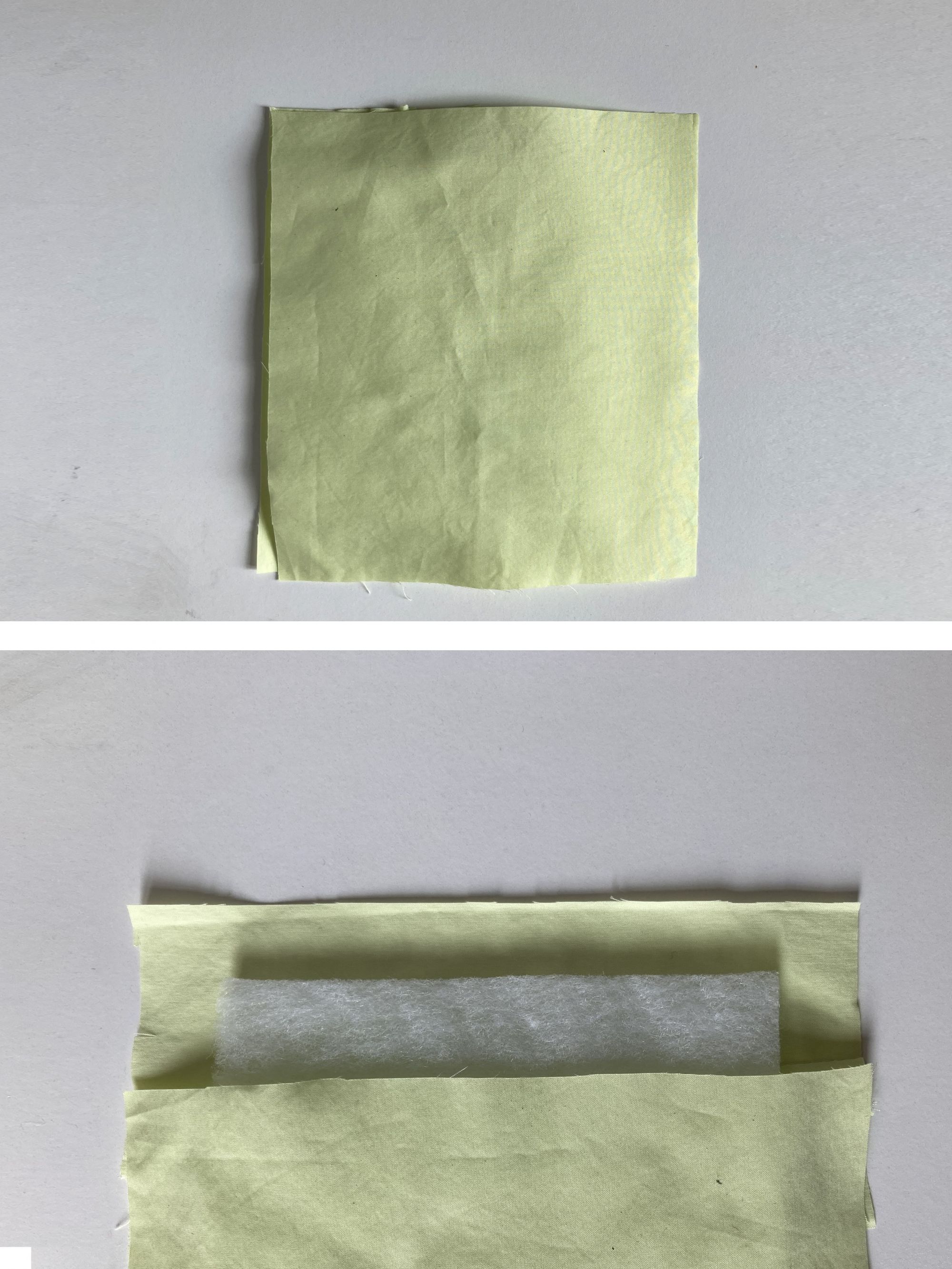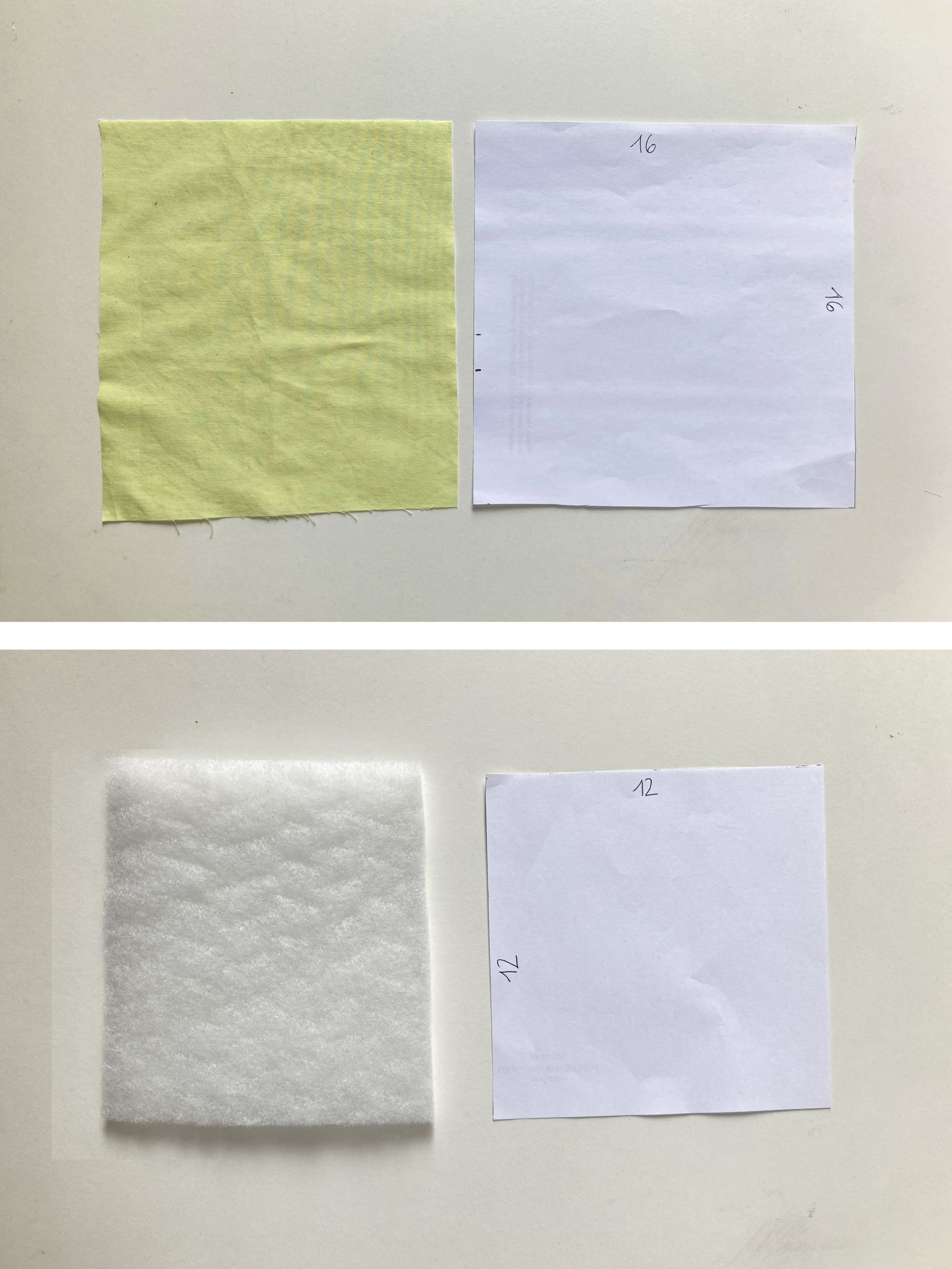 STEP 2: Take a square of fabric, put one of padding on it and then another square of fabric; you will have something like a stuffed sandwich. Secure with pins and sew all 4 sides. In the end you will need to have a total of 14 "squares".