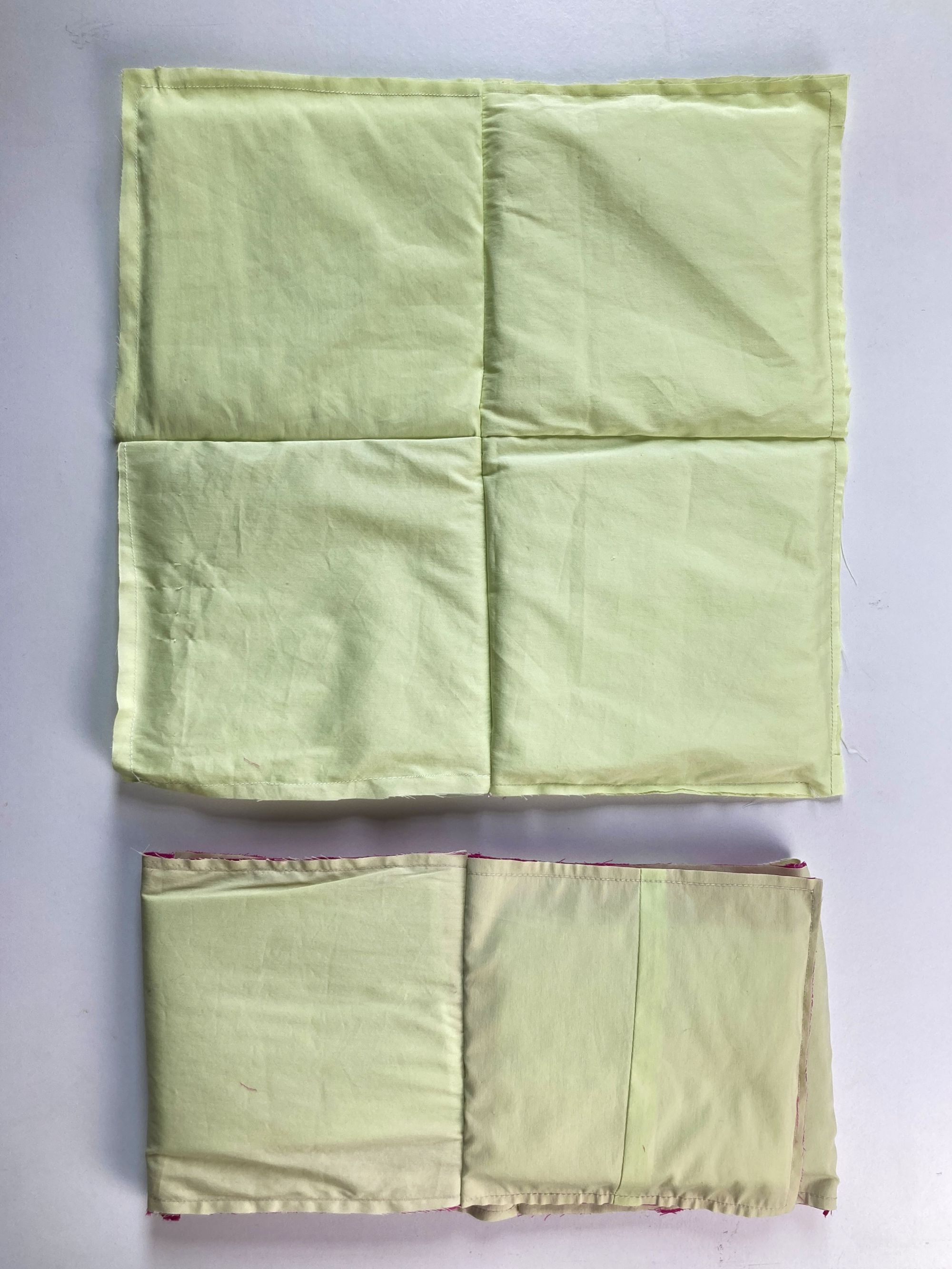 STEP 1: Take the fabric and cut 28 squares of 16cm X 16cm. Take the padding sheet and cut 14 squares of 12cm X 12cm (the measurements of both squares depend on the size of the bag you want to create).