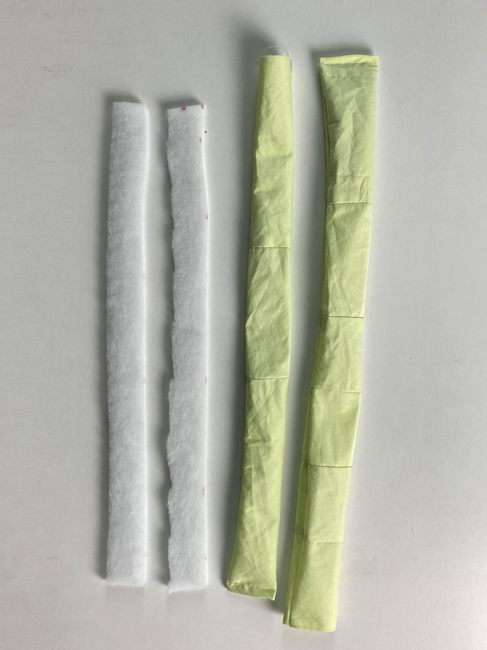 STEP 5: To create the handles, take the padding sheet and cut 2 bands of 50 cm X 3 cm, then cut 2 bands of fabric of 65 cm X 10 cm (the size of the bands will depend on the size of the handles you want to make). Fold the fabric band in half and close it with a straight seam on the long side and one short side, forming a kind of tube. Take the padding band and insert it inside the fabric tube with the help of a safety pin. Do the same with the second band. Sew the handles to the bag and put it on.