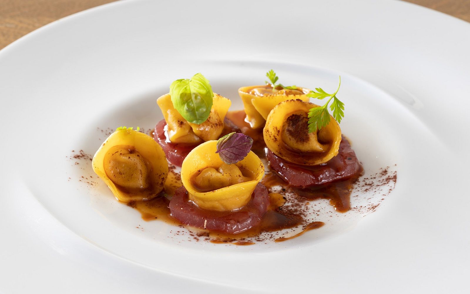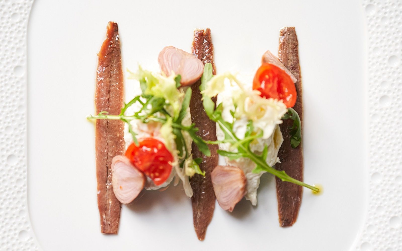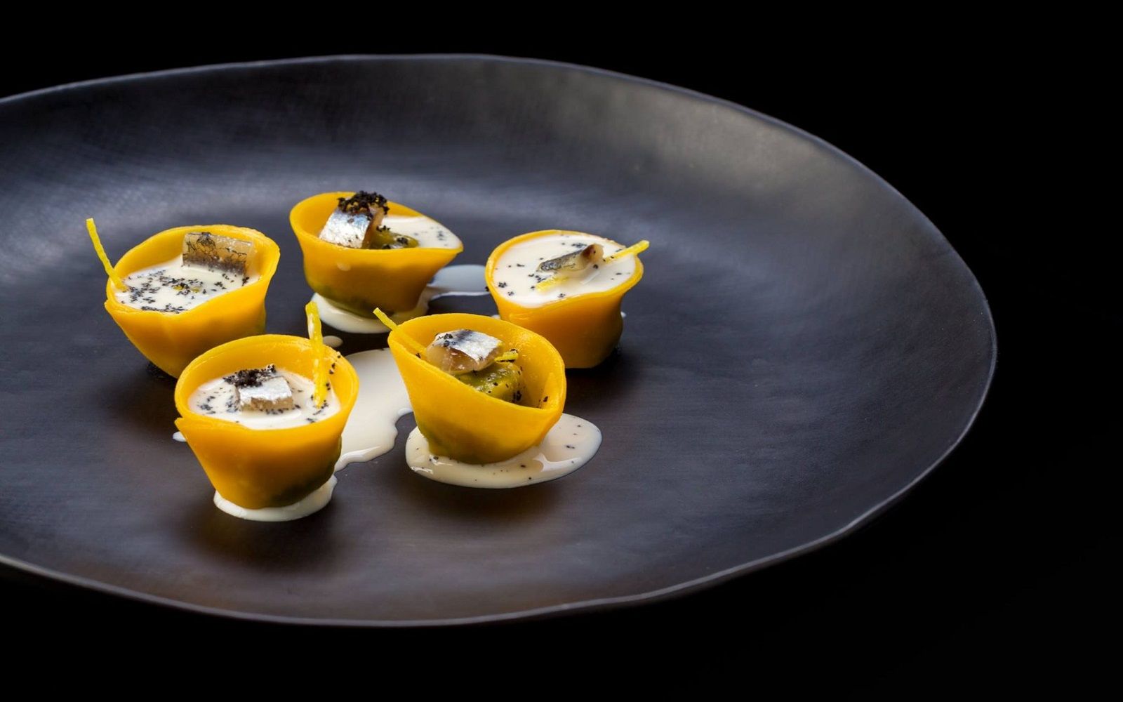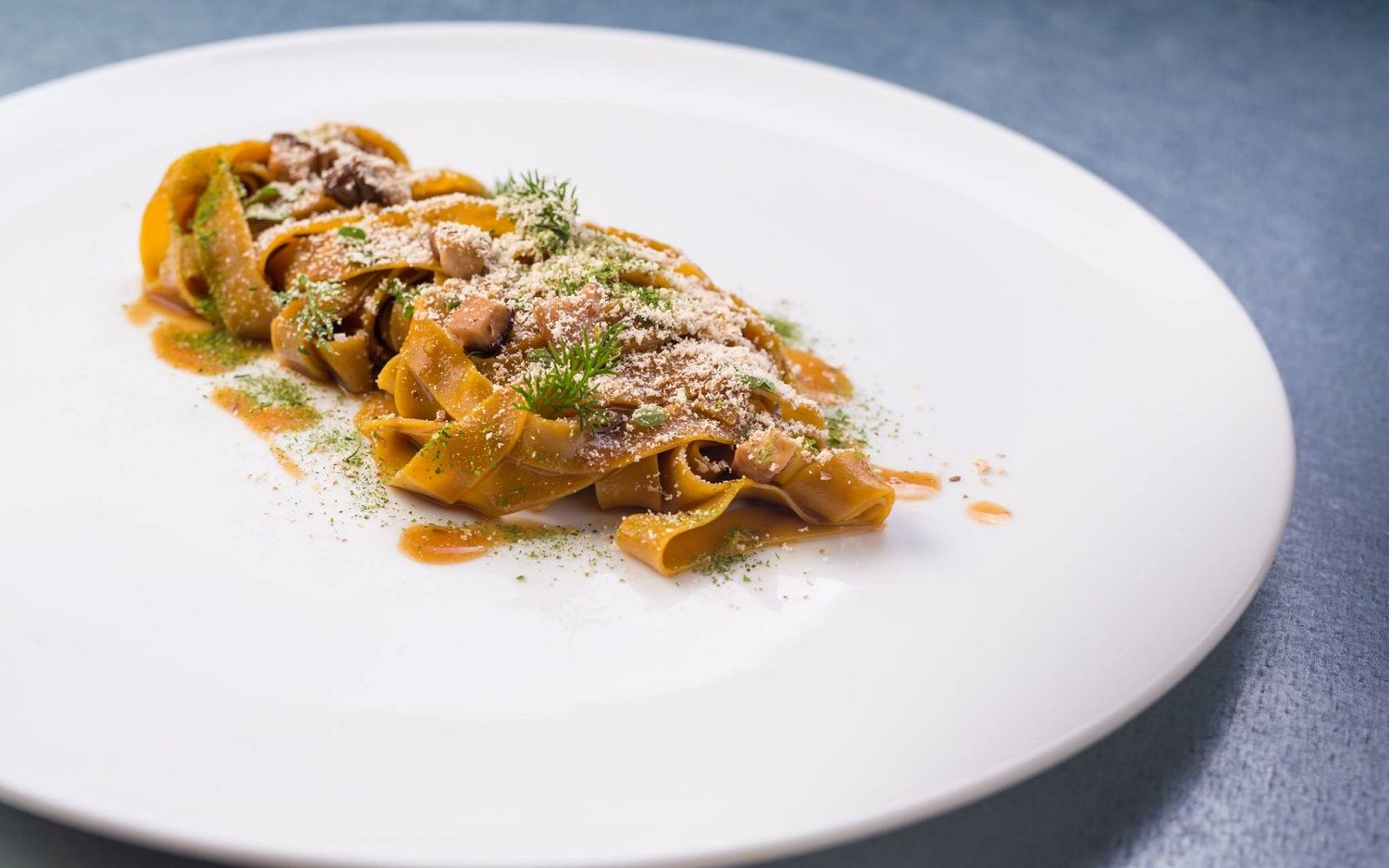 Food: Anchovies Arancino, caponata and onion compote; Pappardelle with grouper ragout, brunoise of vegetables, confit tomatoes, timpa fennel oil and scented bread; Tataki tuna, sweet and sour wakame seaweed and sesame wafer