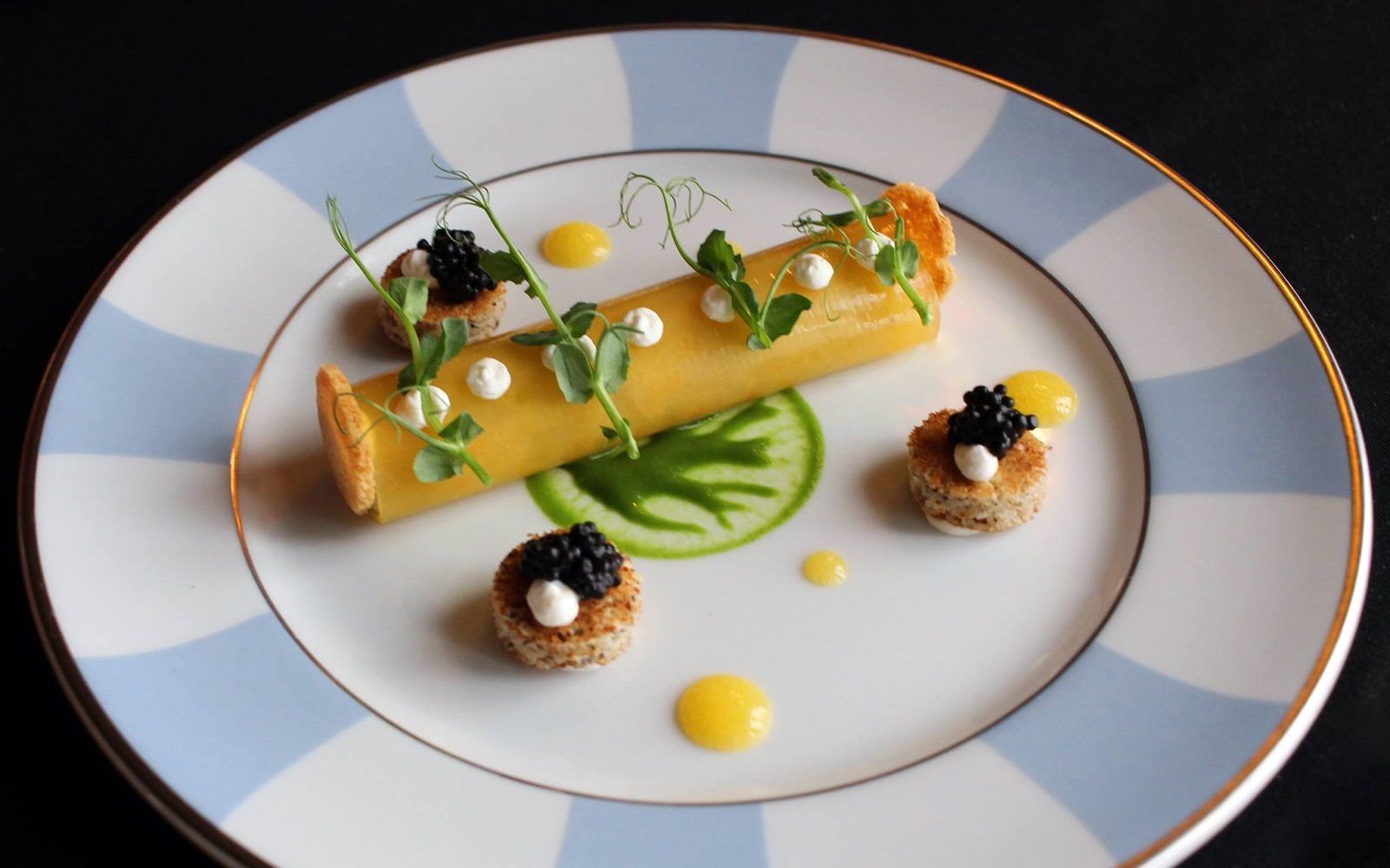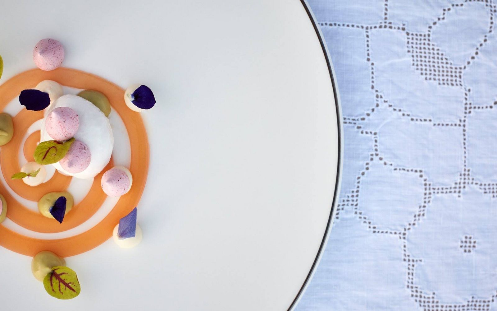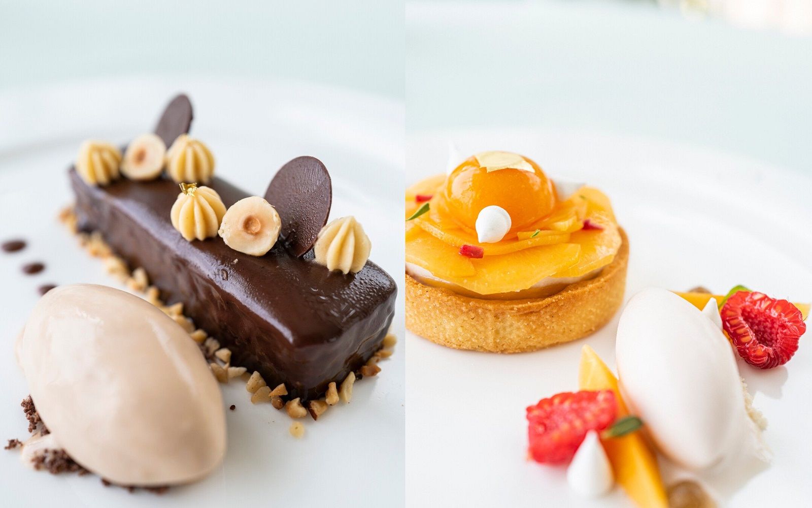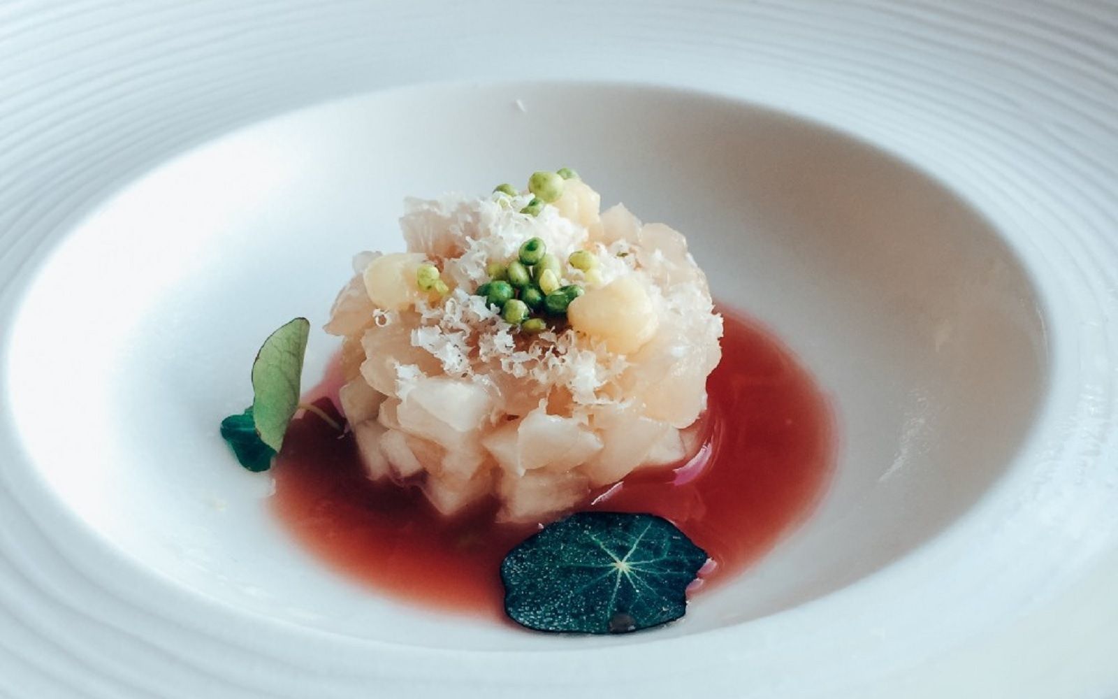 Food: Seared scallops with spring onion cream and black sesame; Cavatelli cacio e pepe with marinated red shrimp and baby squid; Almond sphere with apricot and ginger sorbet