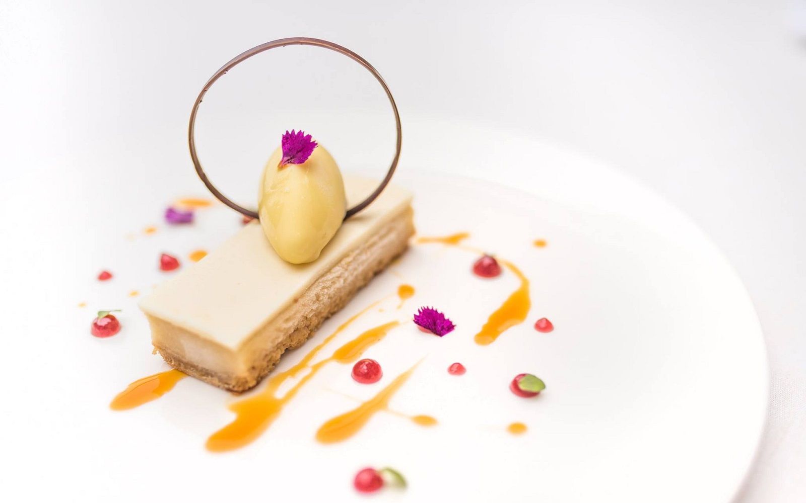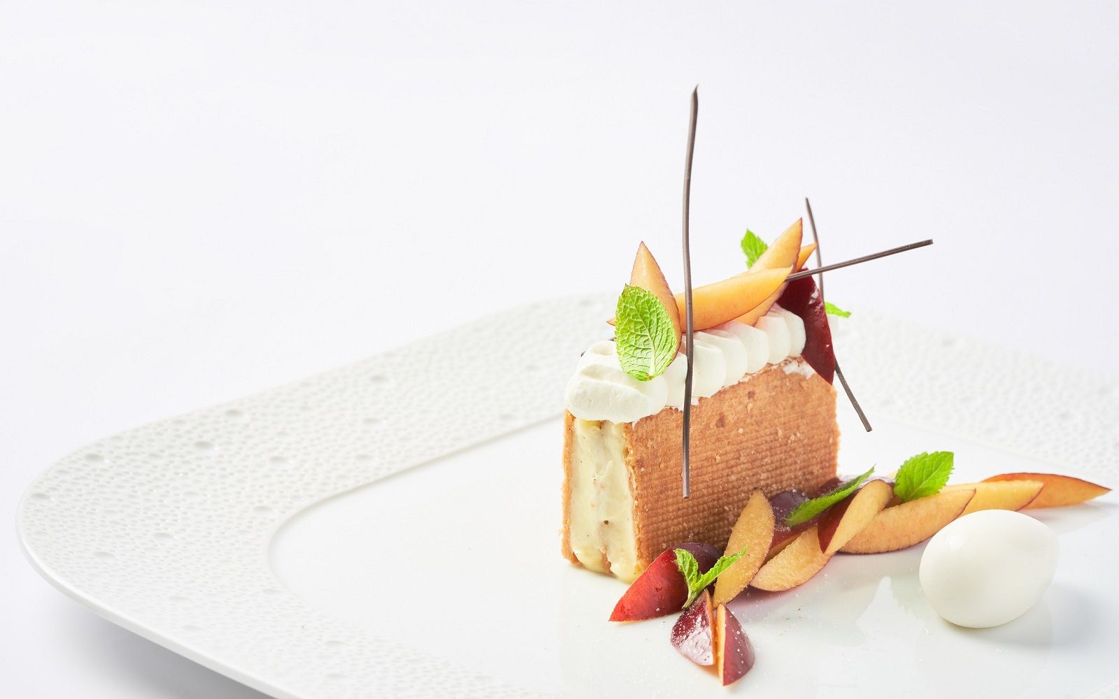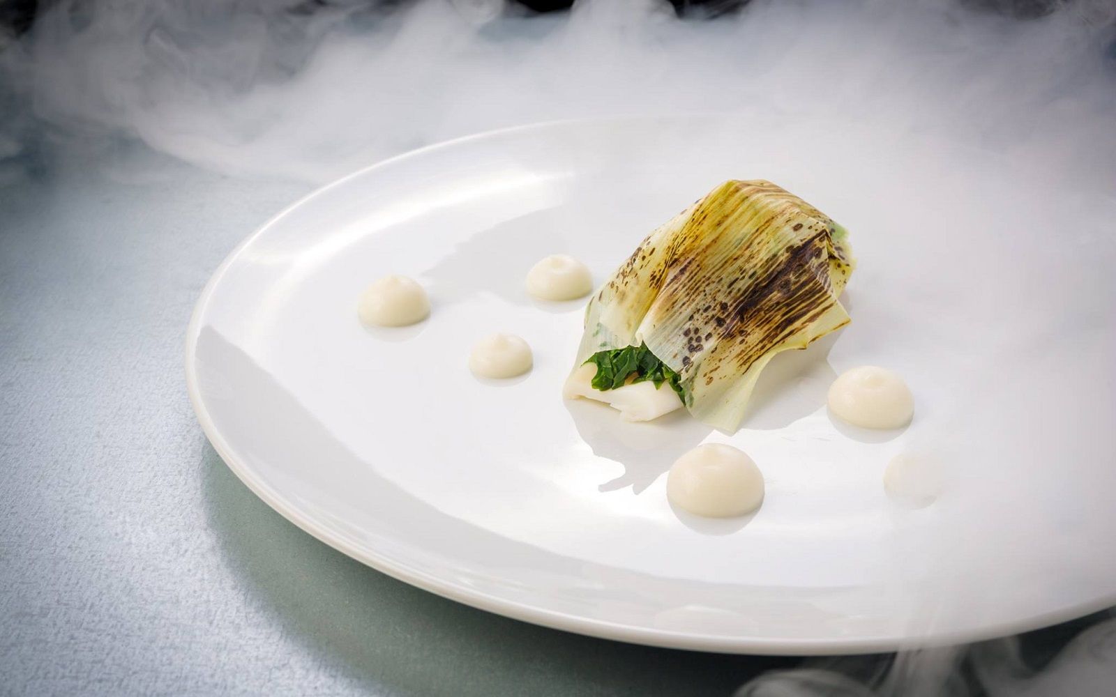 Food: Seared scallops with spring onion cream and black sesame; Cavatelli cacio e pepe with marinated red shrimp and baby squid; Almond sphere with apricot and ginger sorbet