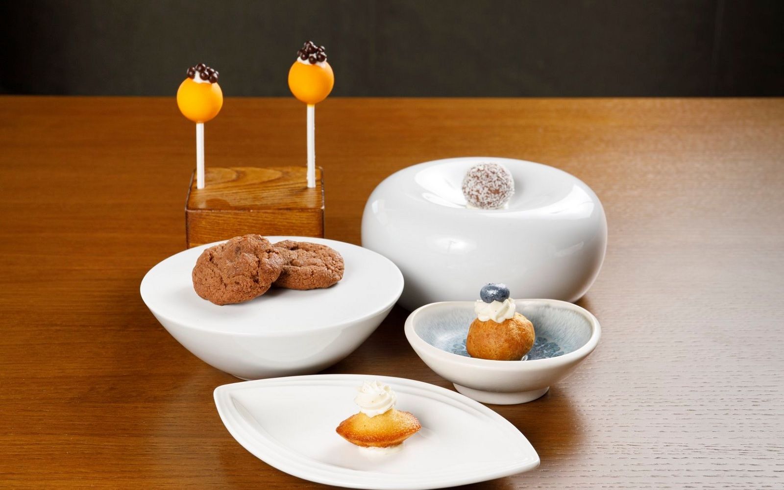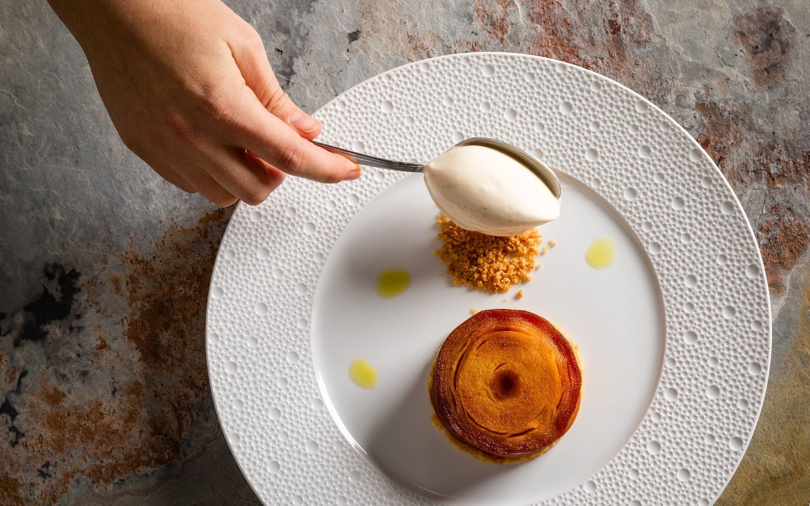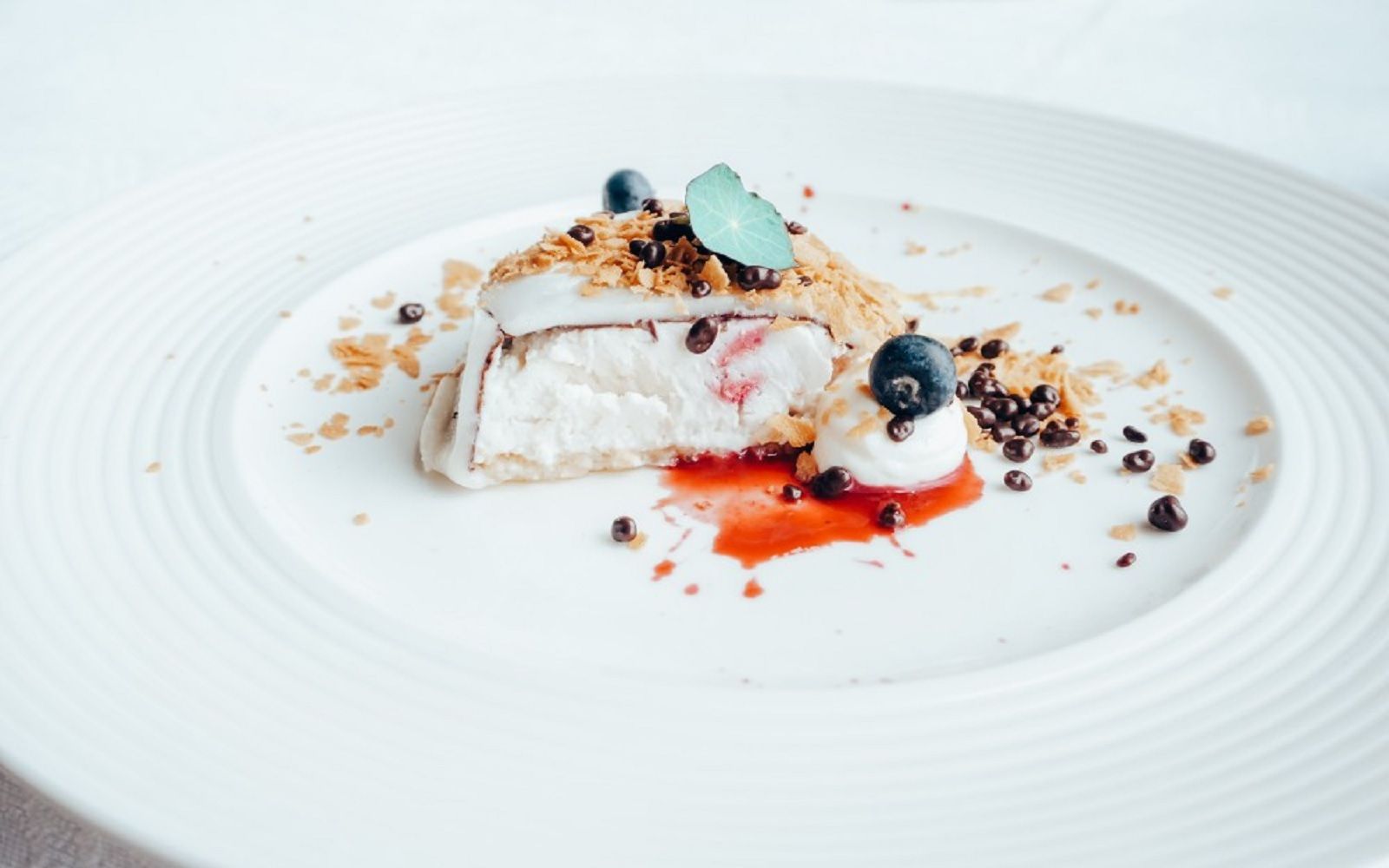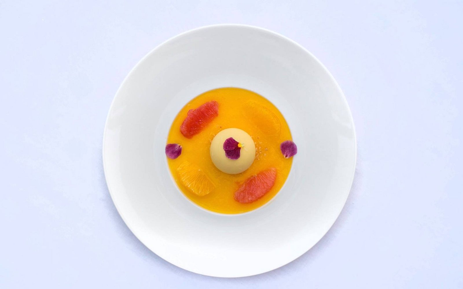 Food: Seared scallops with spring onion cream and black sesame; Cavatelli cacio e pepe with marinated red shrimp and baby squid; Almond sphere with apricot and ginger sorbet