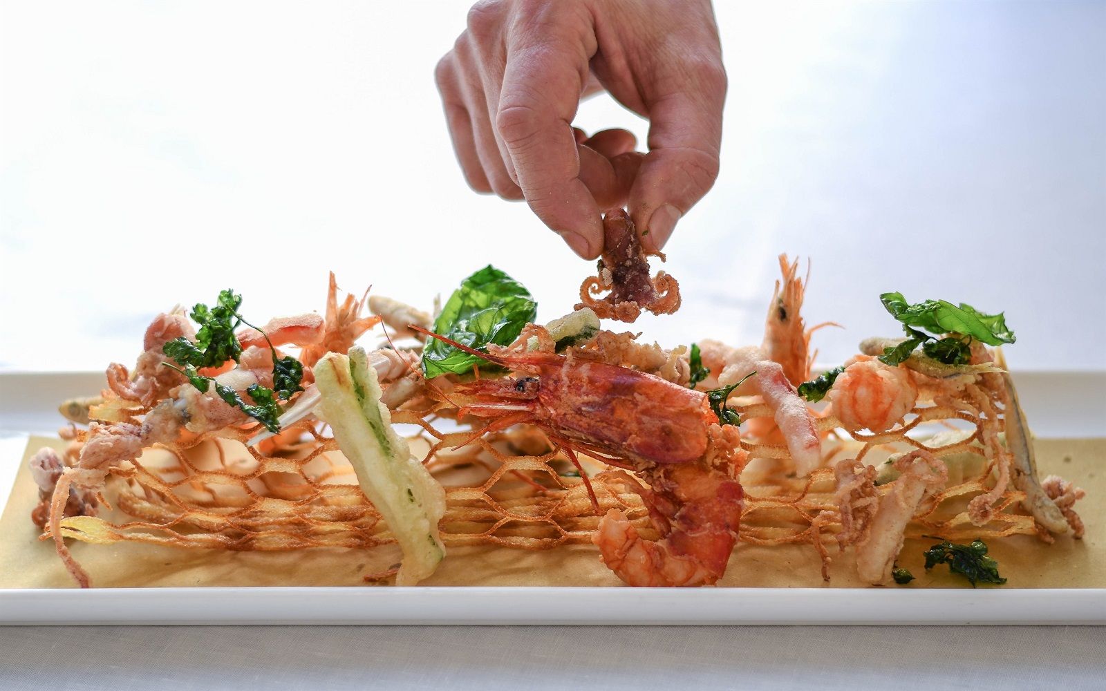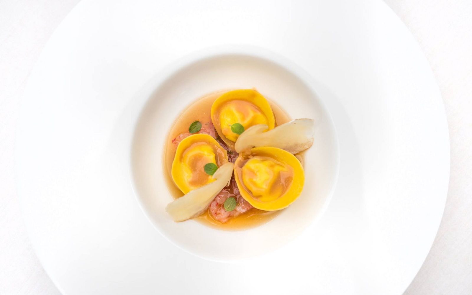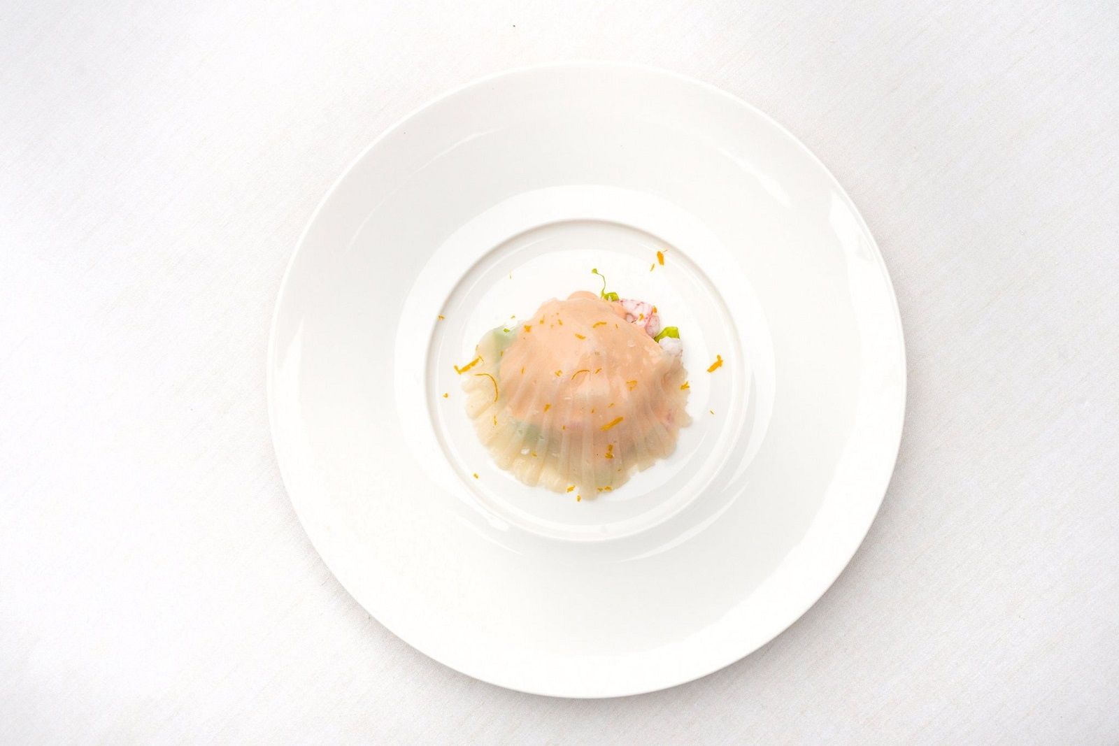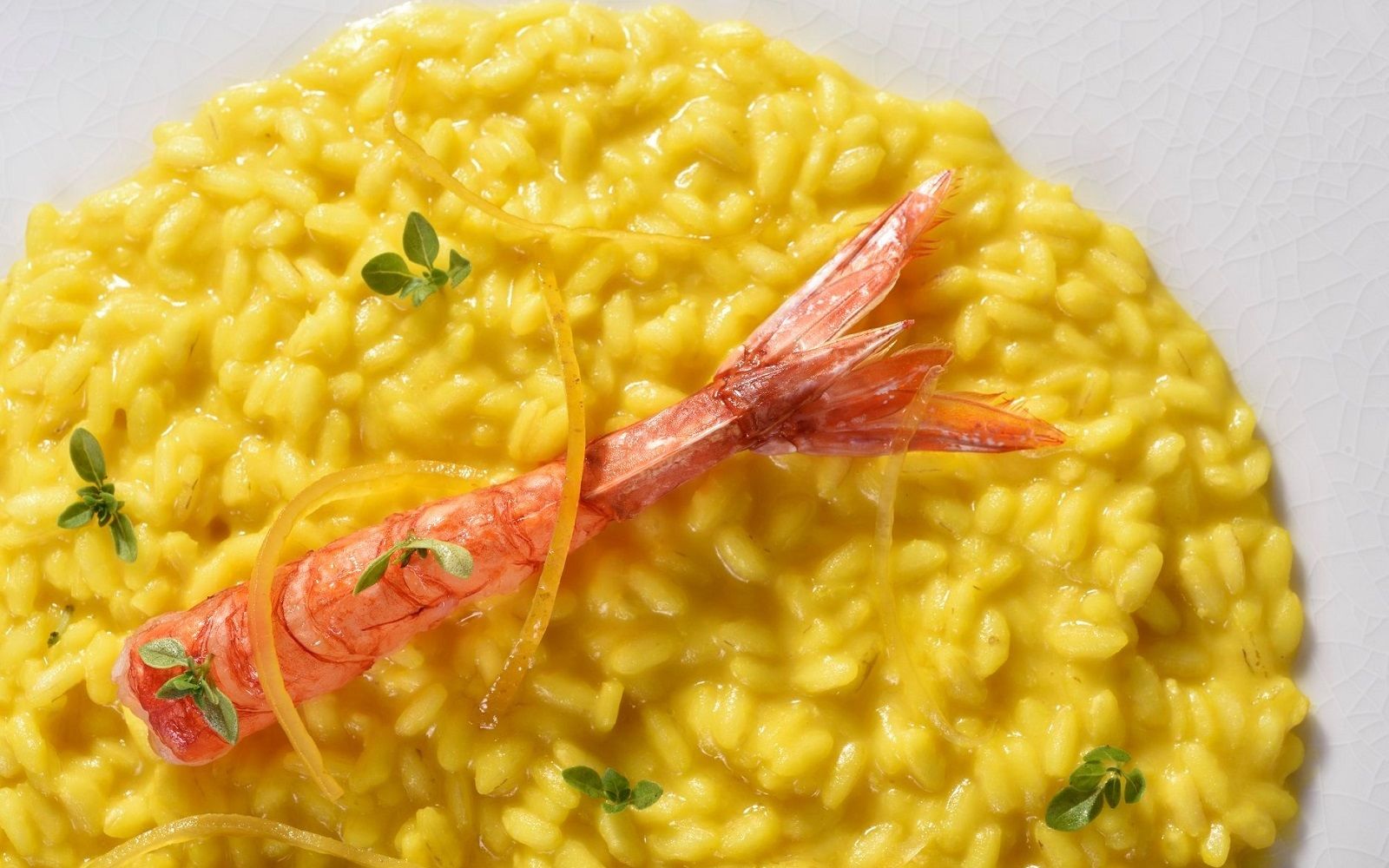 Food: Spaghetto iodato; Scampi with almond milk; Caracolato