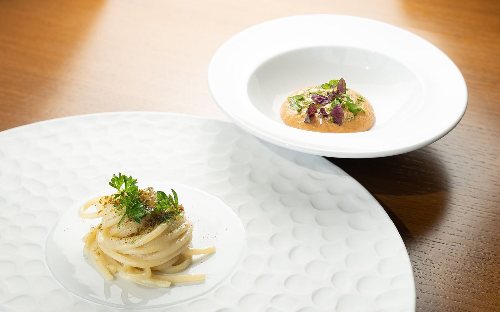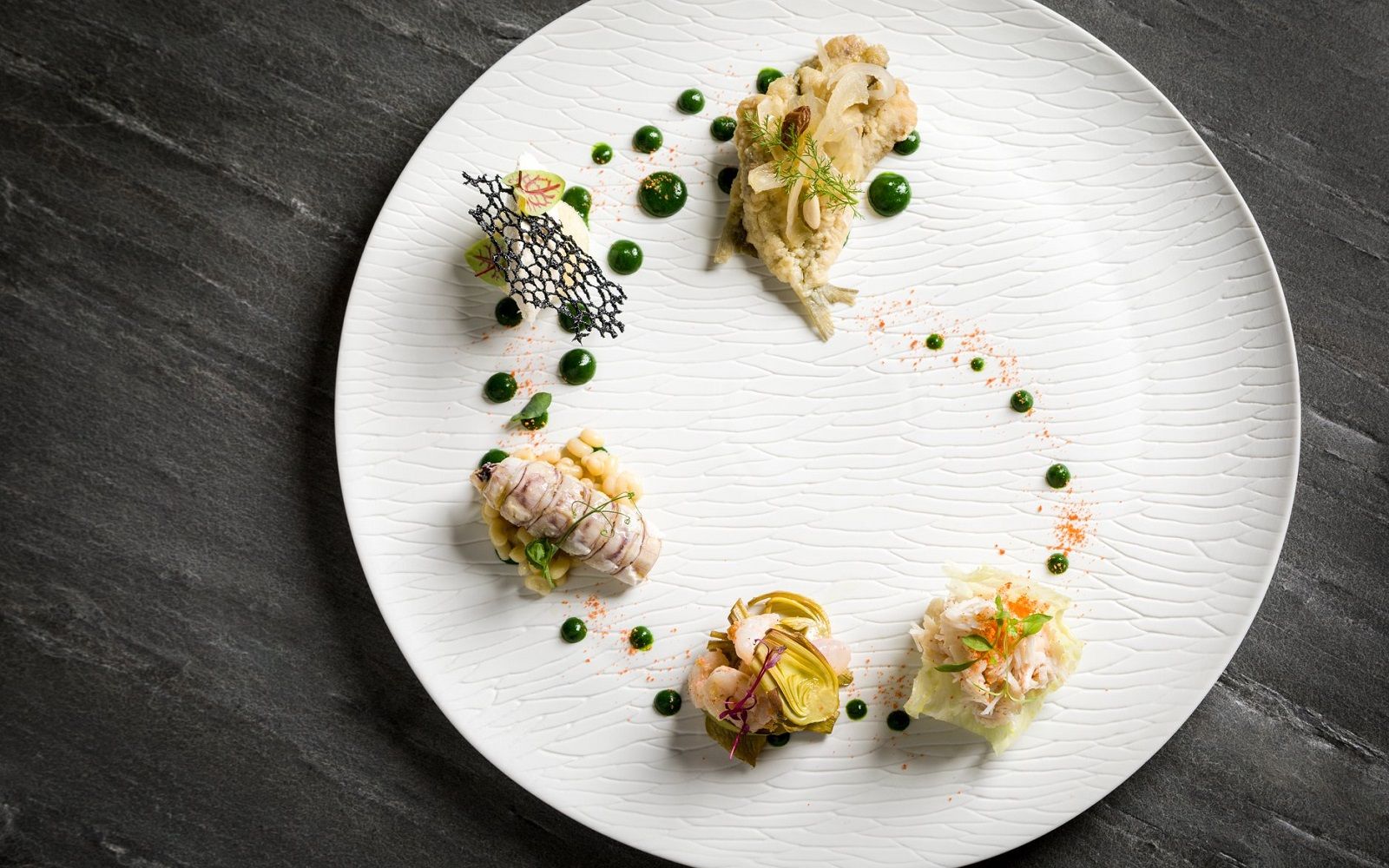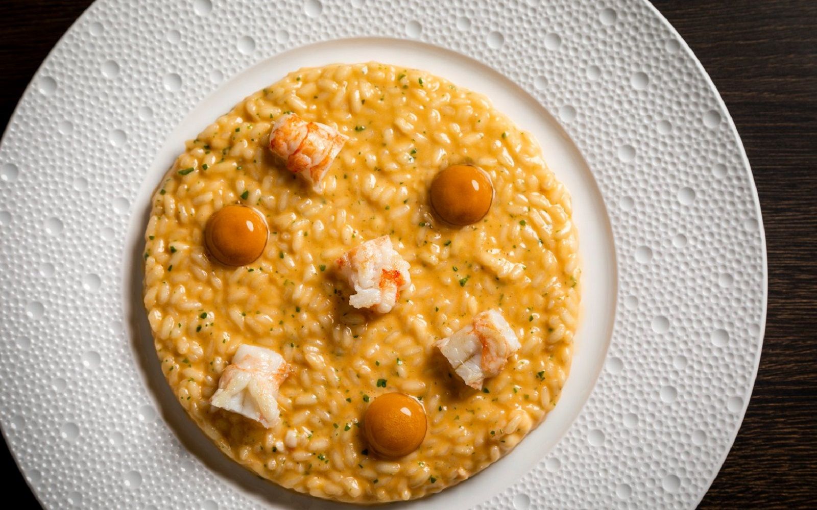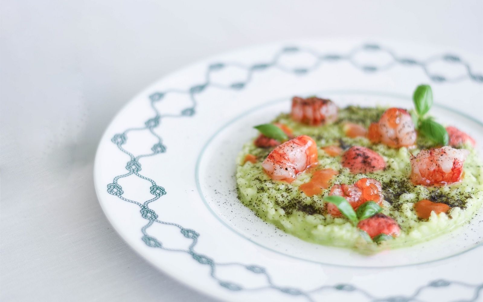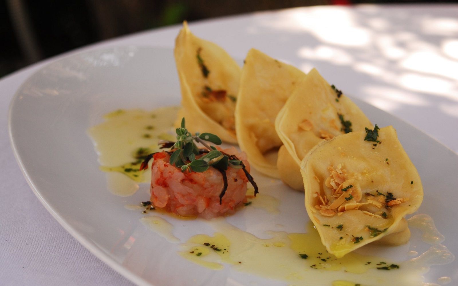 Food: Spaghetto iodato; Scampi with almond milk; Caracolato
