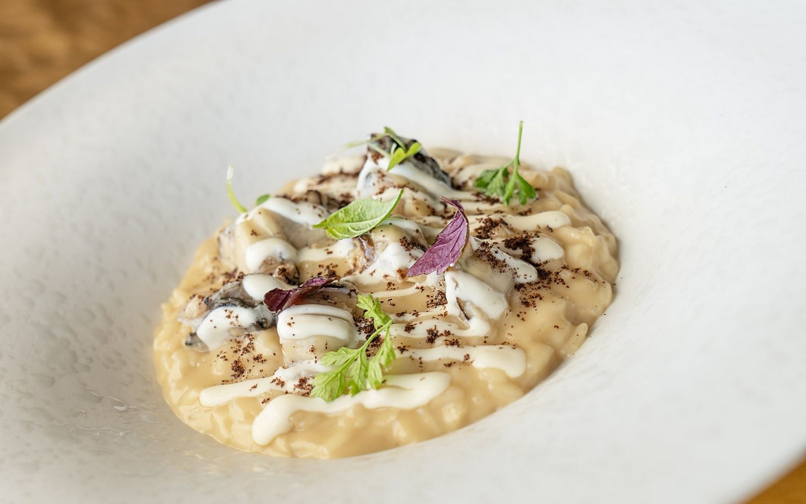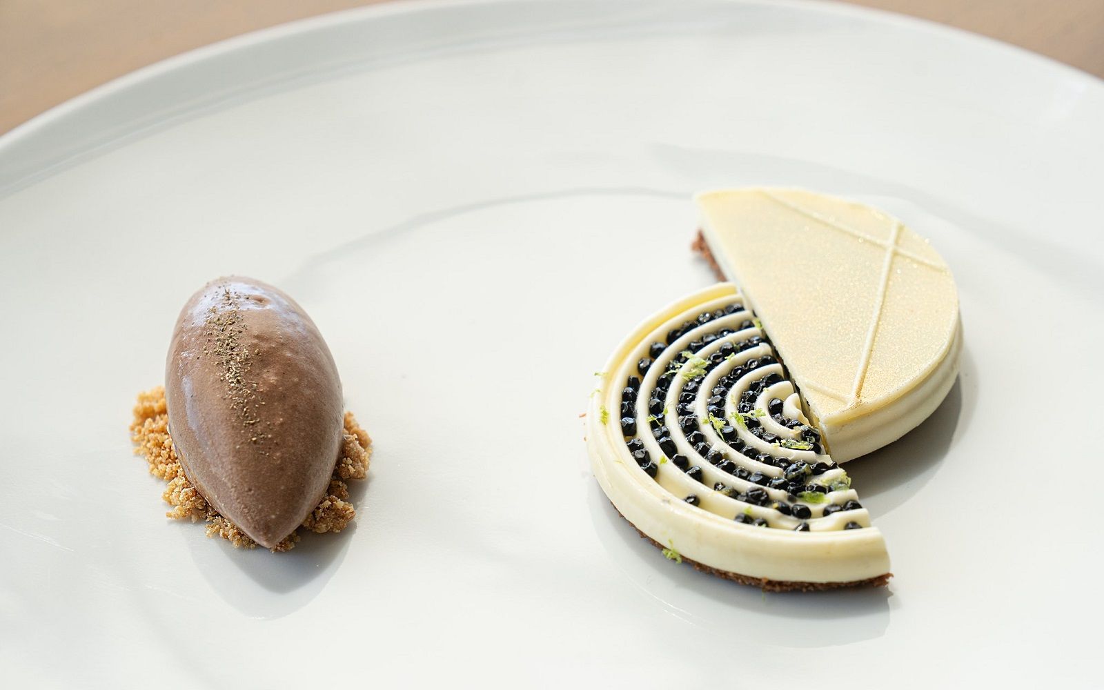 Food: Otto di Mare; Risotto, wild herbs, cuttlefish, lime; Peanut, salted caramel, lemon, ruby chocolate