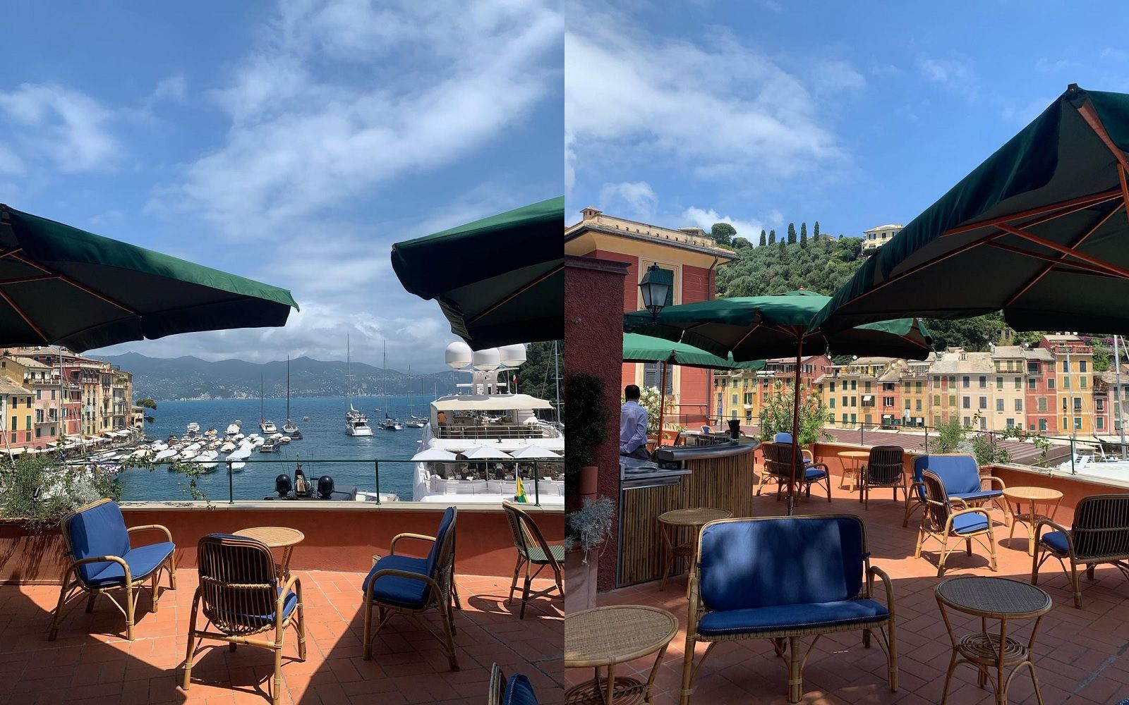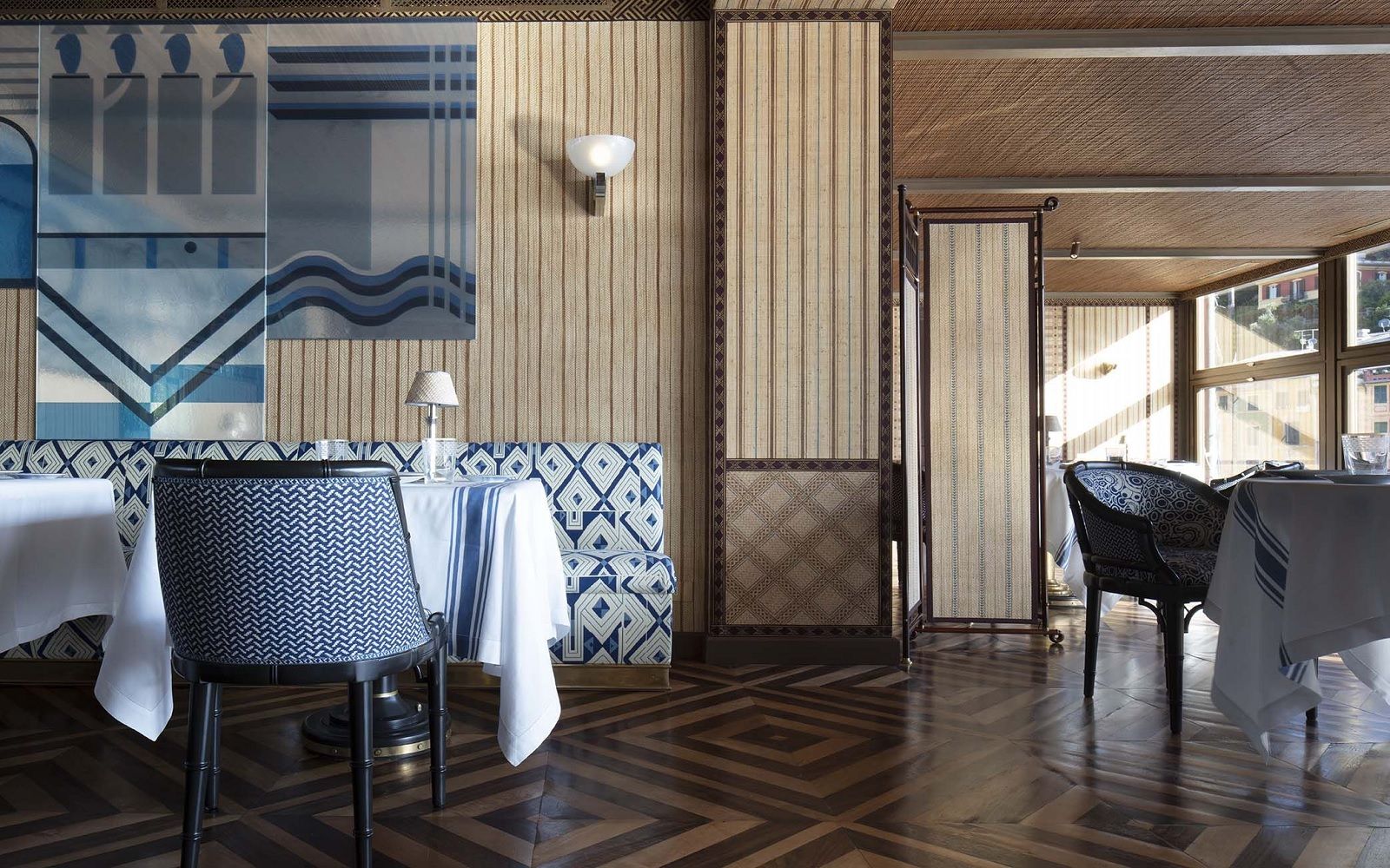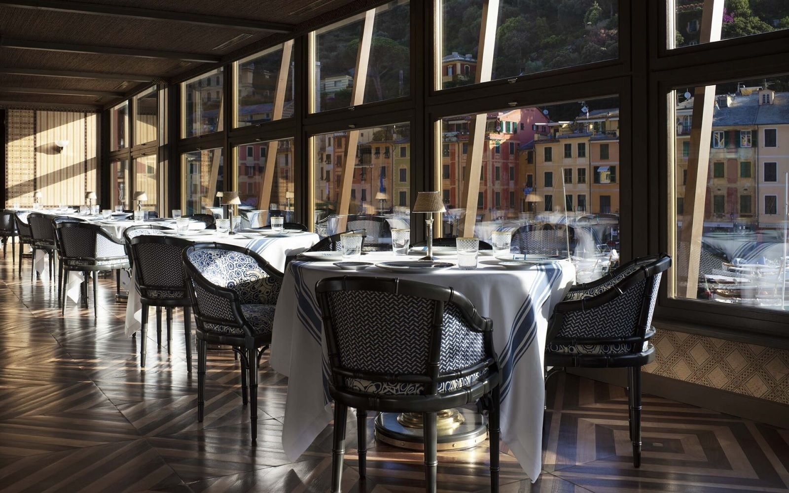 Location: Cracco restyled the spaces of the Pitosforo, a historic meeting point of the Riviera in the 50s and 60s, and has turned it into a sophisticated cabana, a restaurant with interiors in Japanese bamboo and raffia. The corner bar is set in the rock, while the large windows offer a stunning view of the harbor and the Gulf of Portofino, the same view you can enjoy from the terrace.