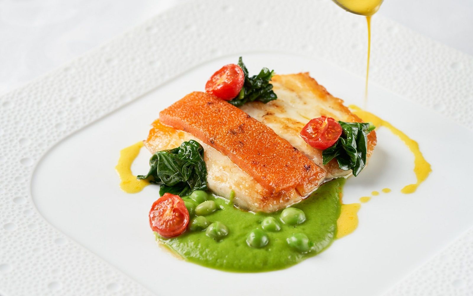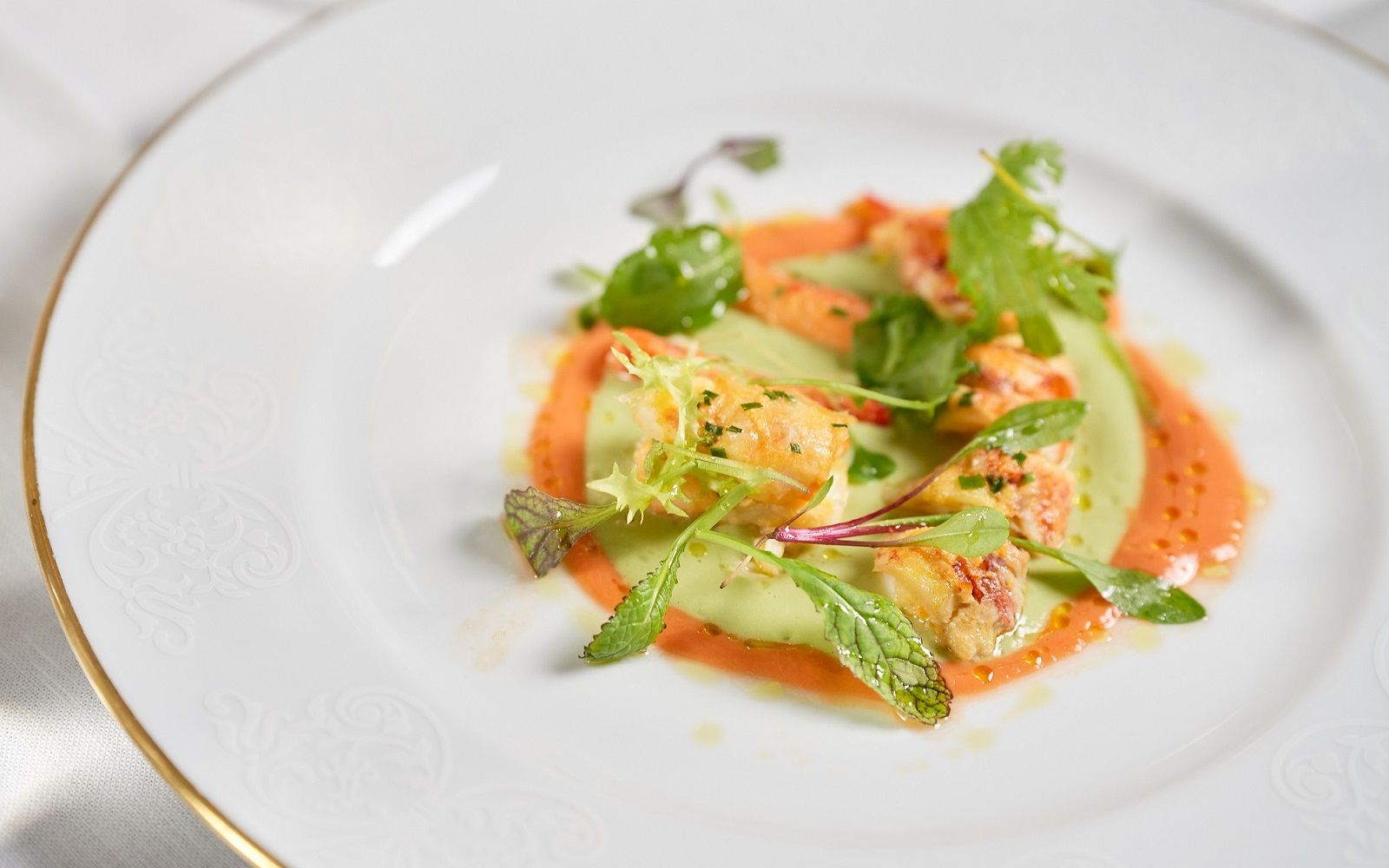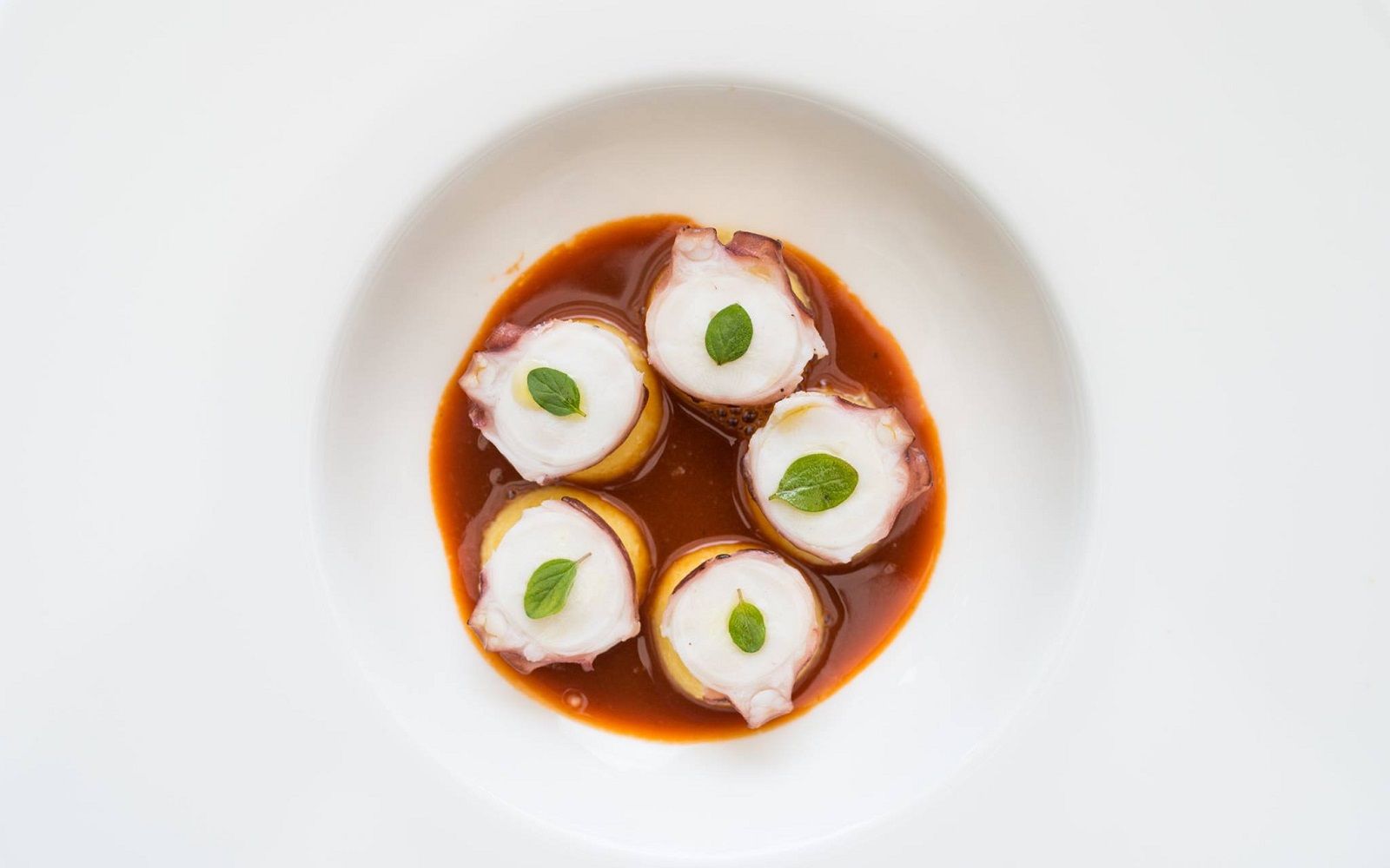 Food: Double-cooked octopus, saffron burrata and marinated red turnip; Spaghetti with lobster, parsley coulis and squid ink panko bread; Sea bass with broad bean puree, tabasco chicory and tomato powder