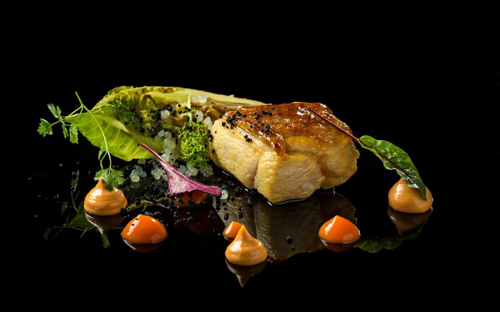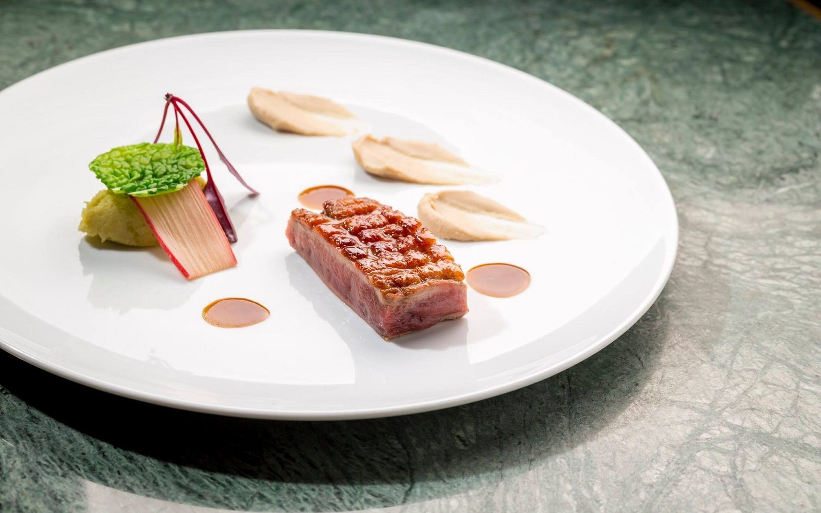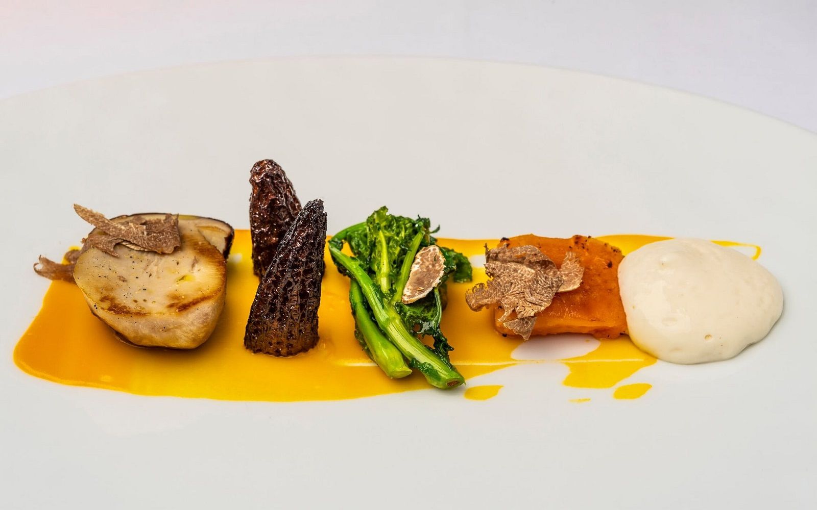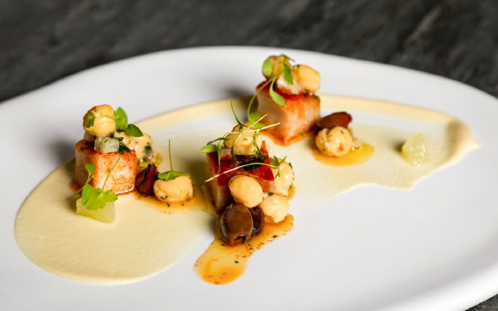 Food: Double-cooked octopus, saffron burrata and marinated red turnip; Spaghetti with lobster, parsley coulis and squid ink panko bread; Sea bass with broad bean puree, tabasco chicory and tomato powder