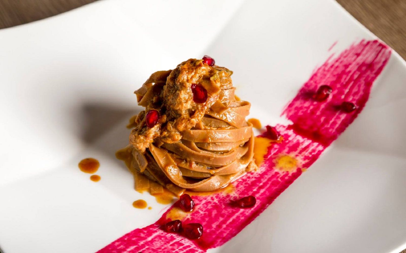 Food: Spaghettone, lupini and burnt eggplant; Piglet, apple, potatoes and mustard; White chocolate, raspberry and pineapple