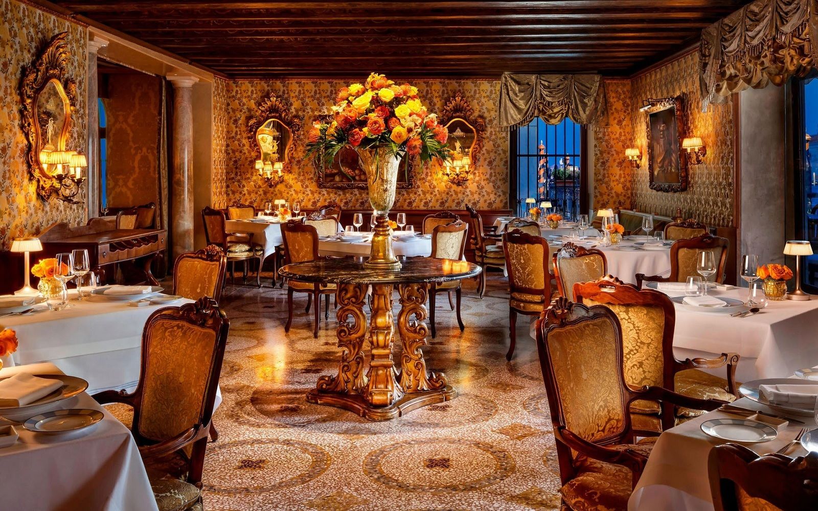 Location: a few steps from La Fenice and Piazza San Marco, you will find the iconic The Gritti Palace and, inside, the Club del Doge restaurant. As the name suggests, its interiors, rich in precious marble, stucco, paintings and carpets, are worthy of the figure who ruled the ancient Republic of Venice until 1797. If the sumptuous rooms full of history are not for you, outside you will find another kind of luxury: the spectacular dehors overlooking the Grand Canal, right in front of the Basilica of Santa Maria della Salute.