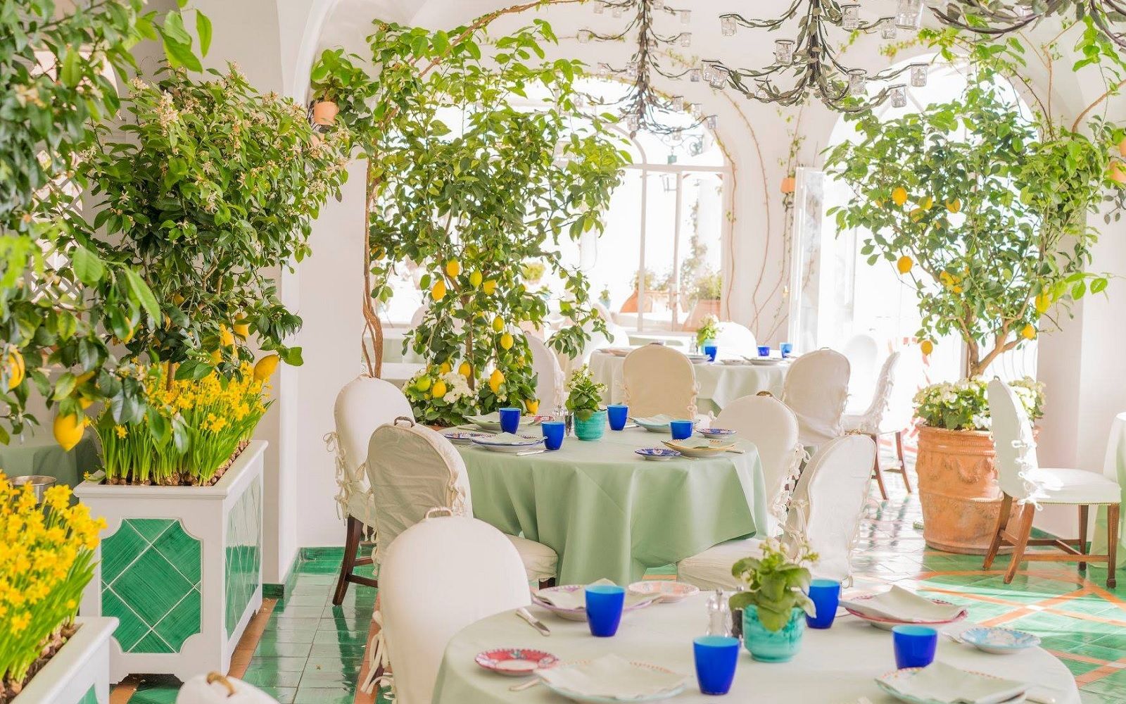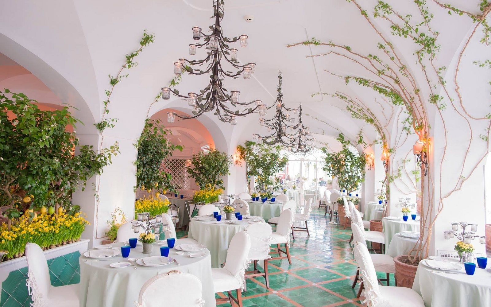 Location: La Sponda restaurant is part of the iconic and evocative Le Sirenuse hotel in Positano. This is enough to make it special, but at sunset the room covered with vines, lemon trees and yellow flowers is illuminated by four hundred candles and the sound of a mandolin and a guitar takes you back in time. That' s the epitome of La Dolce Vita.