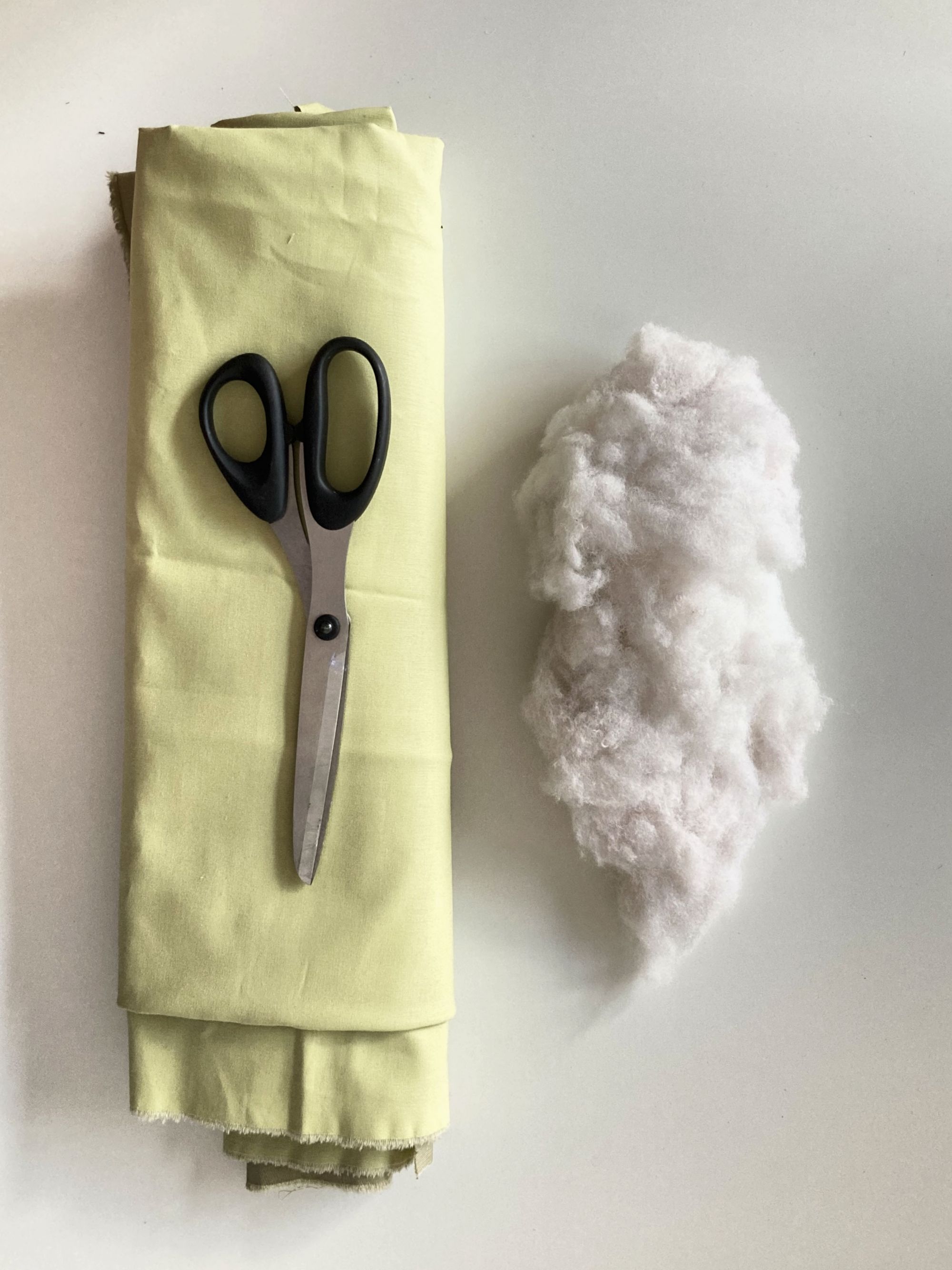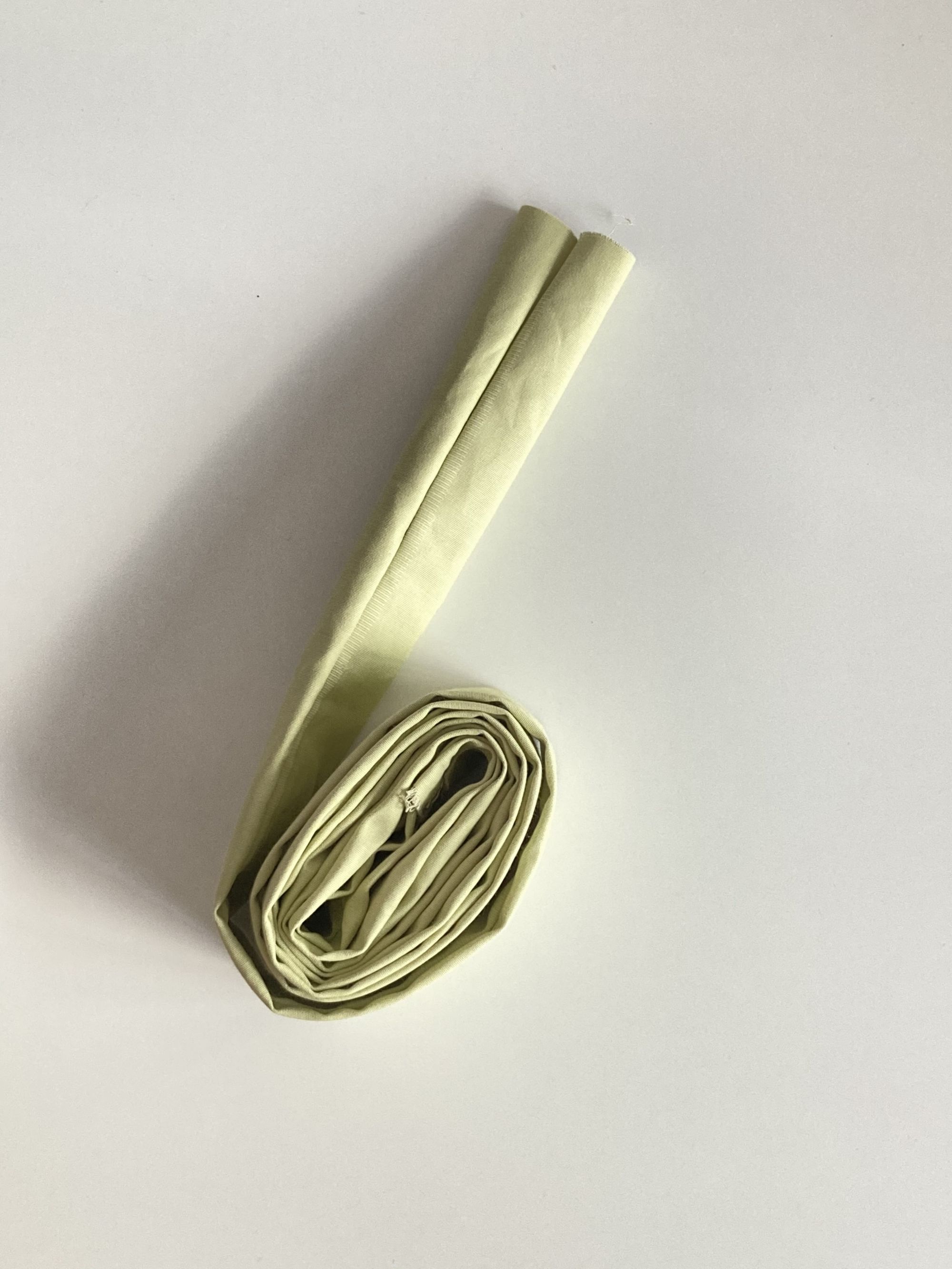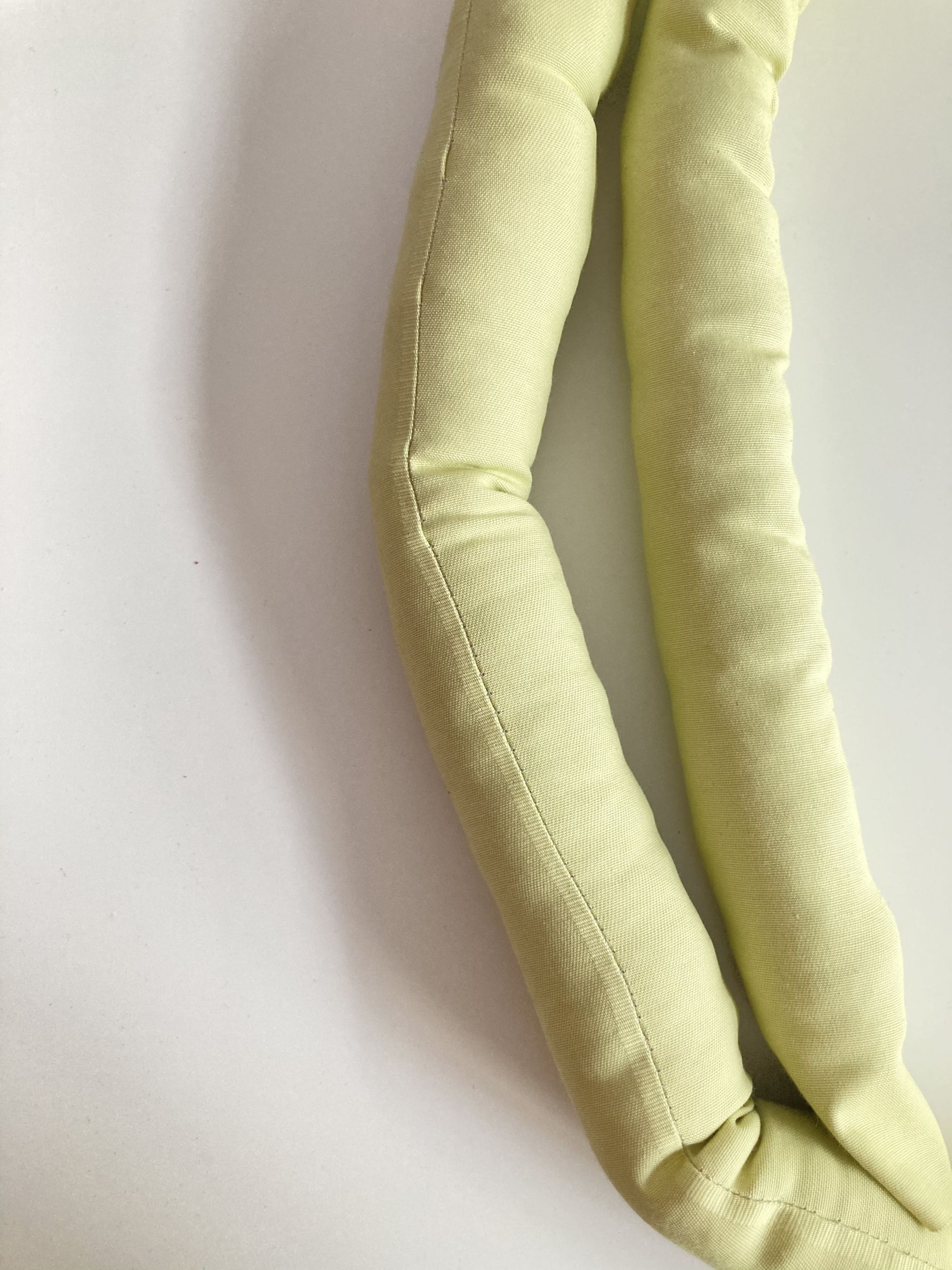 Cut a rectangle approximately 160cm X 15cm high. Stand on the back of the fabric, fold it in half on the long side and secure it with a straight seam. Be careful to leave the shorter sides free, we will need them to insert the padding.
