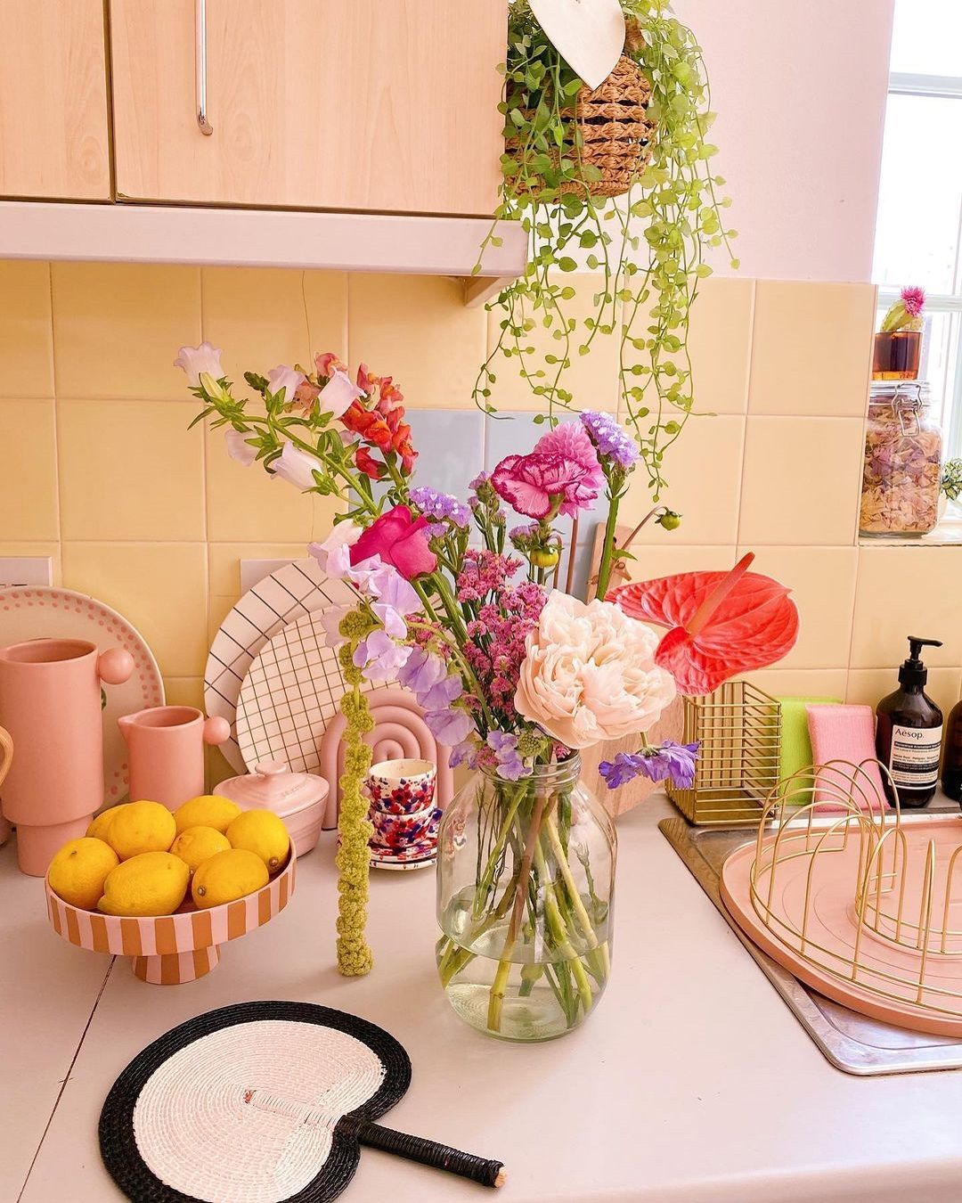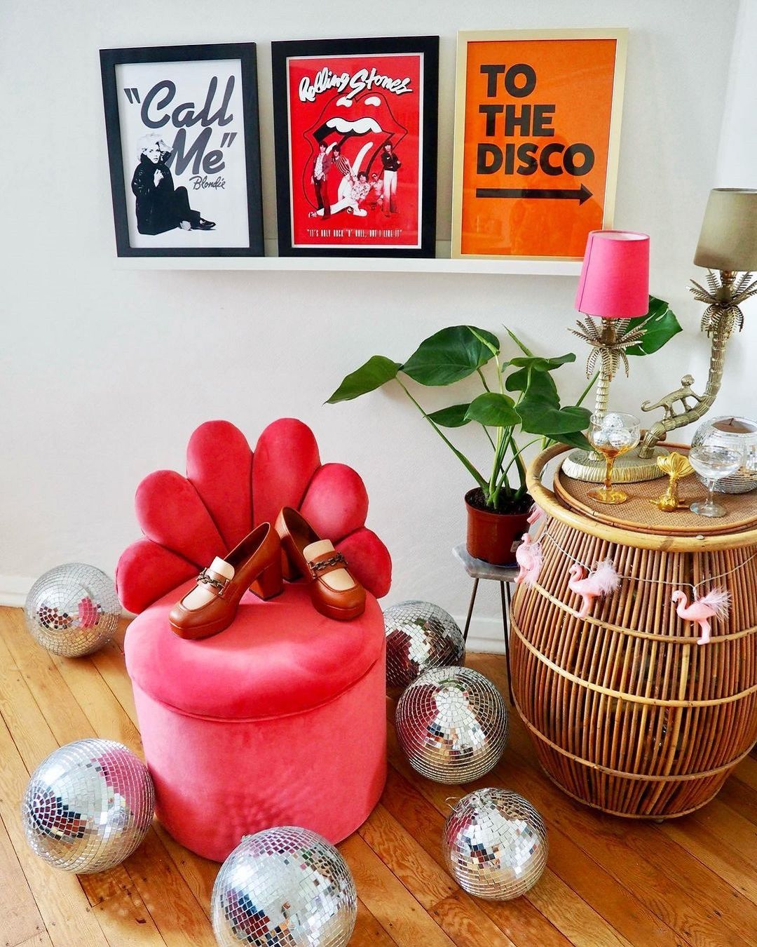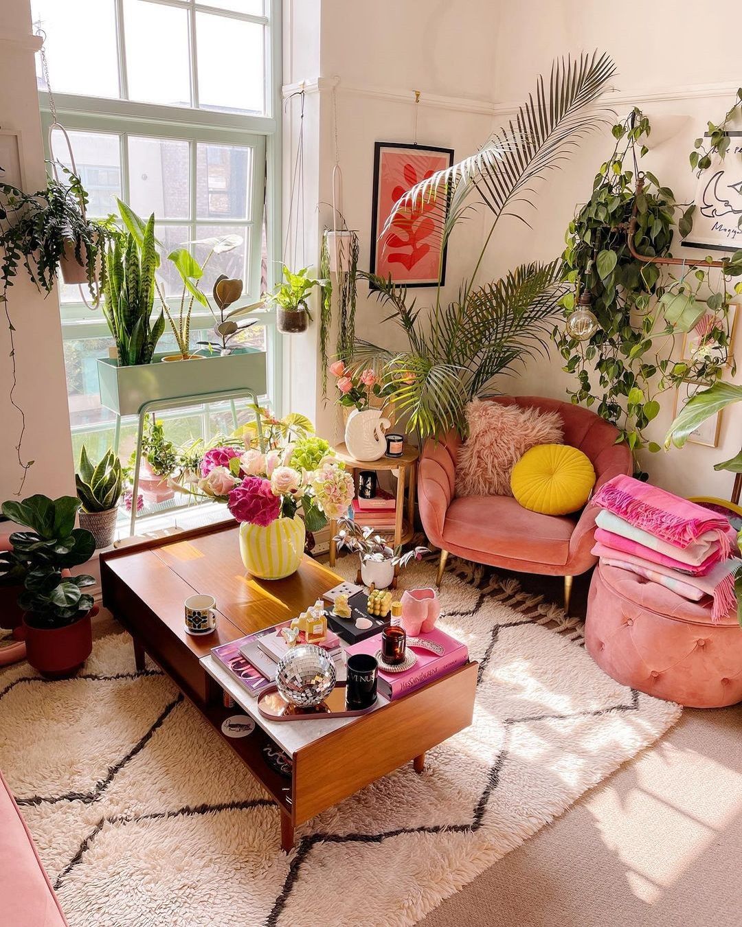 Zeena Shah loves vibrant colors and plants. In her small London apartment, Scandinavian minimalism is forbidden. Triumph pink, blue, yellow, orange, green, mix'n match prints, candles and vases with funny shapes, fluffy and soft pillows, girlie chairs and vintage elements to discover and copy. A definitely funny and feminine style that also reflects the outfits of the young textile designer.