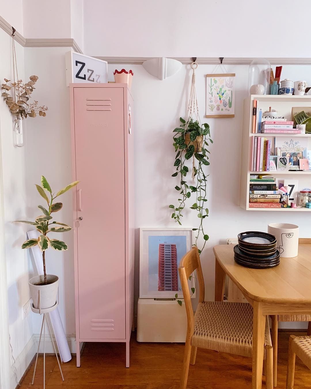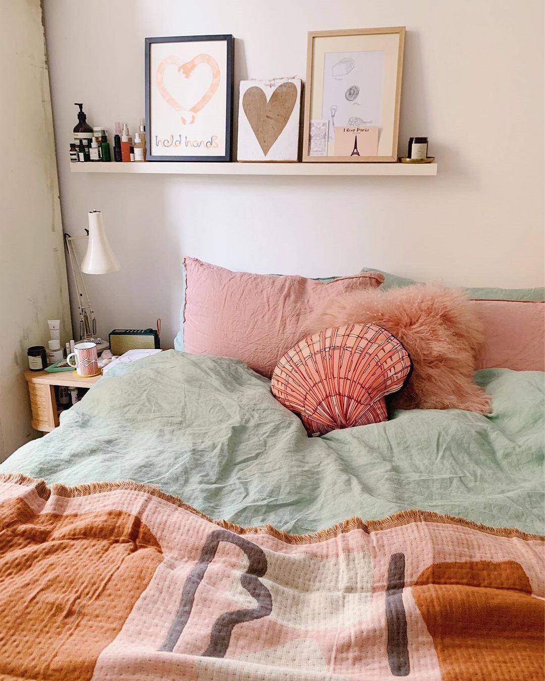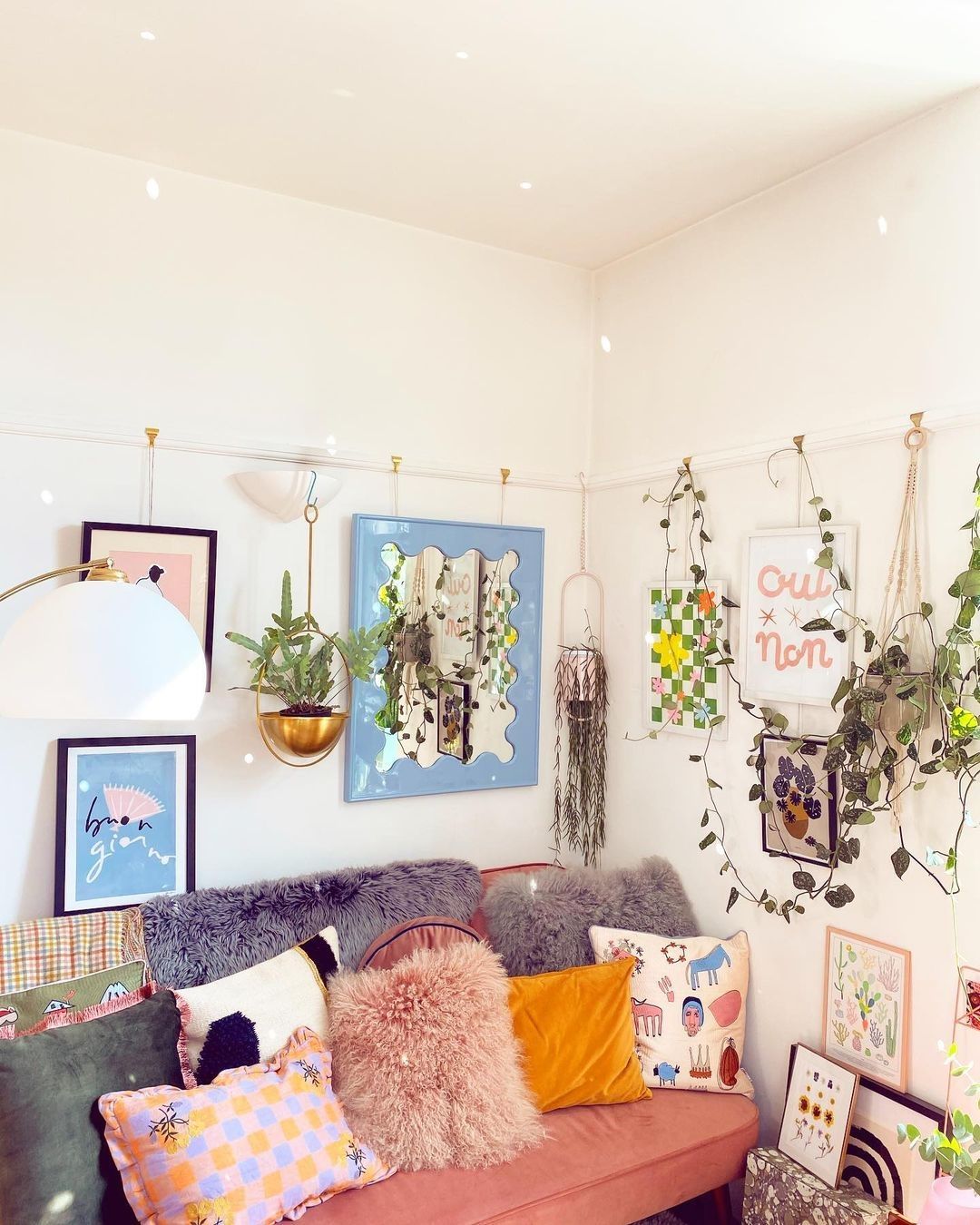 Zeena Shah loves vibrant colors and plants. In her small London apartment, Scandinavian minimalism is forbidden. Triumph pink, blue, yellow, orange, green, mix'n match prints, candles and vases with funny shapes, fluffy and soft pillows, girlie chairs and vintage elements to discover and copy. A definitely funny and feminine style that also reflects the outfits of the young textile designer.