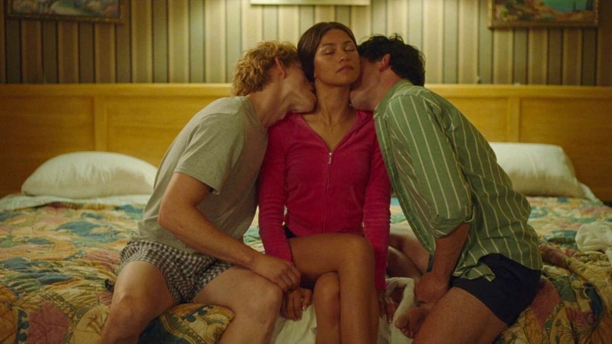 In Luca Guadagnino's sport drama Challengers, Tashi, Patrick and Art share a steamy triple kiss in a hotel room.