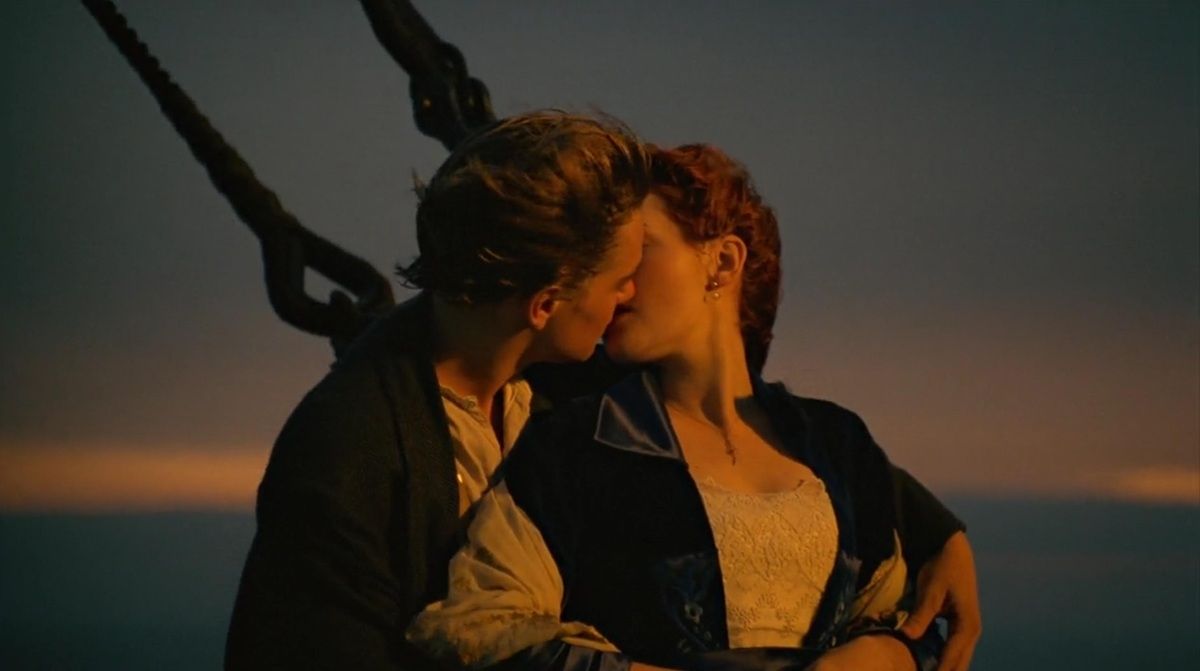 On the Titanic, as the sun goes down and Celine Dion's My Heart Will Go On plays, Jack and Rose share their first kiss in a pose that has become iconic (Rose's arms outstretched, Jack behind her).