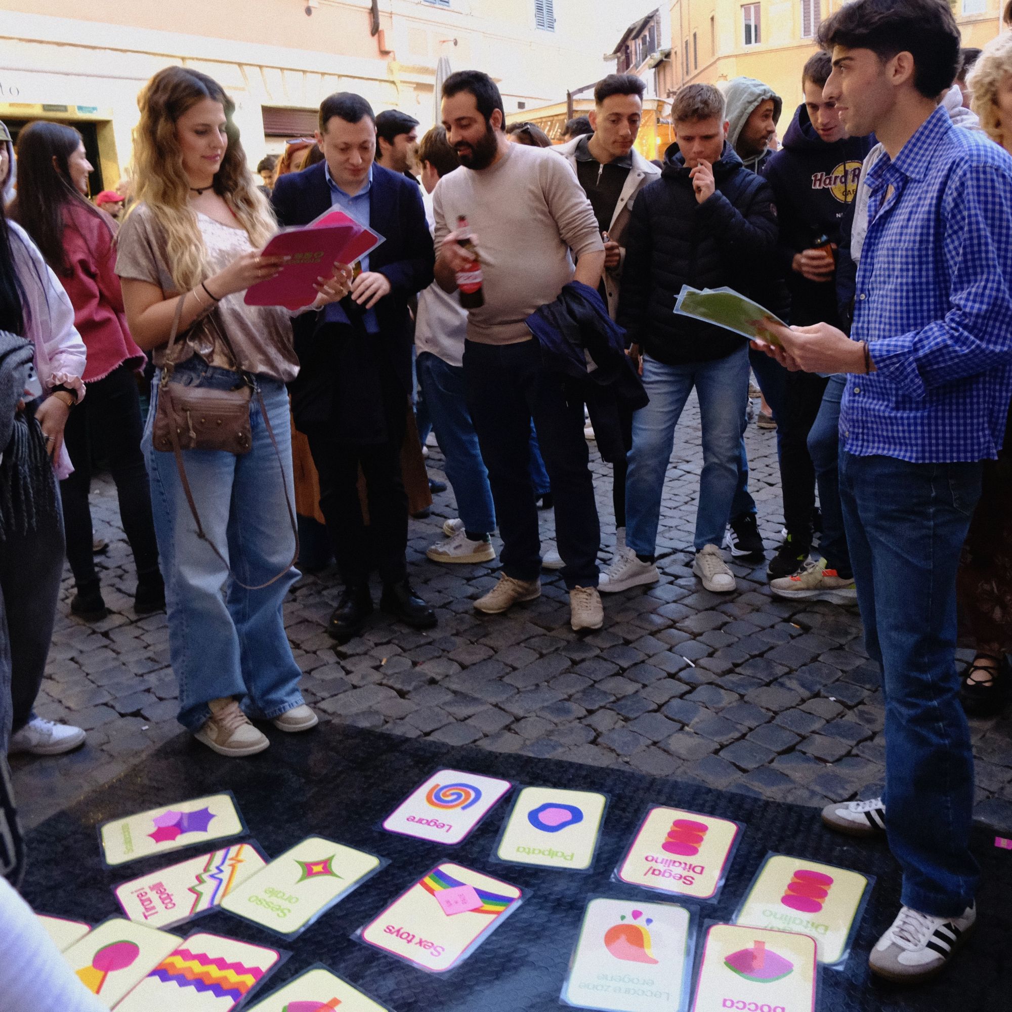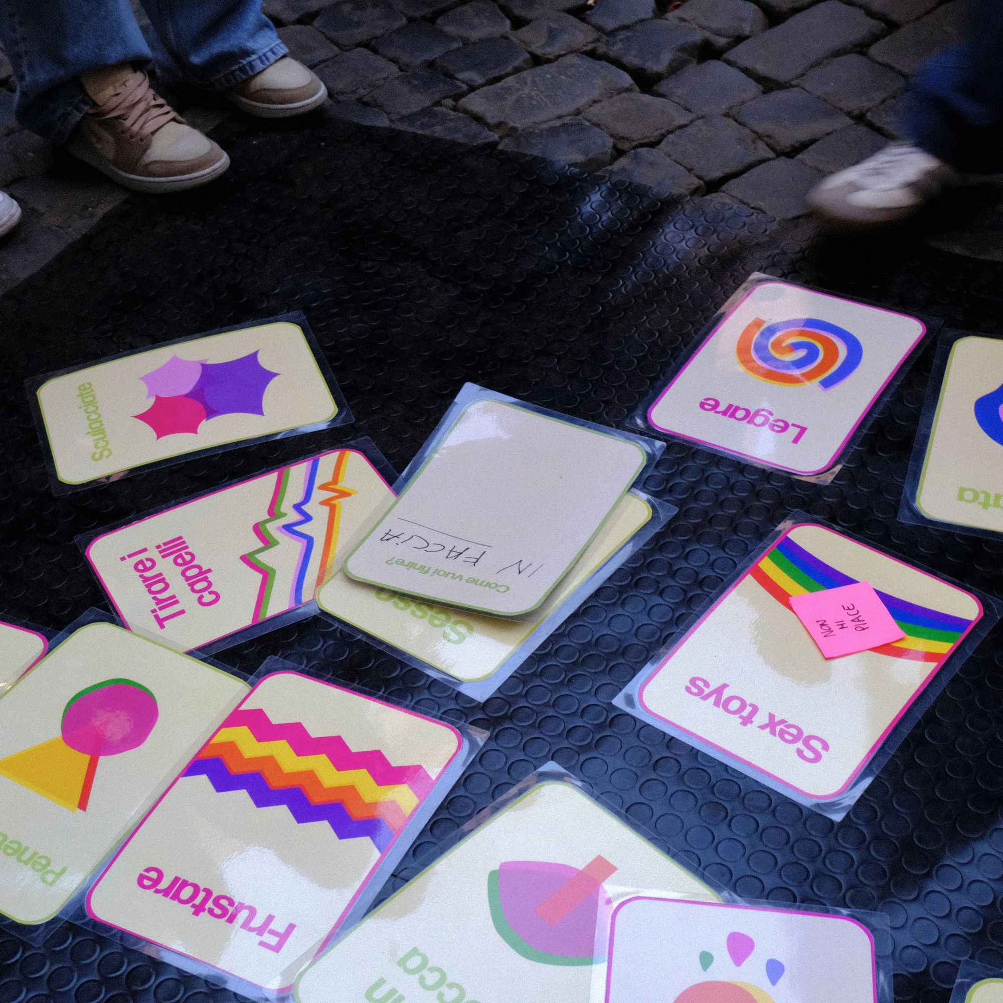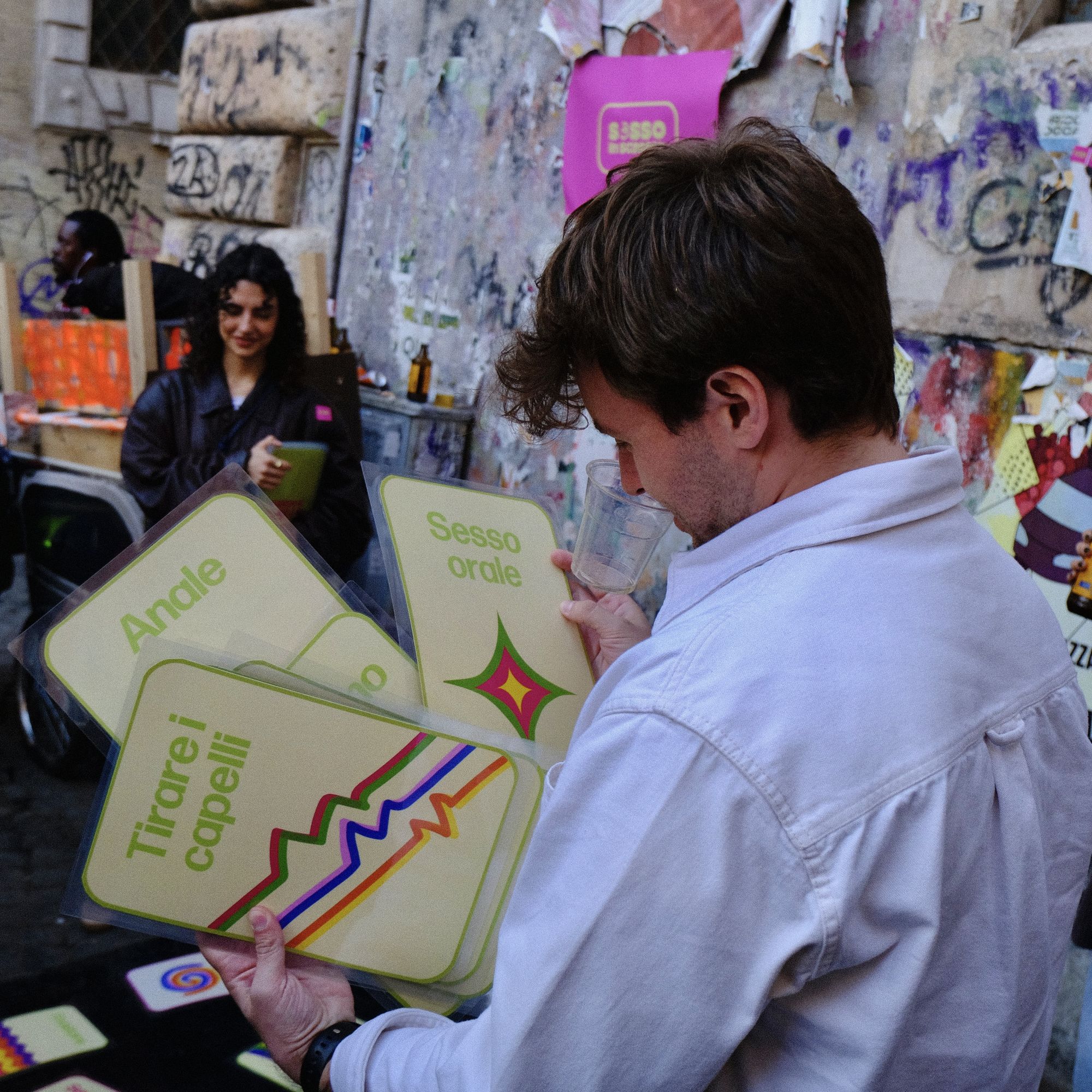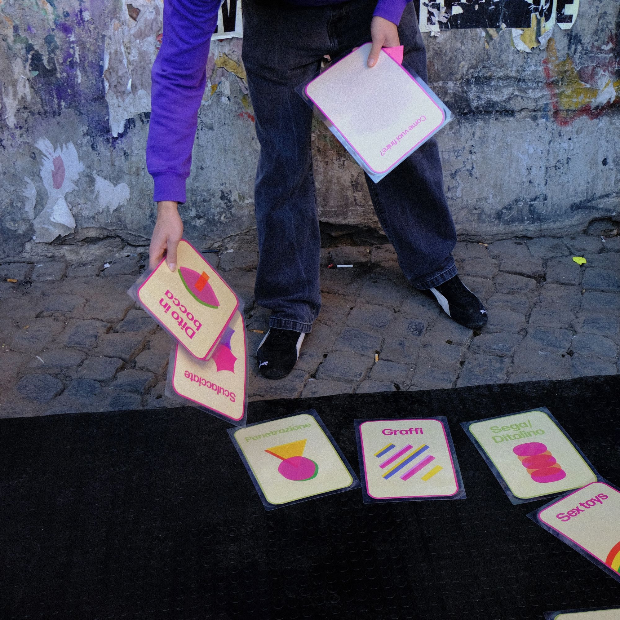 The project was created with the goal of freeing sexuality from the standards imposed by pornography and mainstream media, building a safe space for open conversations around desires, boundaries, doubts, and pleasures. "Sex," the creators explain, "is more fulfilling when it comes from respect, spontaneity, and the freedom to be yourself." Behind Sesso in Scatola are four IED students who chose to explore sexuality by freeing it from the dominant narratives of pornographic imagery, creating a moment for connection. "We wanted to engage our peers on how sexuality is experienced, and we thought of a card game as a simple, fun, and provocative way to do so. That’s why we took it to the streets." The initiative sparked curiosity and engagement among those present, turning the game into an opportunity for open and spontaneous dialogue. The experiment drew in many people: some intrigued, some amused, others embarrassed—but all involved.