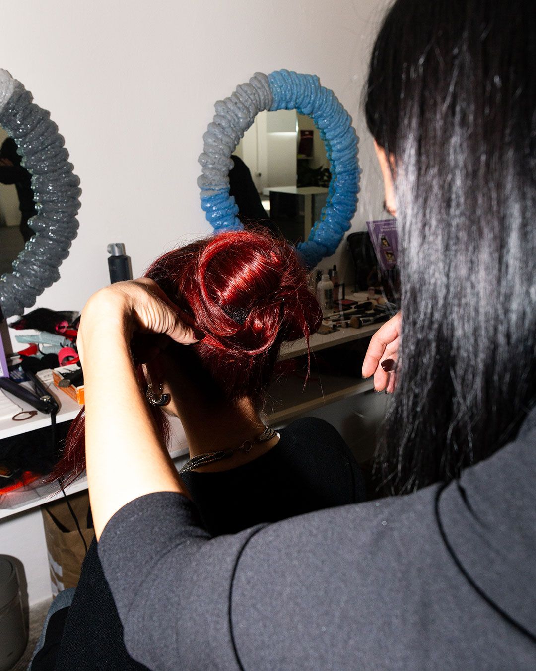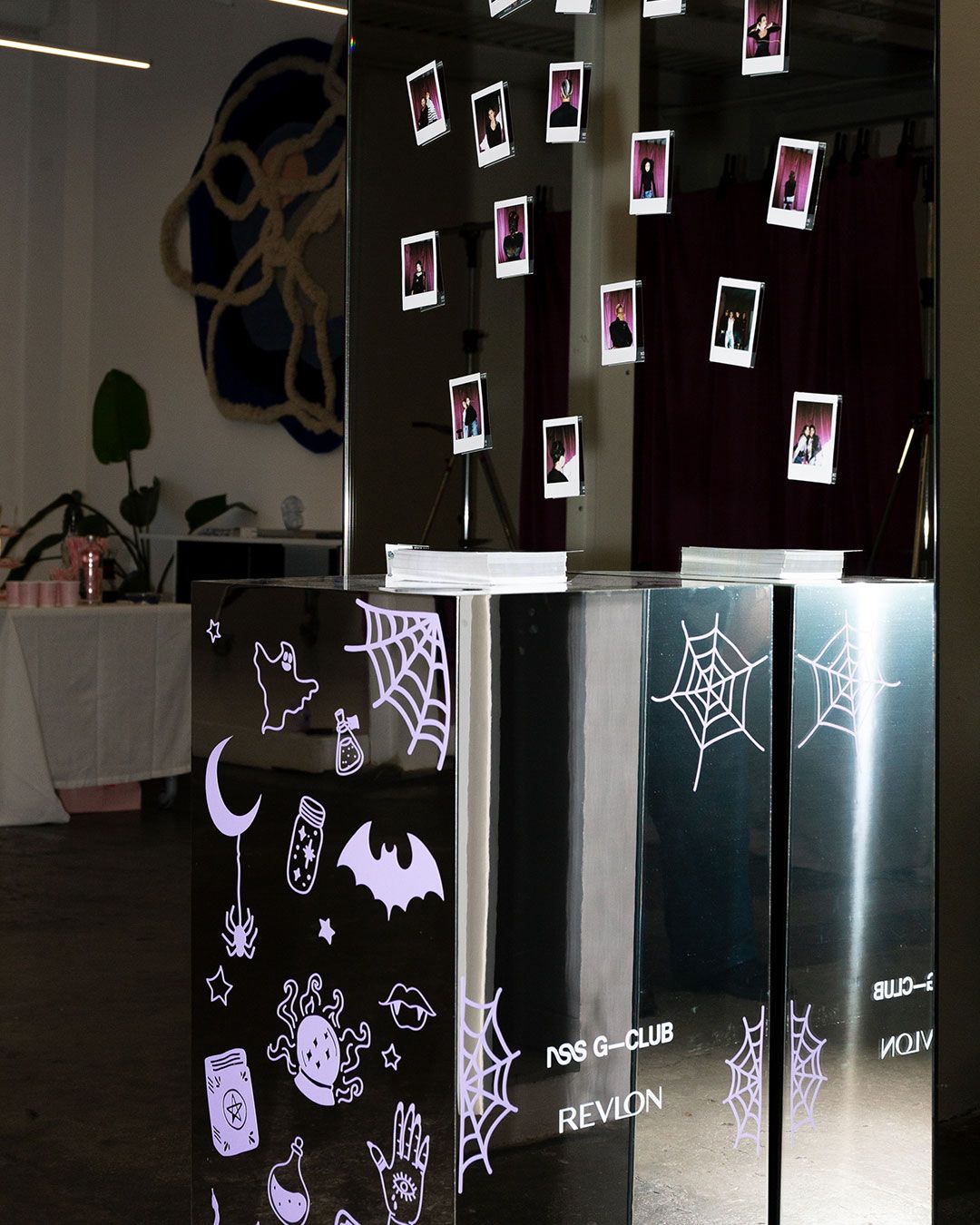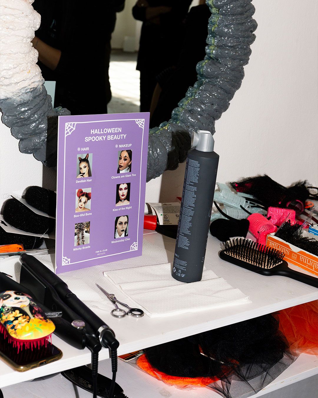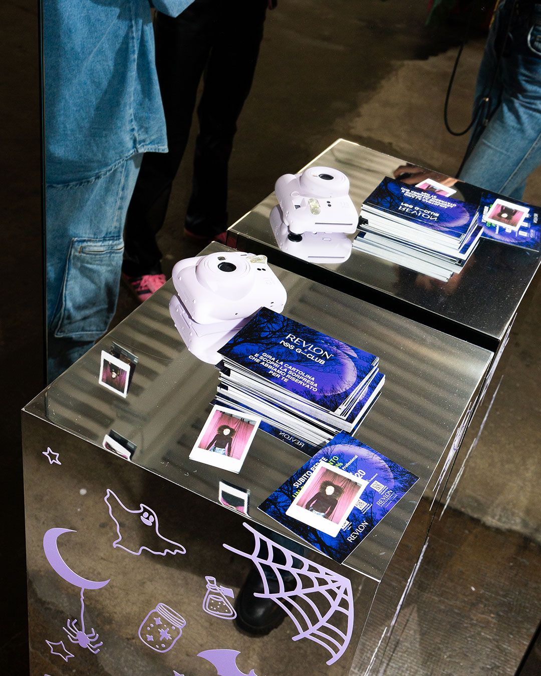 In collaboration with Revlon Italia, nss G-Club transformed its spaces into a spooky beauty salon, where a team of two make-up artists and two hairstylists offered its followers a last-minute make-up and hair solution. The result? Vampy Lips, bloody nails, Wednesday Addams braids, Siren Eyes, bold eyes and dark details, from spider webs to vampire lipstick, from witchy double buns to spider lashes.