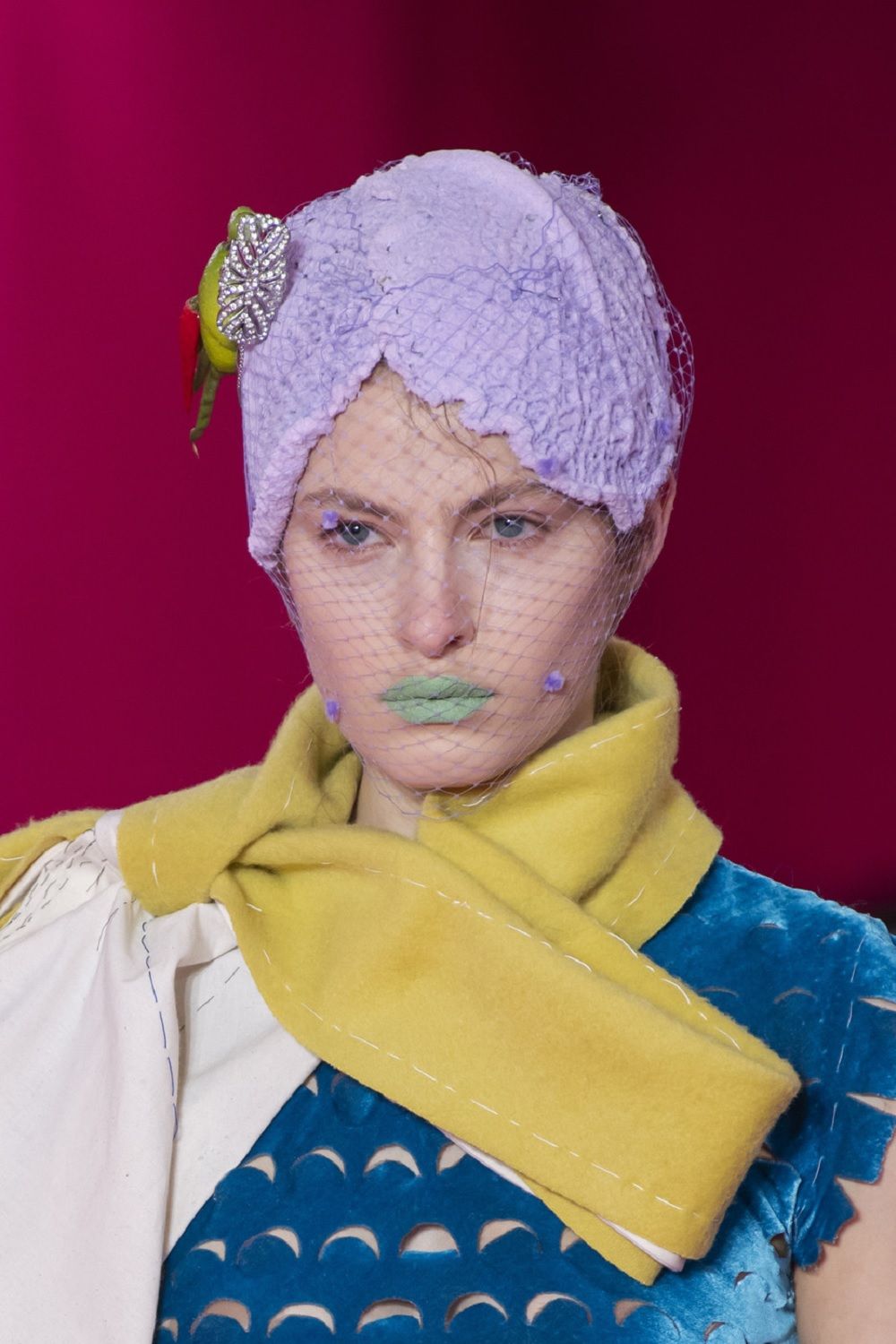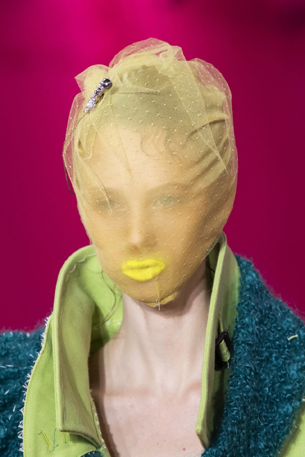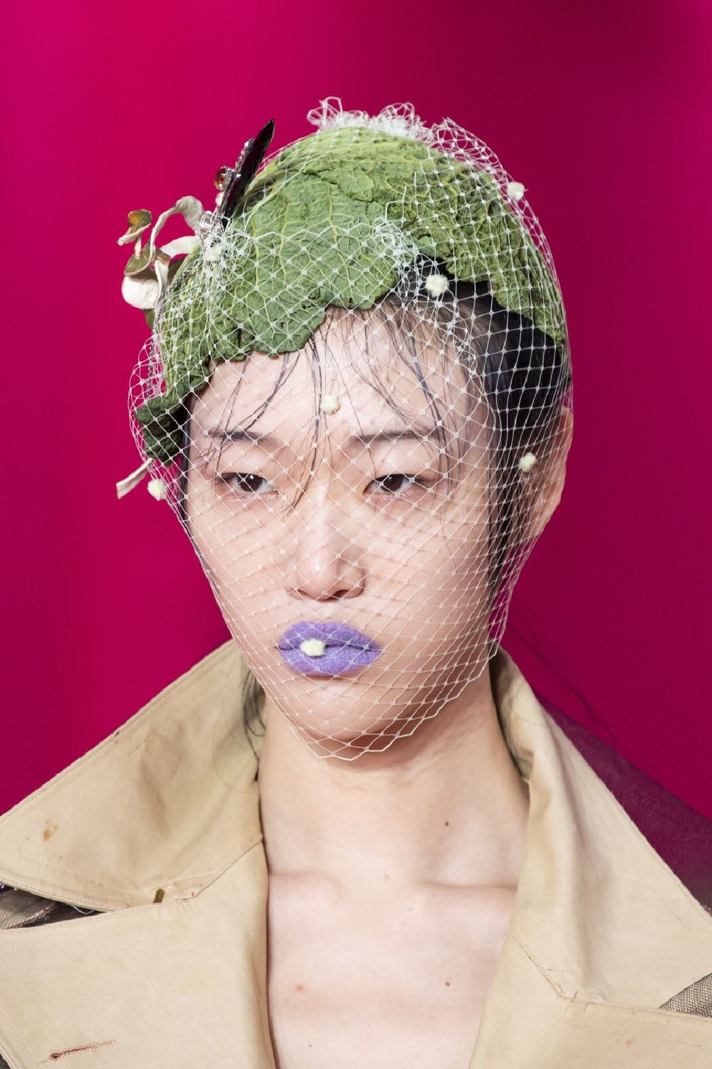 Il beauty di Maison Margiela è un sovraccarico vibrante di colori, ispirato dai dipinti di Edward Hopper. Pat McGrath ha optato, come il suo solito, per una pelle perfetta, luminosa, concentrato l’attenzione sulle labbra. Dal giallo all’arancione, dal fucsia al blu, dal verde lime al prugna, i rossetti hanno le sfumature dell’arcobaleno e un finish morbido, quasi cipriato. A completare l’effetto pop c’è l’headwear. I capelli hanno un wet look reso unico da velette e cloche molto speciali, fatte di foglie di cavolo dipinte al neon, con mini carote e fagiolini disposti come fossero piume decorative.