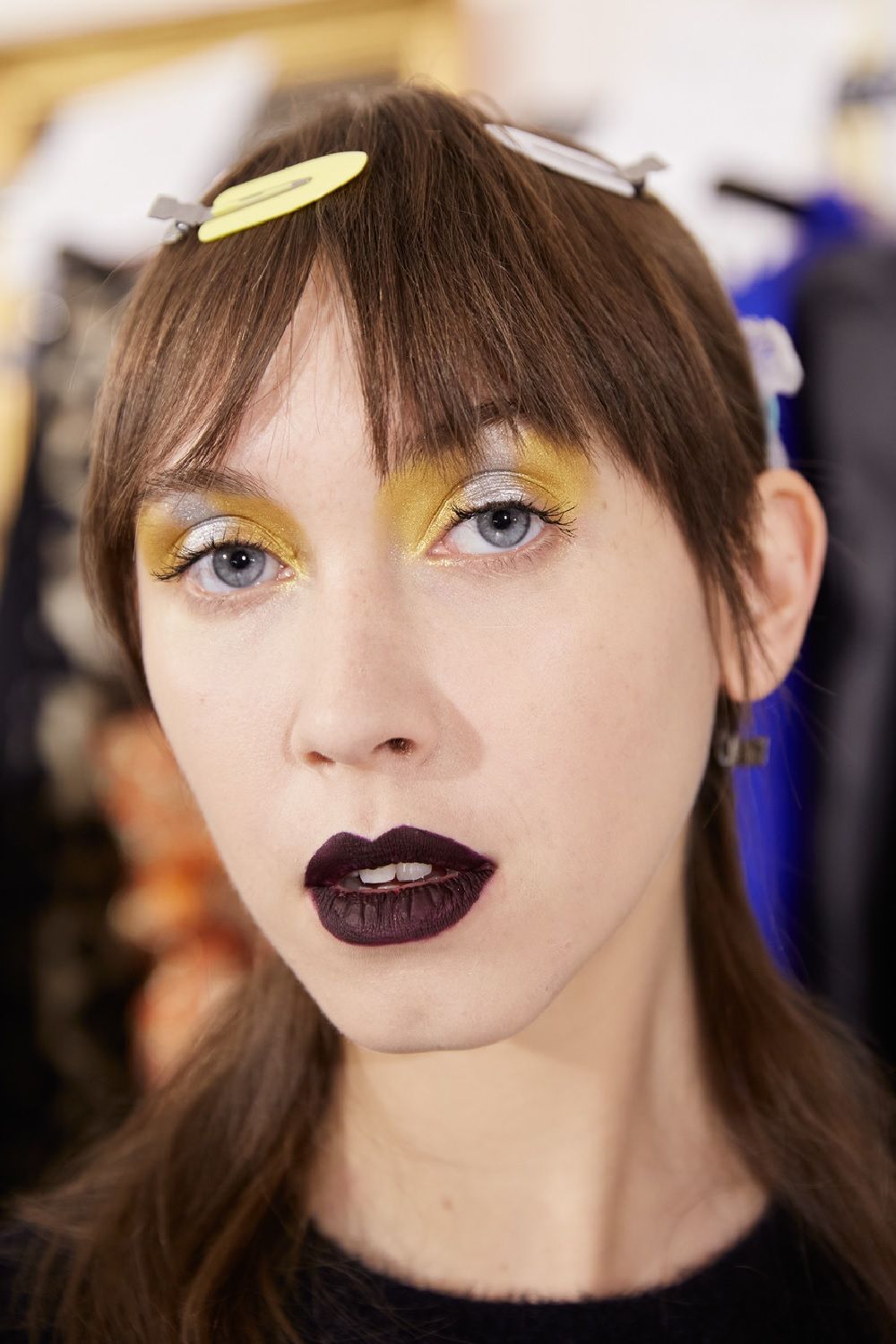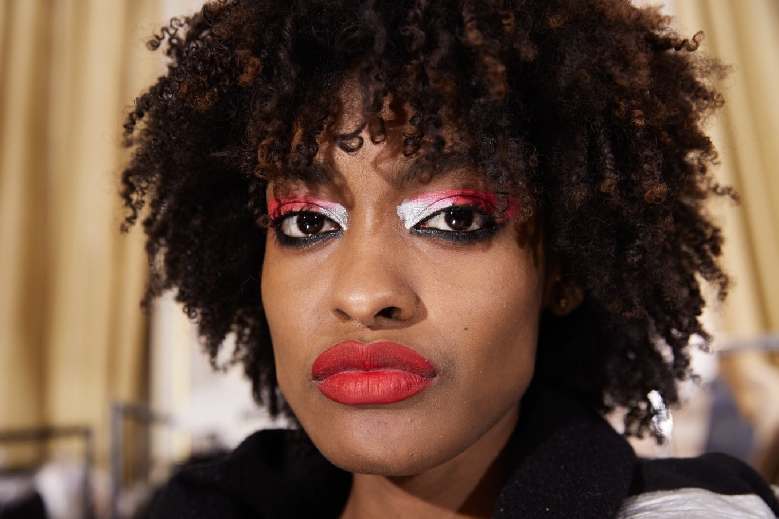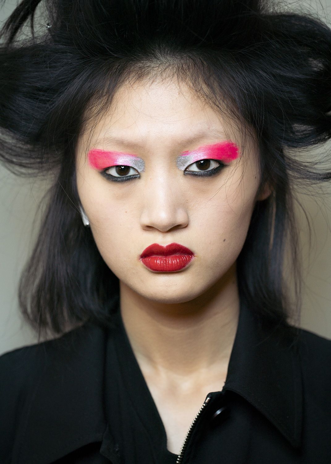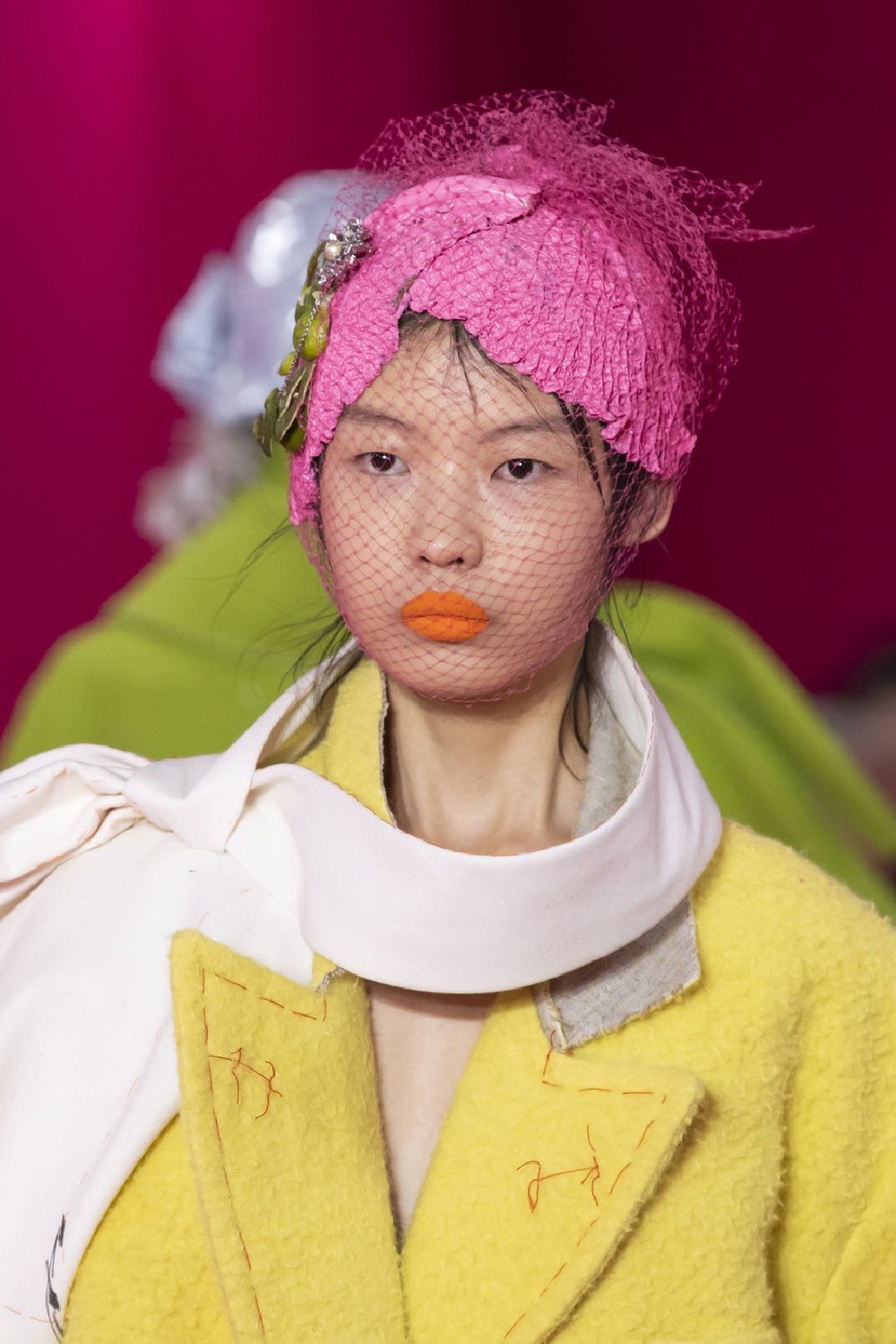 Il beauty di Maison Margiela è un sovraccarico vibrante di colori, ispirato dai dipinti di Edward Hopper. Pat McGrath ha optato, come il suo solito, per una pelle perfetta, luminosa, concentrato l’attenzione sulle labbra. Dal giallo all’arancione, dal fucsia al blu, dal verde lime al prugna, i rossetti hanno le sfumature dell’arcobaleno e un finish morbido, quasi cipriato. A completare l’effetto pop c’è l’headwear. I capelli hanno un wet look reso unico da velette e cloche molto speciali, fatte di foglie di cavolo dipinte al neon, con mini carote e fagiolini disposti come fossero piume decorative.