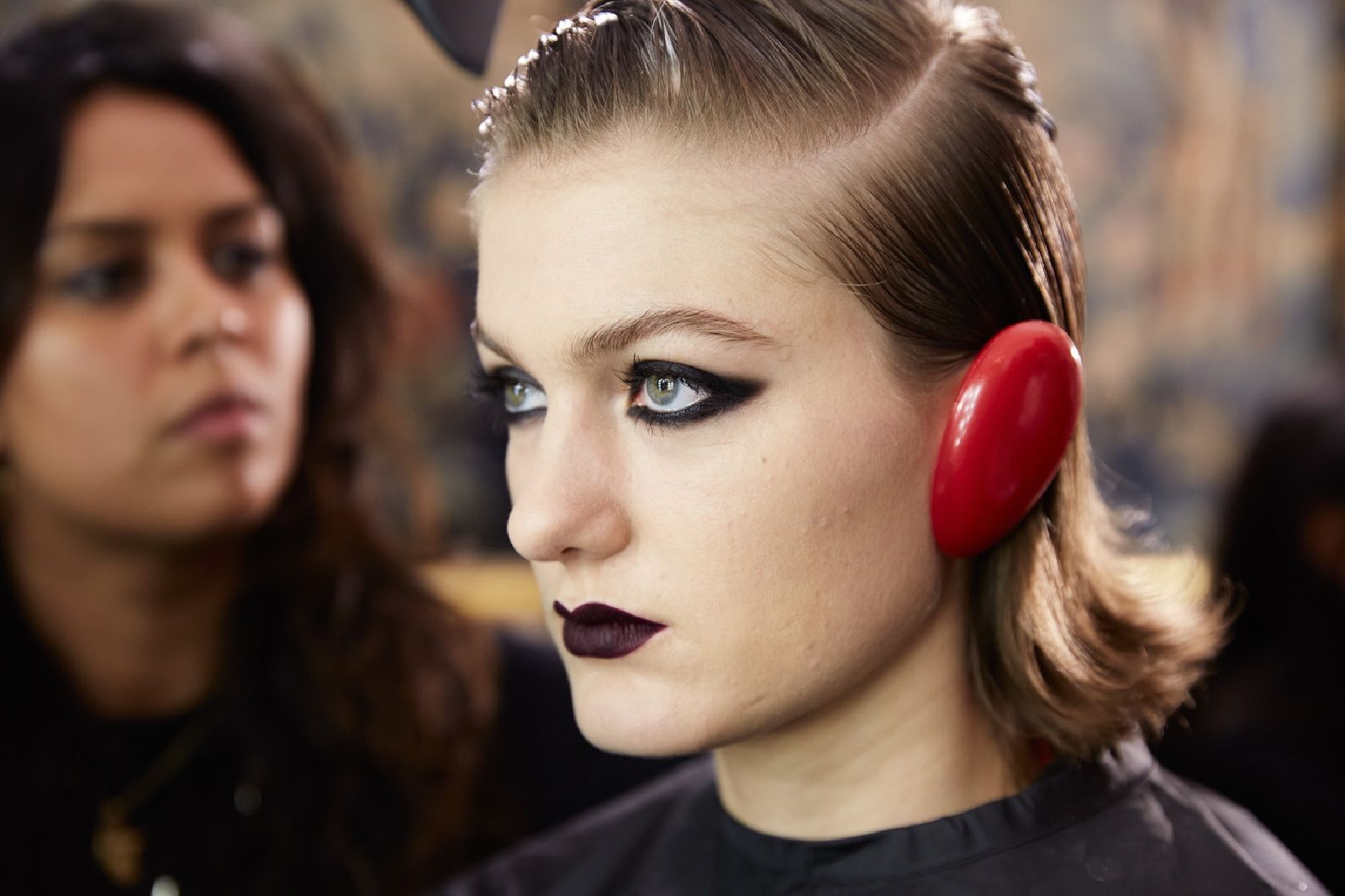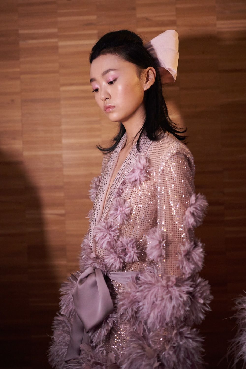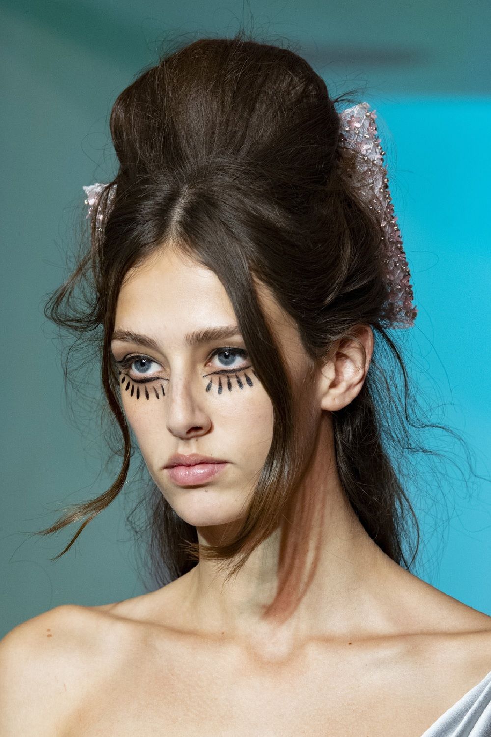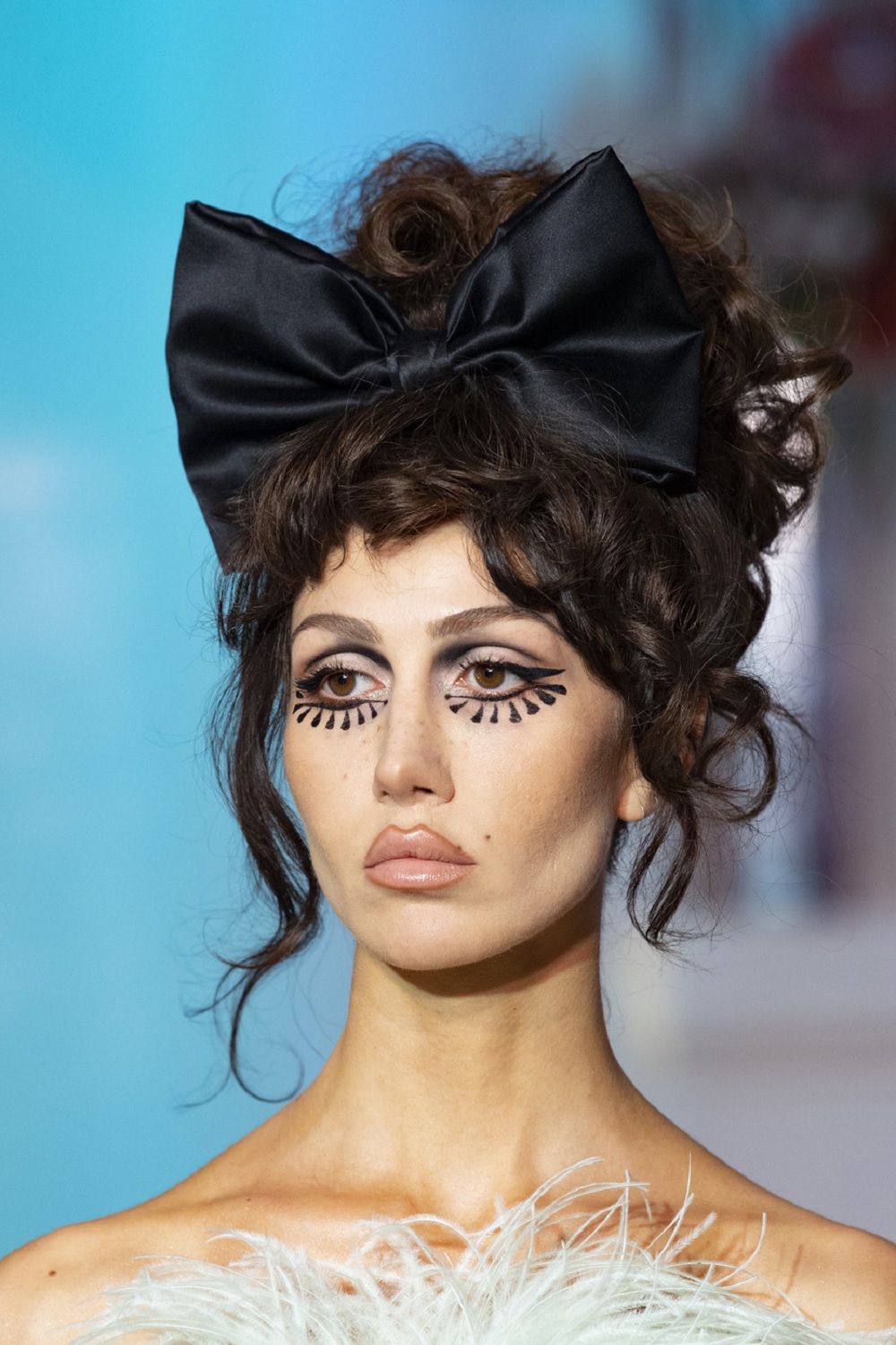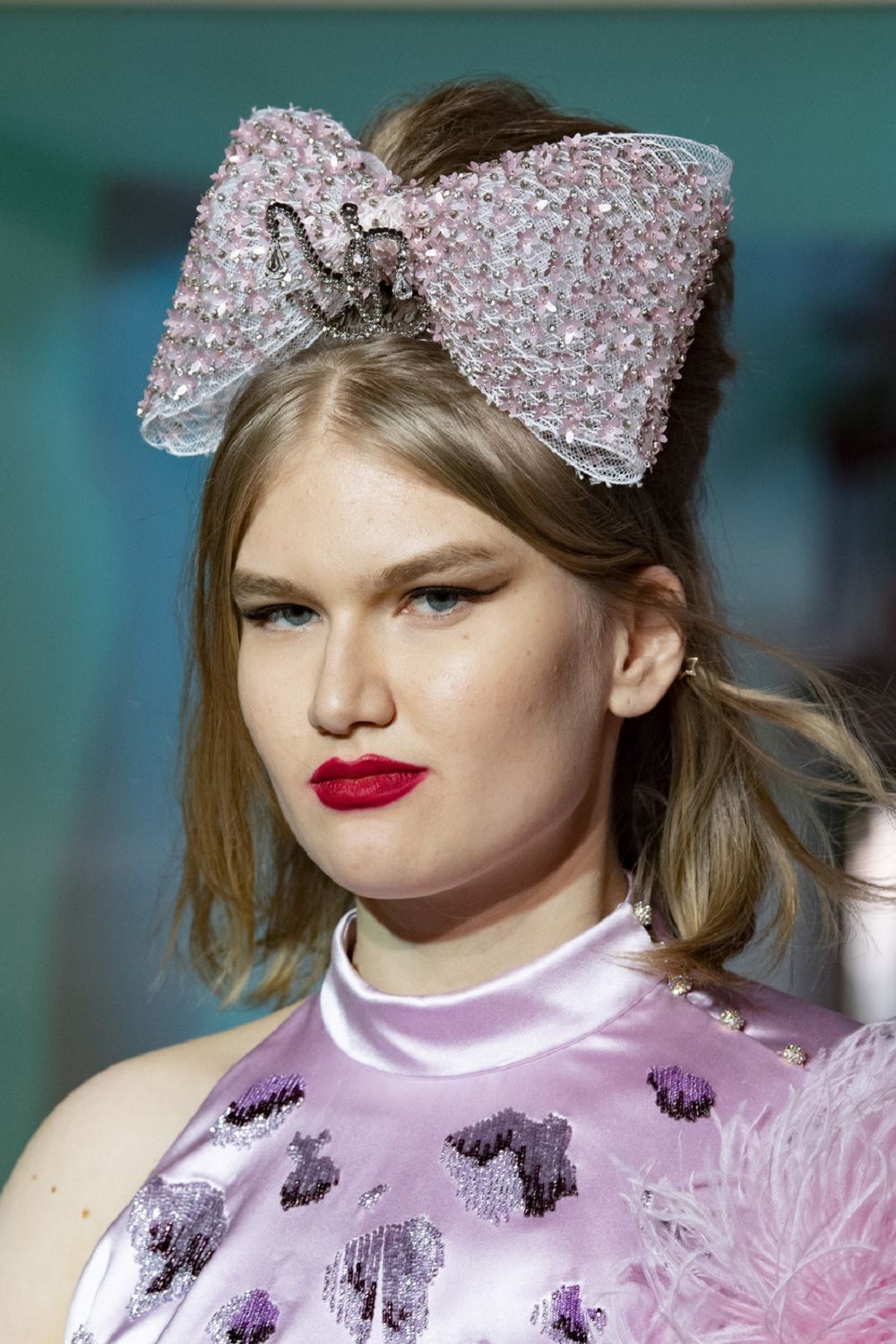 Per Ralph & Russo, Sam Bryant ha puntato su un make-up fresco e glowy, fatto di ombretti dai colori tenui, le stesse sfumature degli abiti della collazione. Sulle labbra un velo di rossetto MAC Snob rosa caramella. L’hairstyle di Larry King è un omaggio ai beehive hair degli anni '60 e alle cotonature di fine anni '80, anche se molti hanno visto nel look un riferimento al personaggio di Alicia Silverstone in Clueless. Avvolti in una ciocca, come parte integrante dell’acconciatura, spiccavano fiocchi di seta XXL.