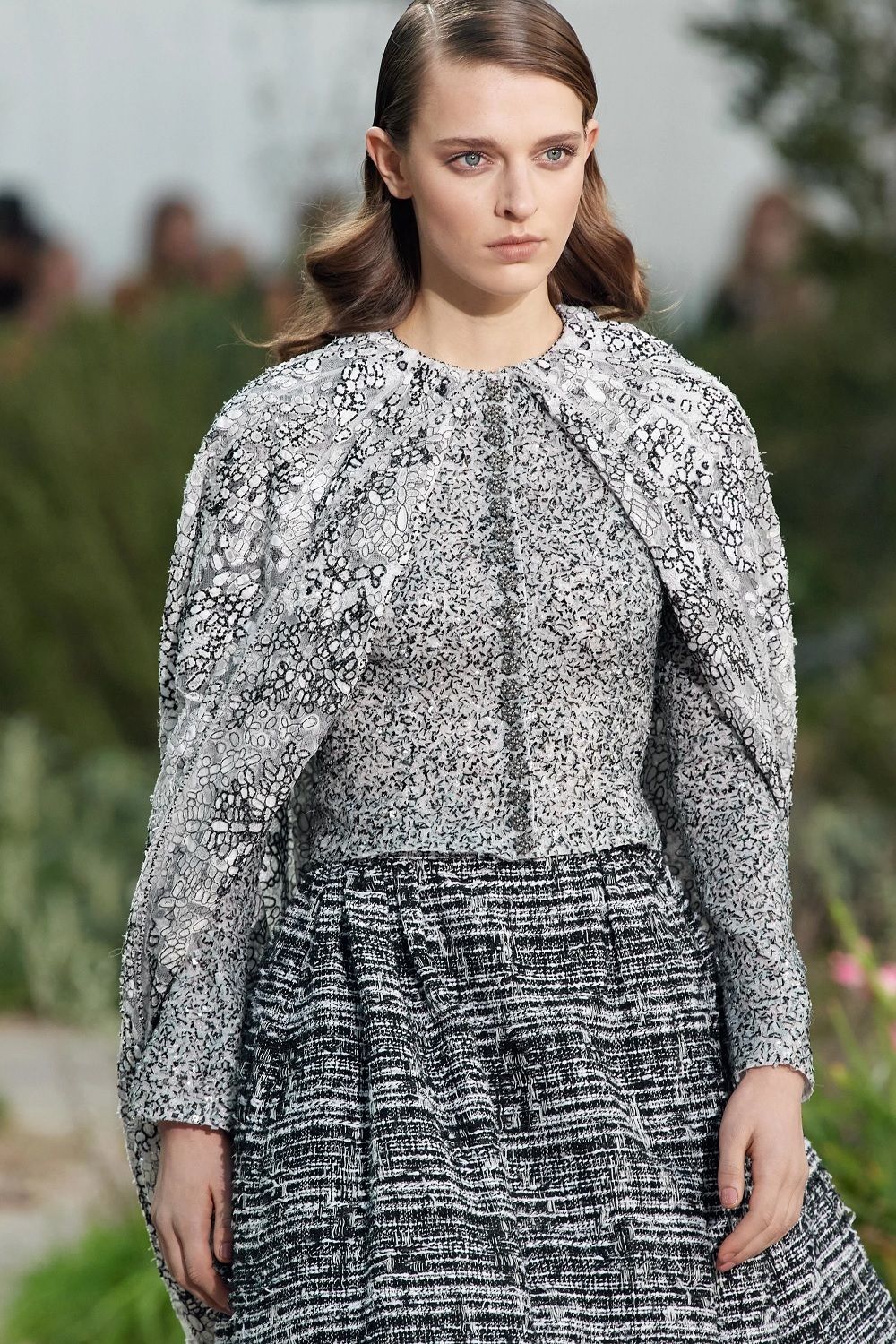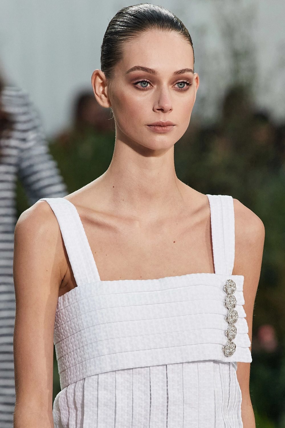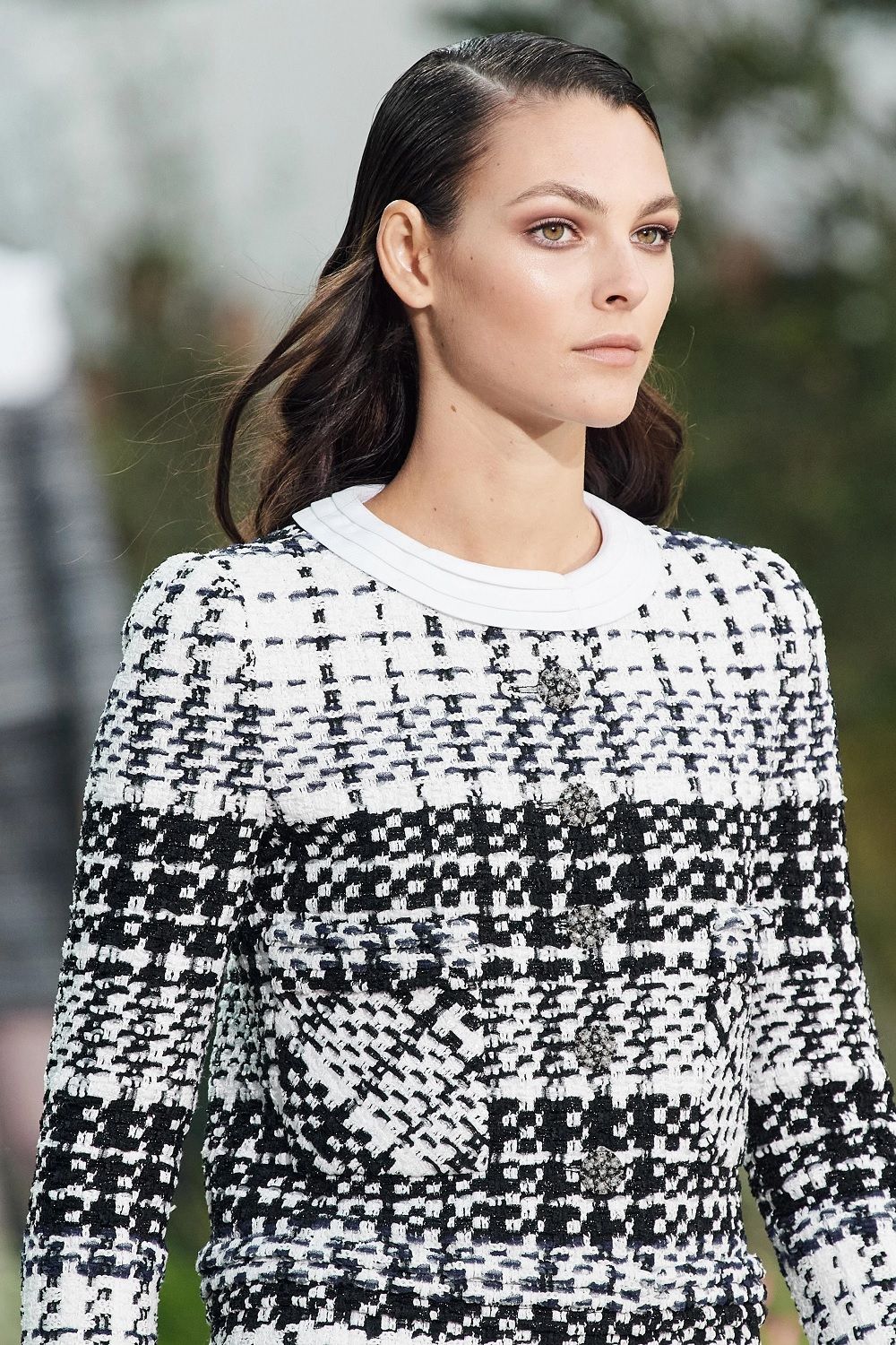Al Grand Palais, in un set che ricreava il giardino dell'Abbazia di Aubazine, l'orfanotrofio dove Coco Chanel e le sue due sorelle sono state lasciate dal padre da bambine, Virginie Viard racconta il "dialogo tra l’iperdecoro della haute couture e la grande semplicità di quel momento della vita di Mademoiselle". Le silhouette sono semplici, lineari,quasi infantili. È puro minimalismo sofisticato, come il beauty look creato da Lucia Pica: niente mascara o lipstick, l’incarnato è nudo, ravvivato da un tocco di bonne mine. Sulle palpebre di Vittoria Ceretti, Kaia Gerber, Gigi Hadid e le altre modelle c’è un accenno di smokey eyes nelle sfumature di marrone e malva. I capelli sono raccolti in un ordinato chignon o sciolti a onde sinuose con una scriminatura laterale disciplinata col gel.