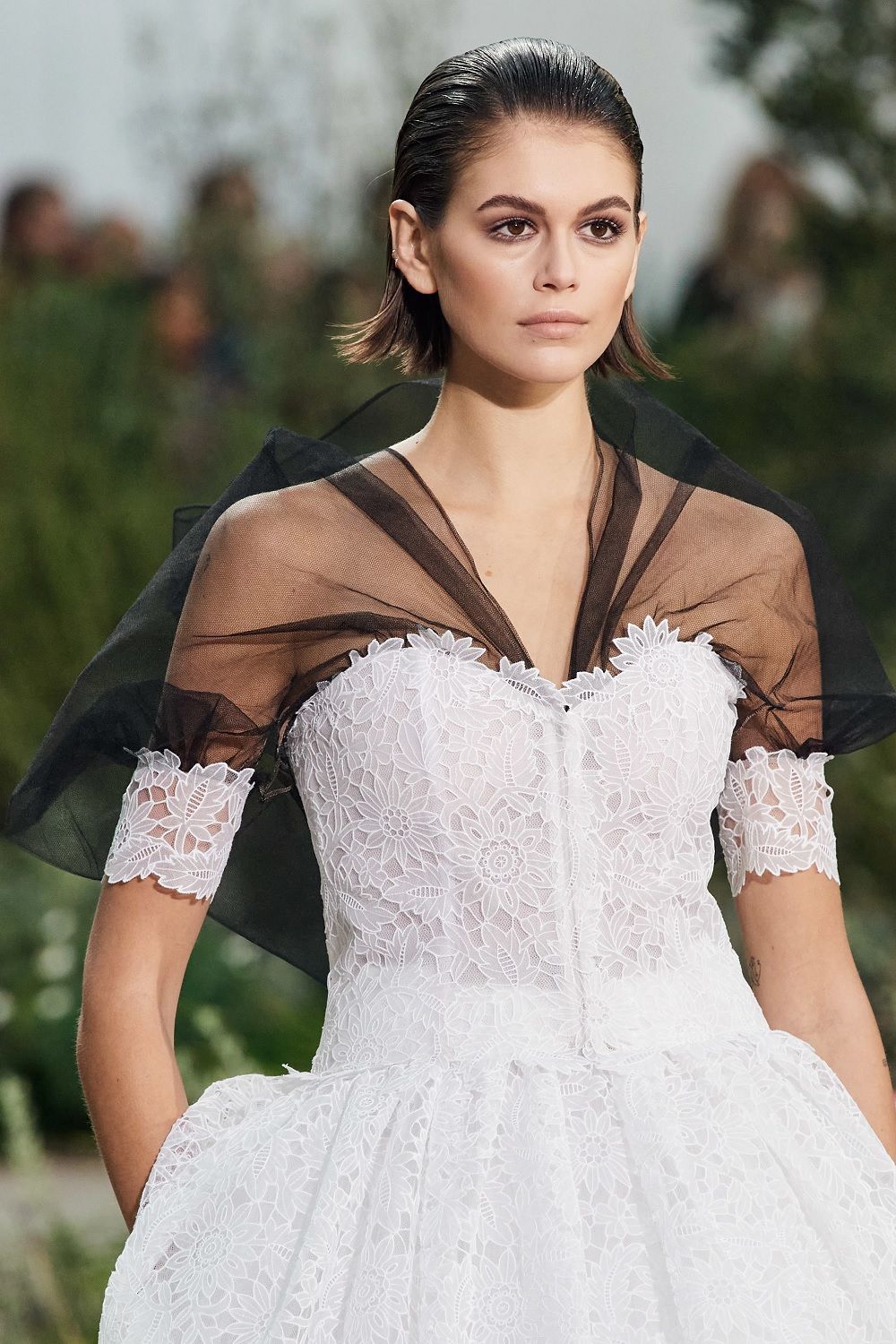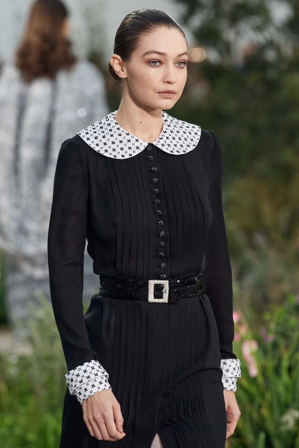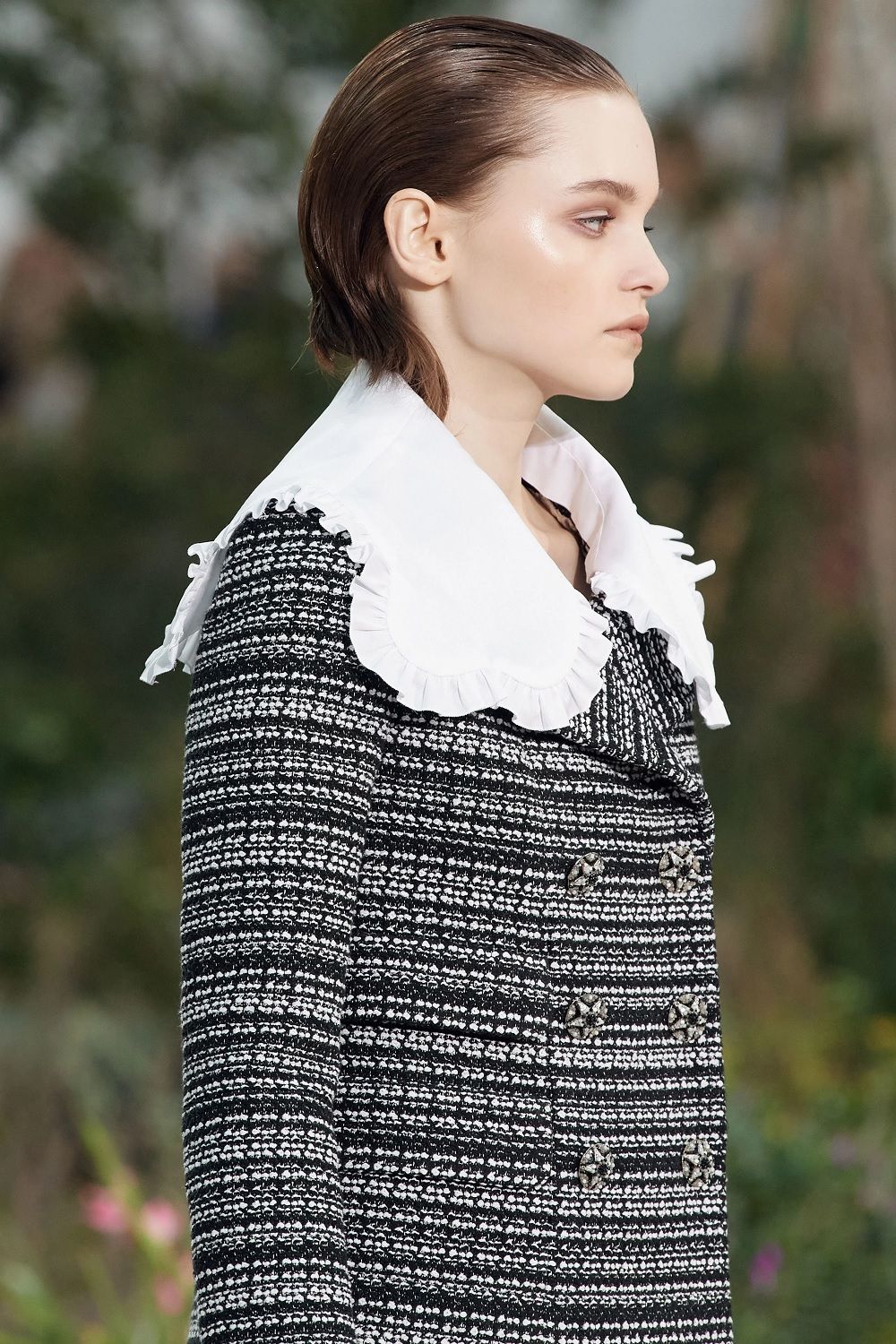 Al Grand Palais, in un set che ricreava il giardino dell'Abbazia di Aubazine, l'orfanotrofio dove Coco Chanel e le sue due sorelle sono state lasciate dal padre da bambine, Virginie Viard racconta il "dialogo tra l’iperdecoro della haute couture e la grande semplicità di quel momento della vita di Mademoiselle". Le silhouette sono semplici, lineari,quasi infantili. È puro minimalismo sofisticato, come il beauty look creato da Lucia Pica: niente mascara o lipstick, l’incarnato è nudo, ravvivato da un tocco di bonne mine. Sulle palpebre di Vittoria Ceretti, Kaia Gerber, Gigi Hadid e le altre modelle c’è un accenno di smokey eyes nelle sfumature di marrone e malva. I capelli sono raccolti in un ordinato chignon o sciolti a onde sinuose con una scriminatura laterale disciplinata col gel.
