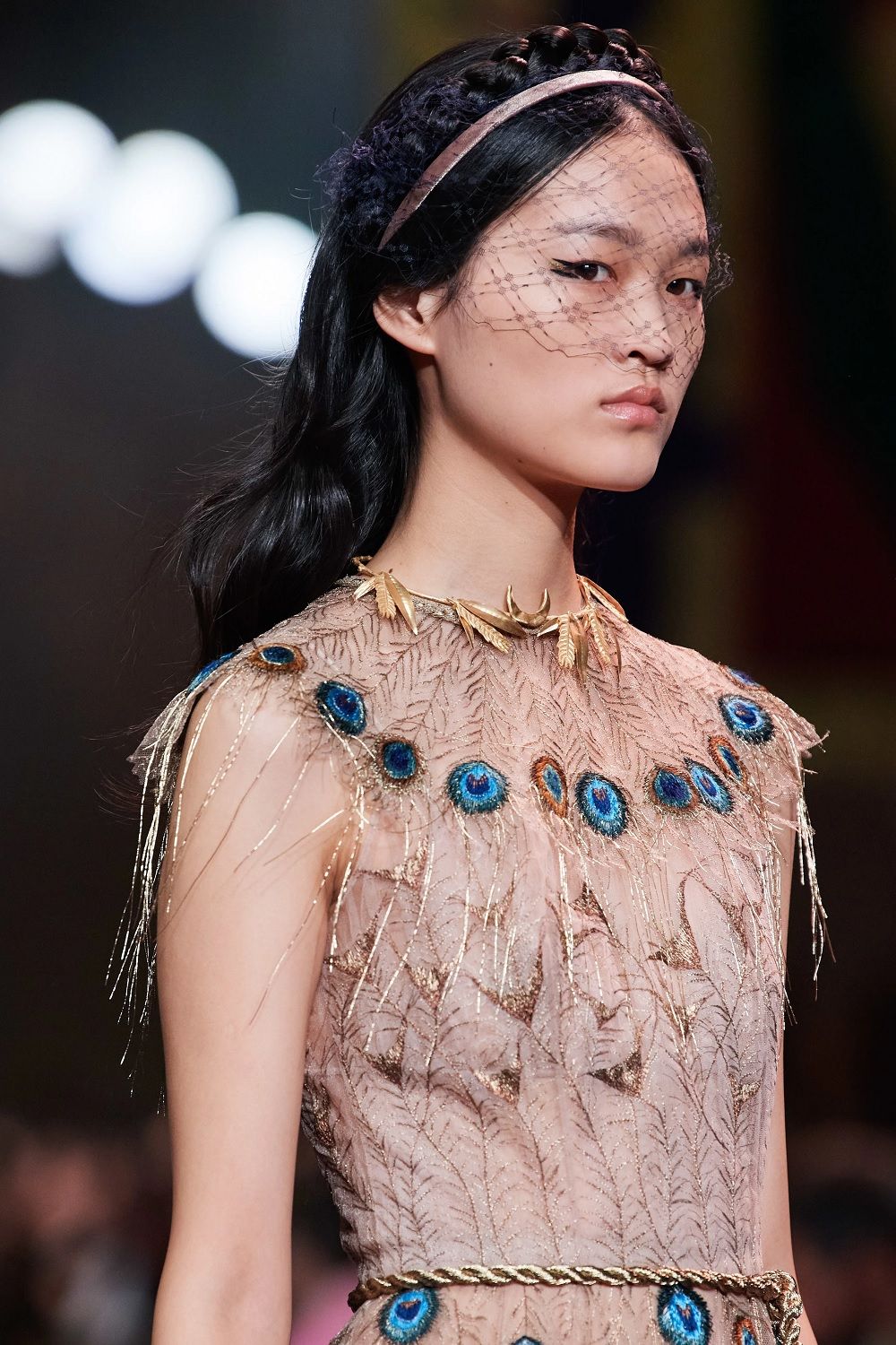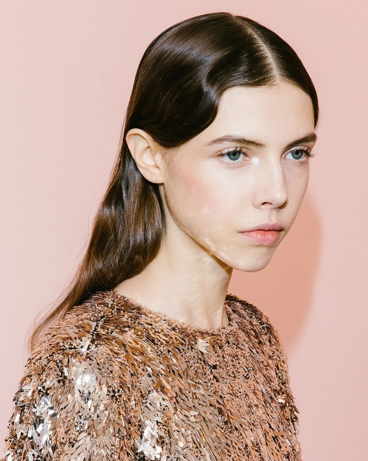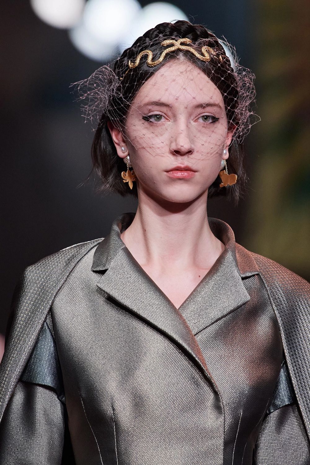 Maria Grazia Chiuri ha portato in passerella da Dior una celebrazione della femminilità e degli ideali del femminismo. Oltre agli abiti, a catturare l’attenzione sono stati beauty e hairstyle. Ispirandosi alle dee dell’antica Grecia, il make-up artist Peter Philips ha lasciato incarnato e labbra naturali, focalizzandosi sullo sguardo. Ha tracciato all’angolo degli occhi, sia sulla palpebra superiore che su quella inferiore, un doppio tratto di eyeliner nero. Poi ha riempito lo spazio tra queste due piccole ali minimali e grafiche con un ombretto dorato applicato inumidito. Guido Palau ha optato per uno styling sciolto, fermato da una treccia alla sommità del capo, ornata con un diadema e una piccola veletta.