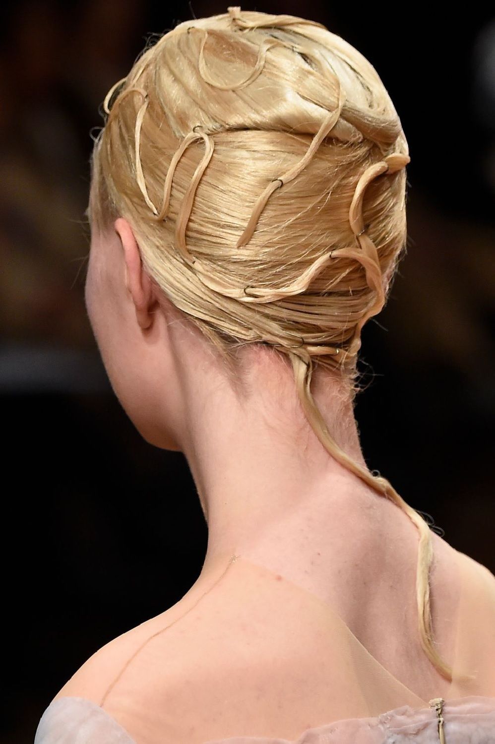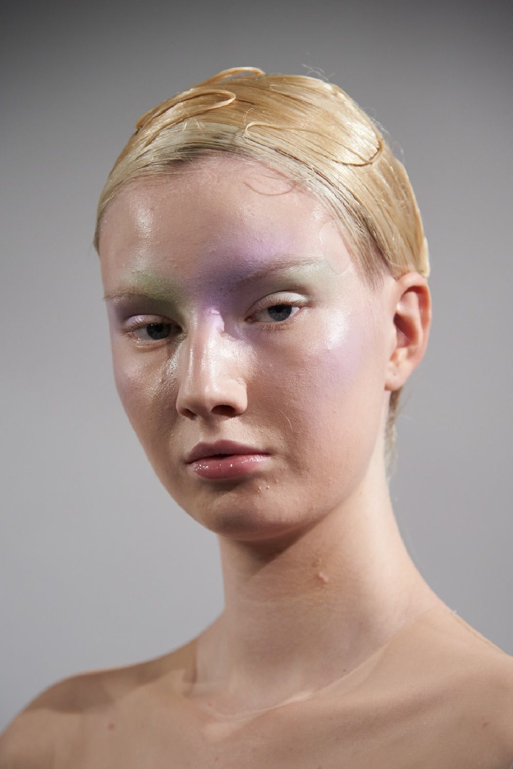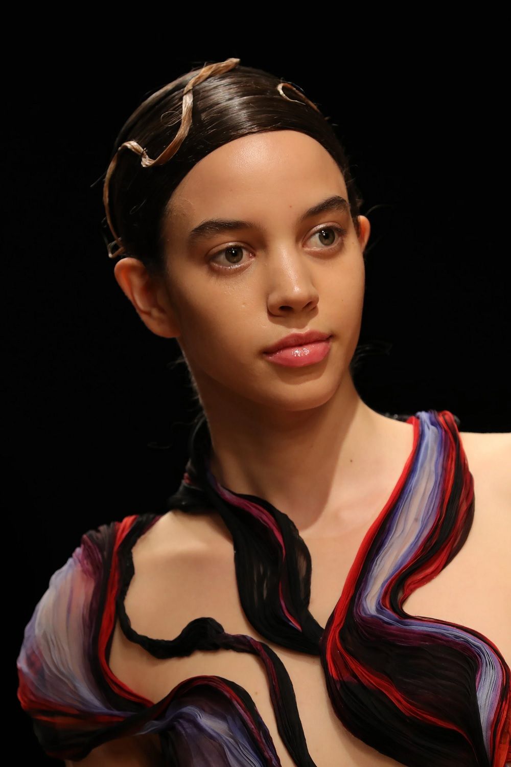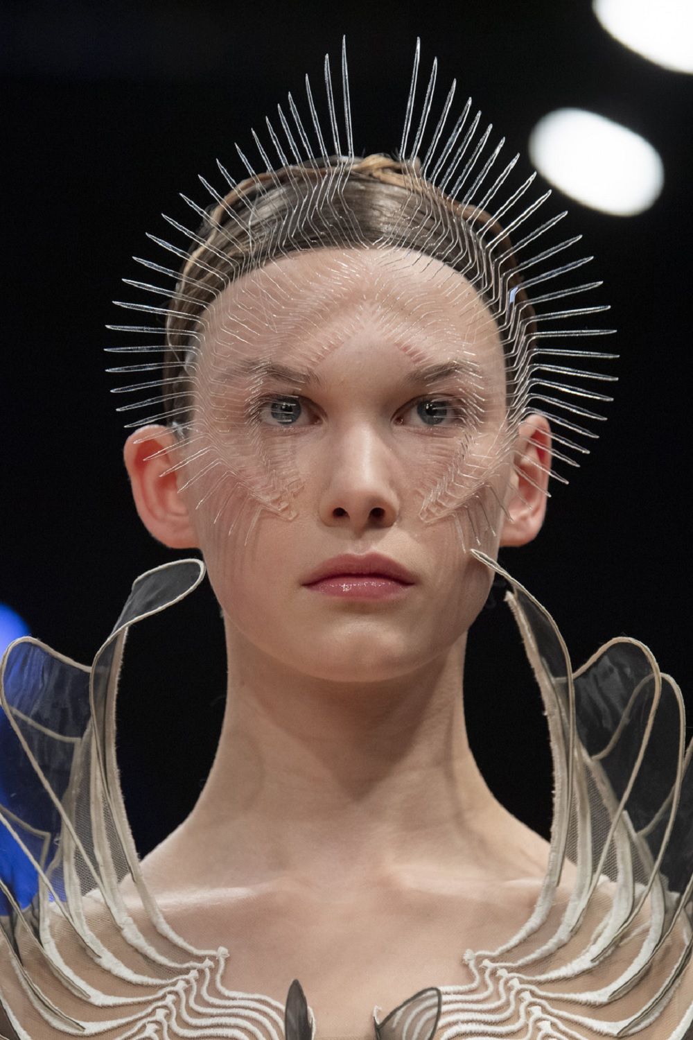 Iris Van Herpen continua ad unire tecnologia e arte, portando in passerella una collezione ispirata "dai processi sensoriali che si verificano tra l'intricata composizione del corpo umano, che si rispecchia nella fibrosa ecologia marina dei nostri oceani". Per le creature acquatiche della designer, Chiao Li Hsu ha miscelato sfumature personalizzate della palette Paintstick x 12 di MAC, creando particolari contorni grafici sugli occhi e sulle sopracciglia. Un look etereo enfatizzato dalle acconciature di Martin Cullen e Björn Axén. I due hanno evocato lo spirito di Medusa realizzando scultoree e lucide ciocche arrotolate e fermate sulla testa con delle forcine.