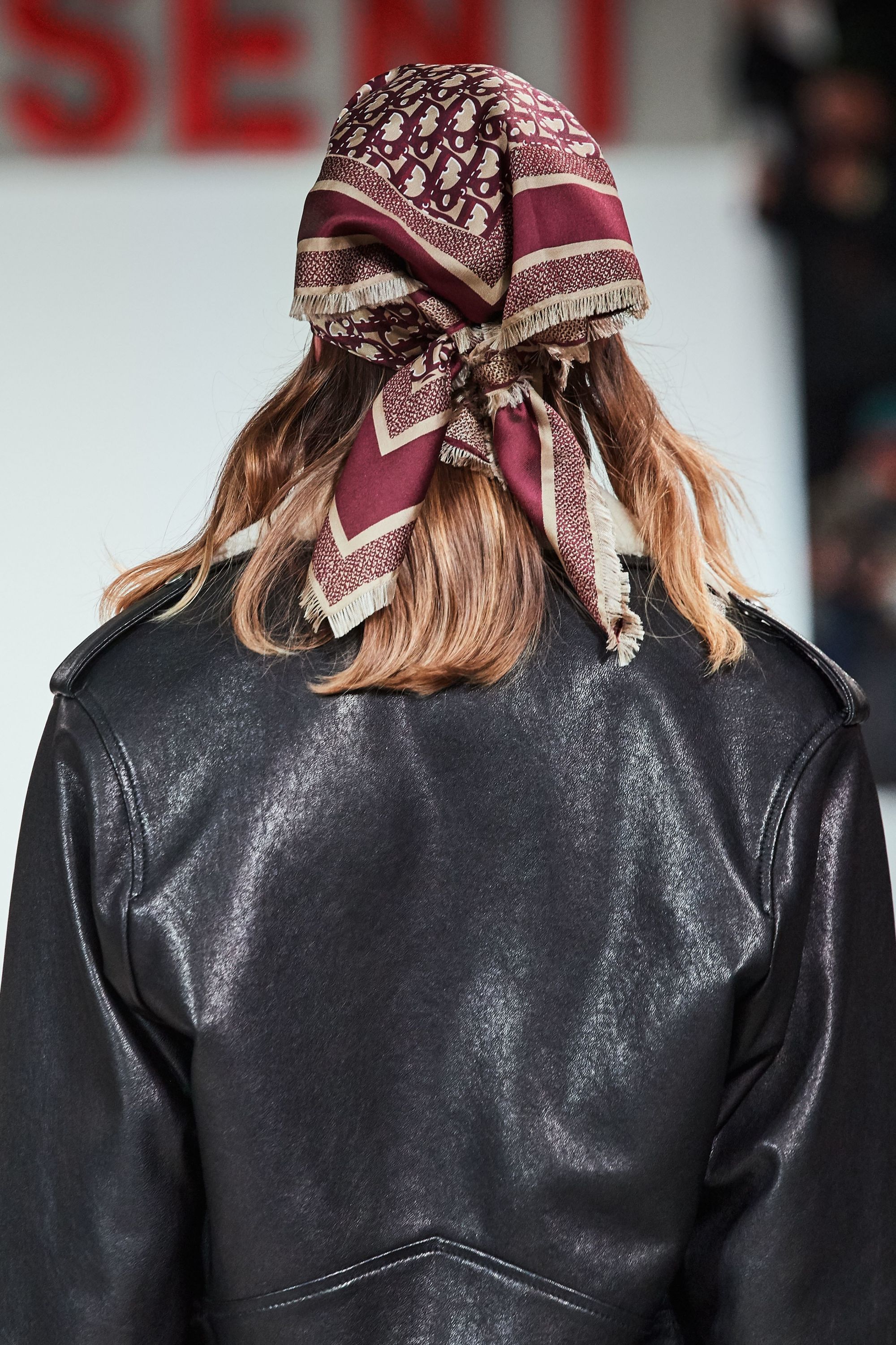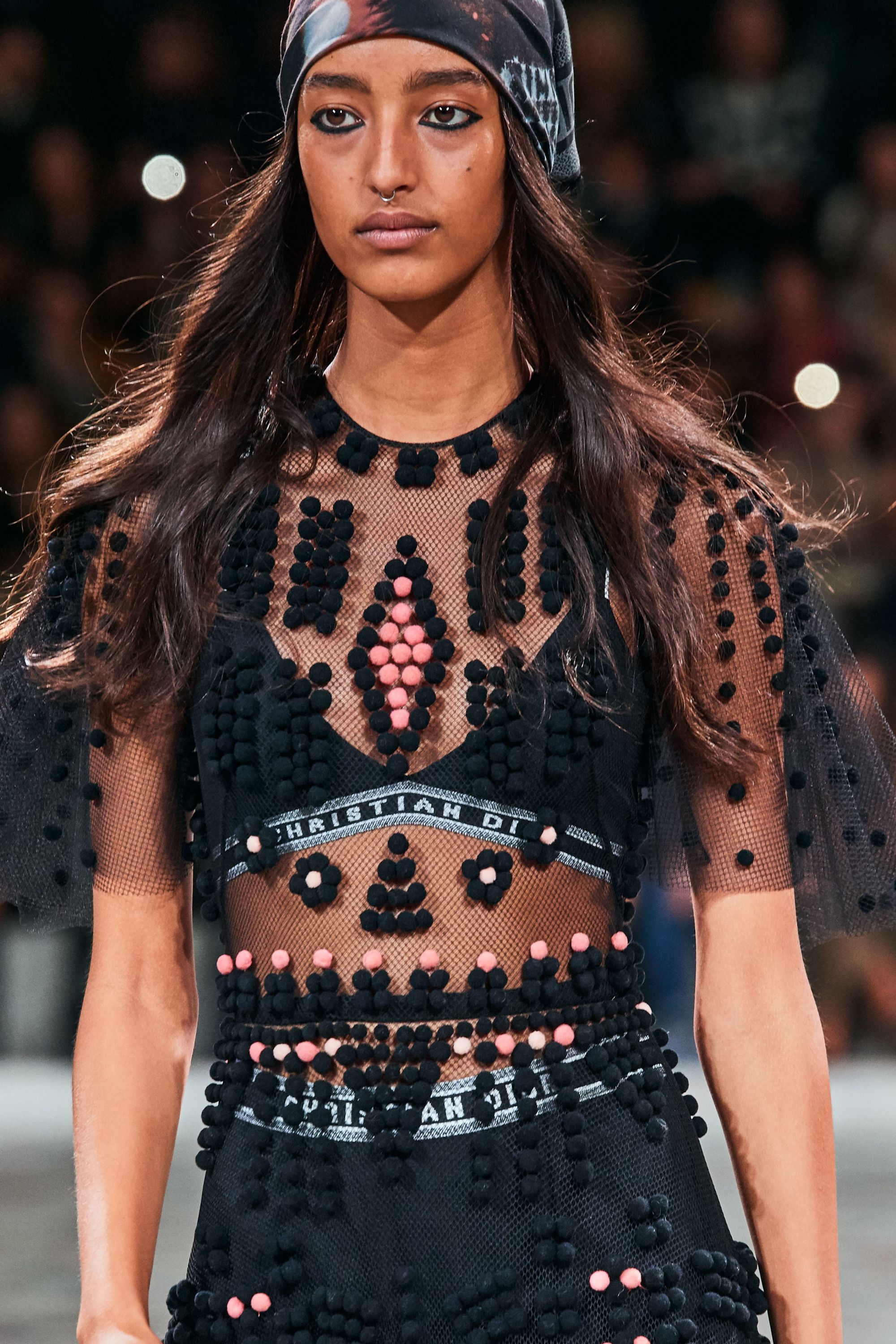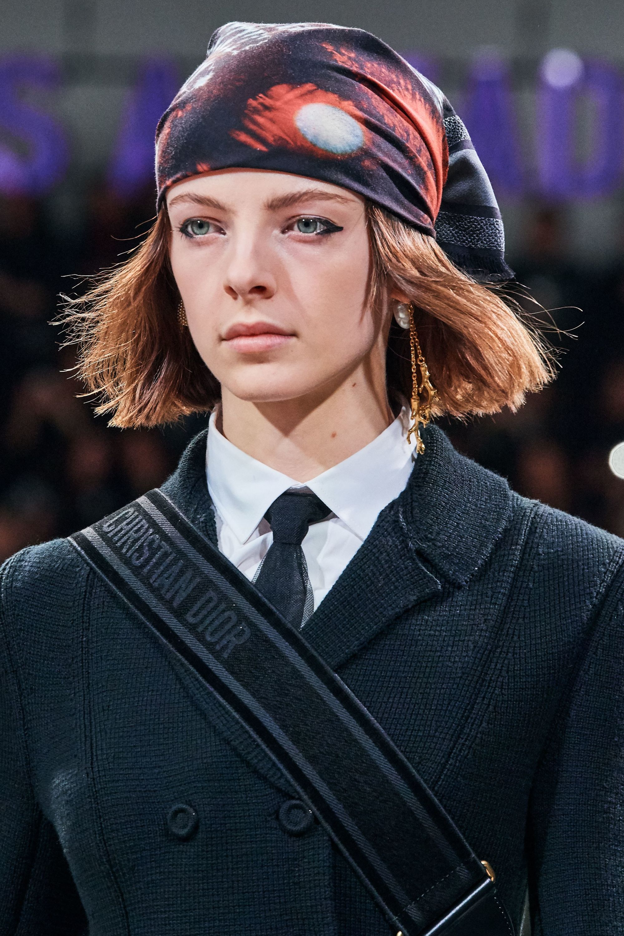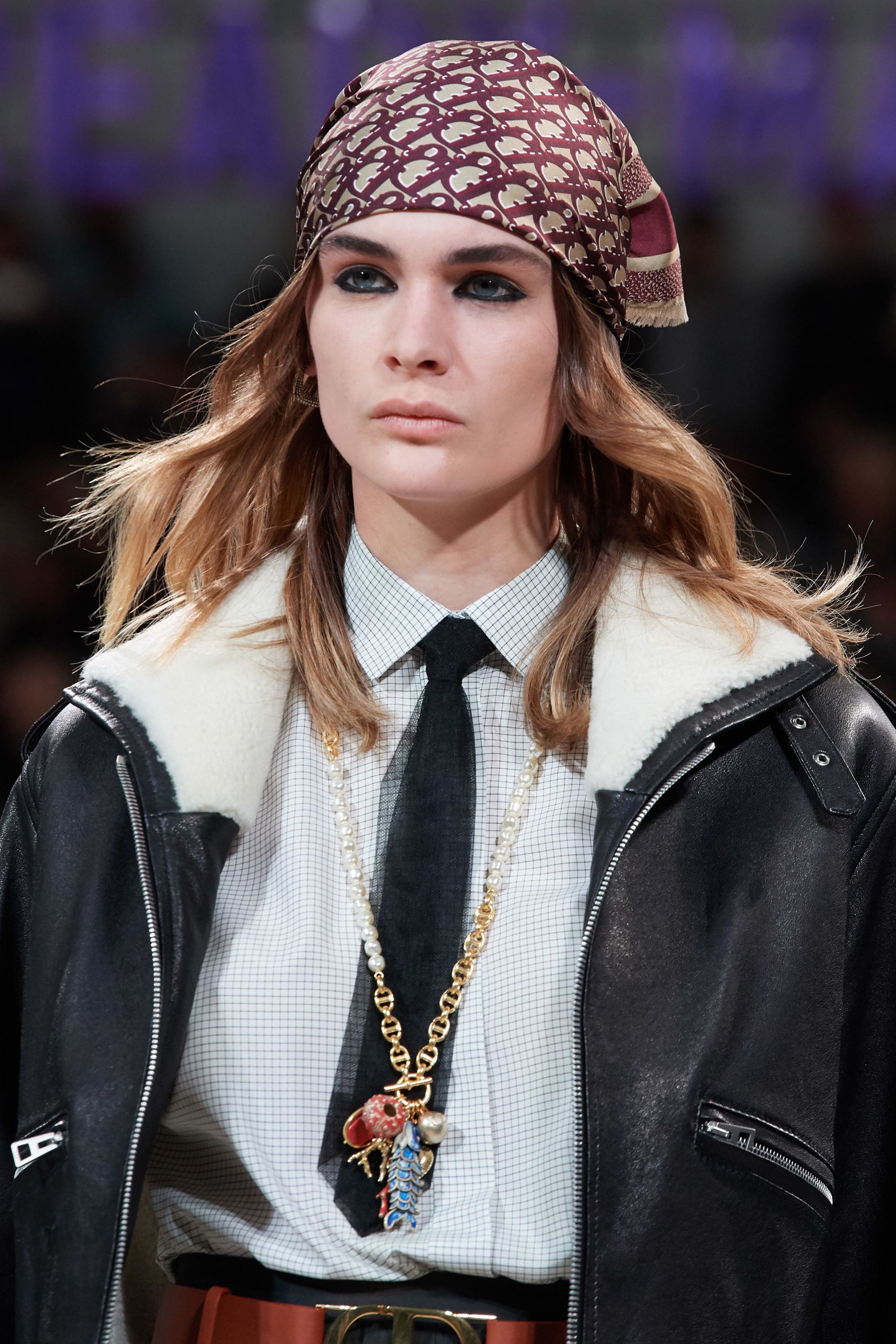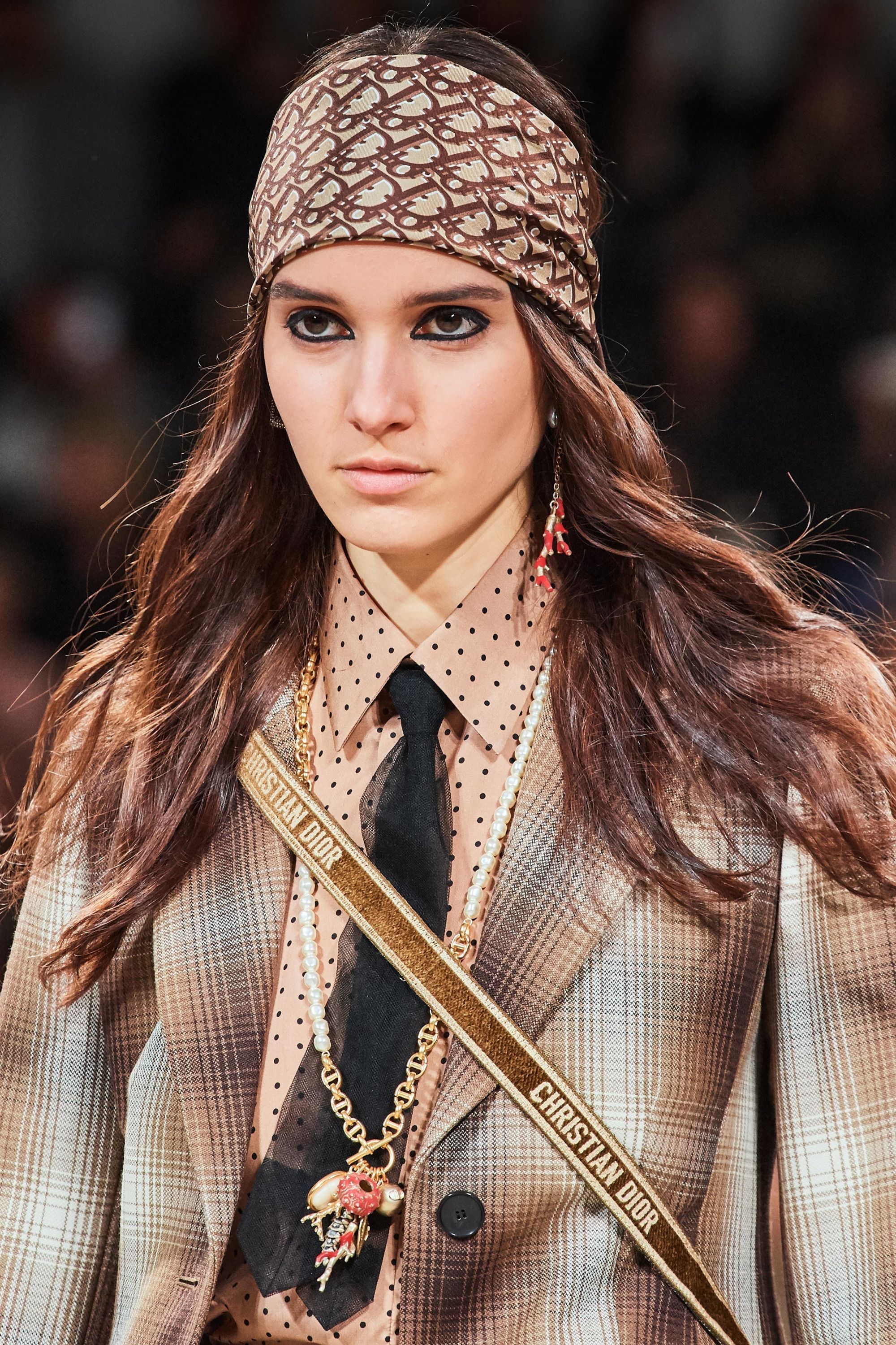 Anche per Dior, Guido Palau è alla direzione artistica per hairstyle e accessori per capelli: Guido sceglie di utilizzare i foulard monogram di Dior per ricreare diversi effetti ed hairstyle, come la bandana e la fascia. Il make-up è creato da Peter Philips, che su una base nude con ciglia leggermente incurvate, applica un eyeliner marcato, accentuando il mood anni '70.