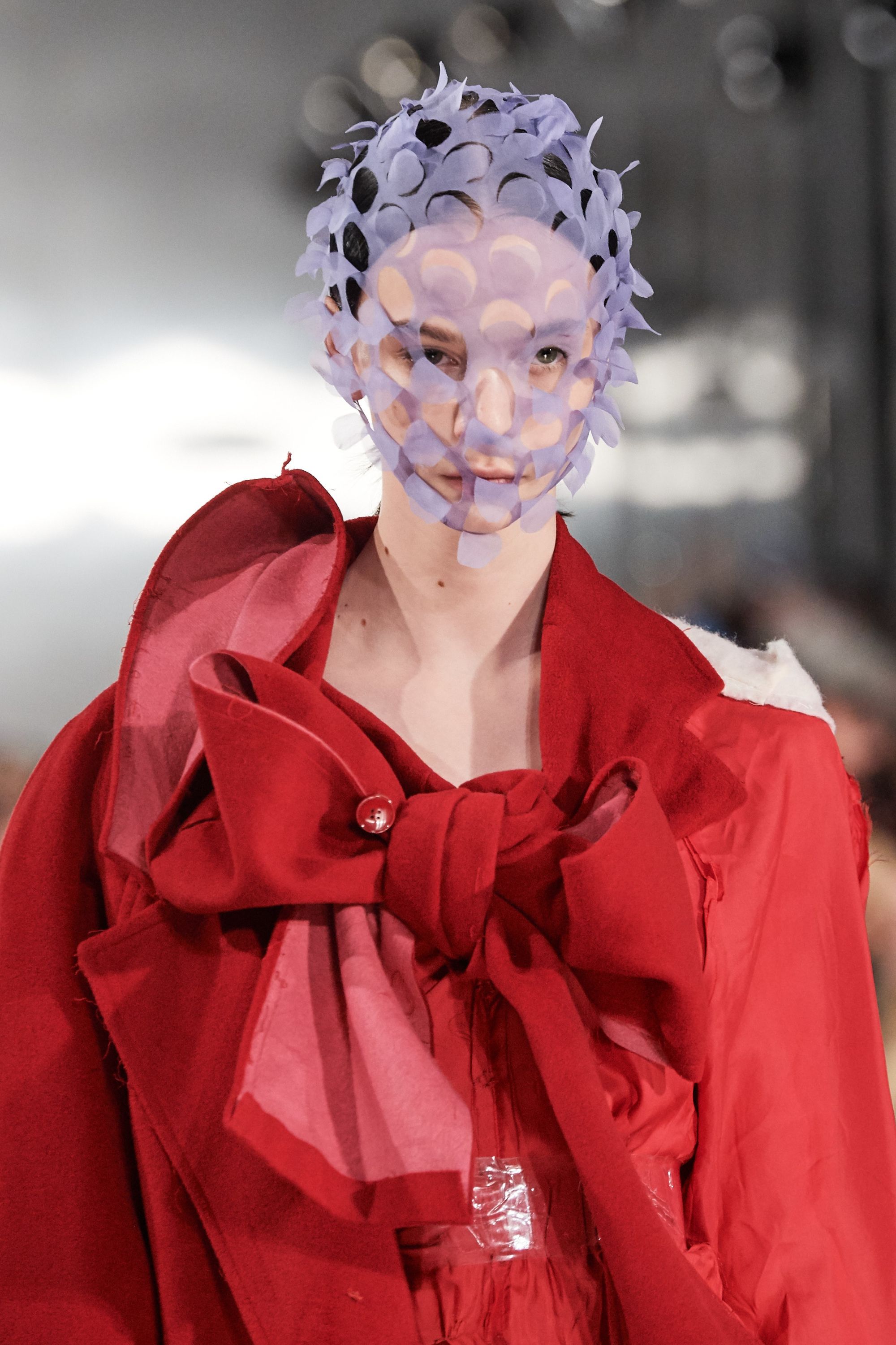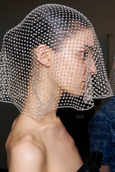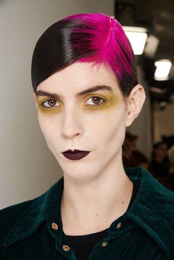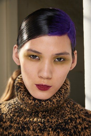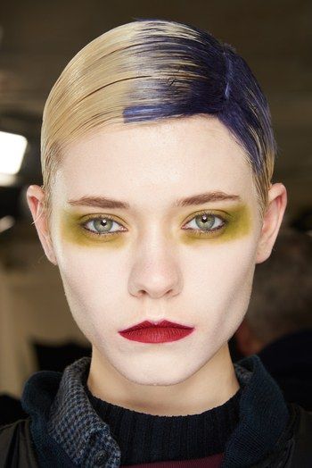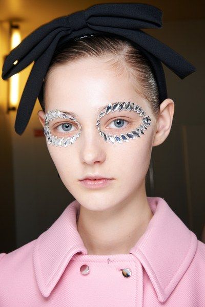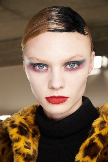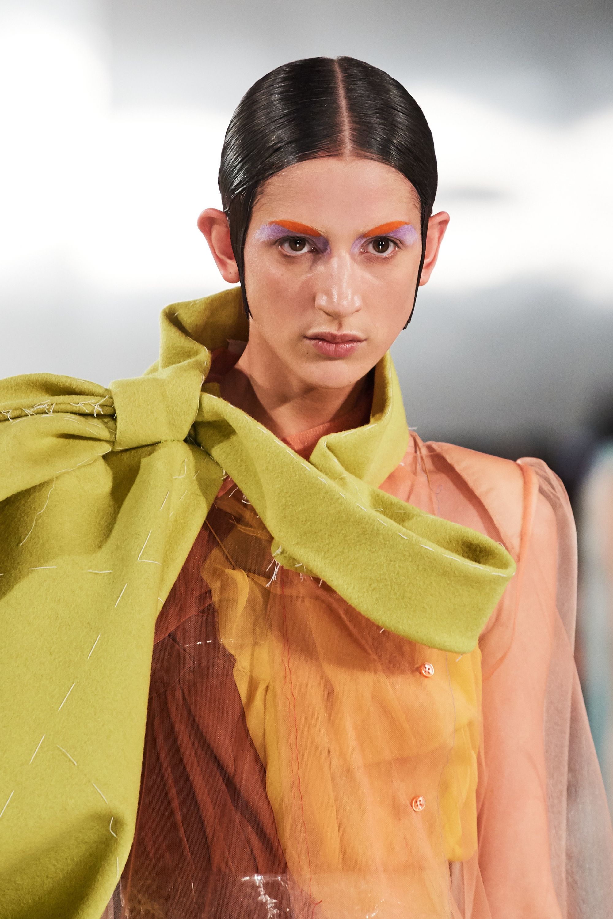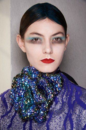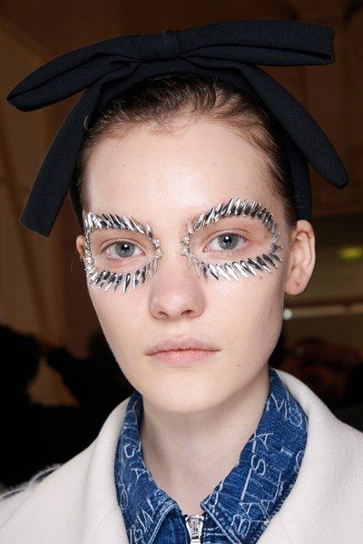 Ancora una volta la protagonista è PatMcGrath e il suo utilizzo dei colori, con sfumature e tonalità a contrasto. Gli eyeshadow color lavanda e azzurro e l'eyeliner nero si mescolano con la texture arancione delle sopracciglia (le sopracciglia colorate sono uno dei trend più cool dell'anno!). Eugene Souleiman alterna per gli hairstyle copricapi e maschere a slick hair con dettagli grafici.