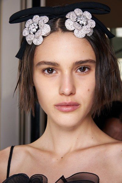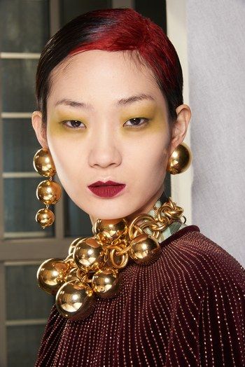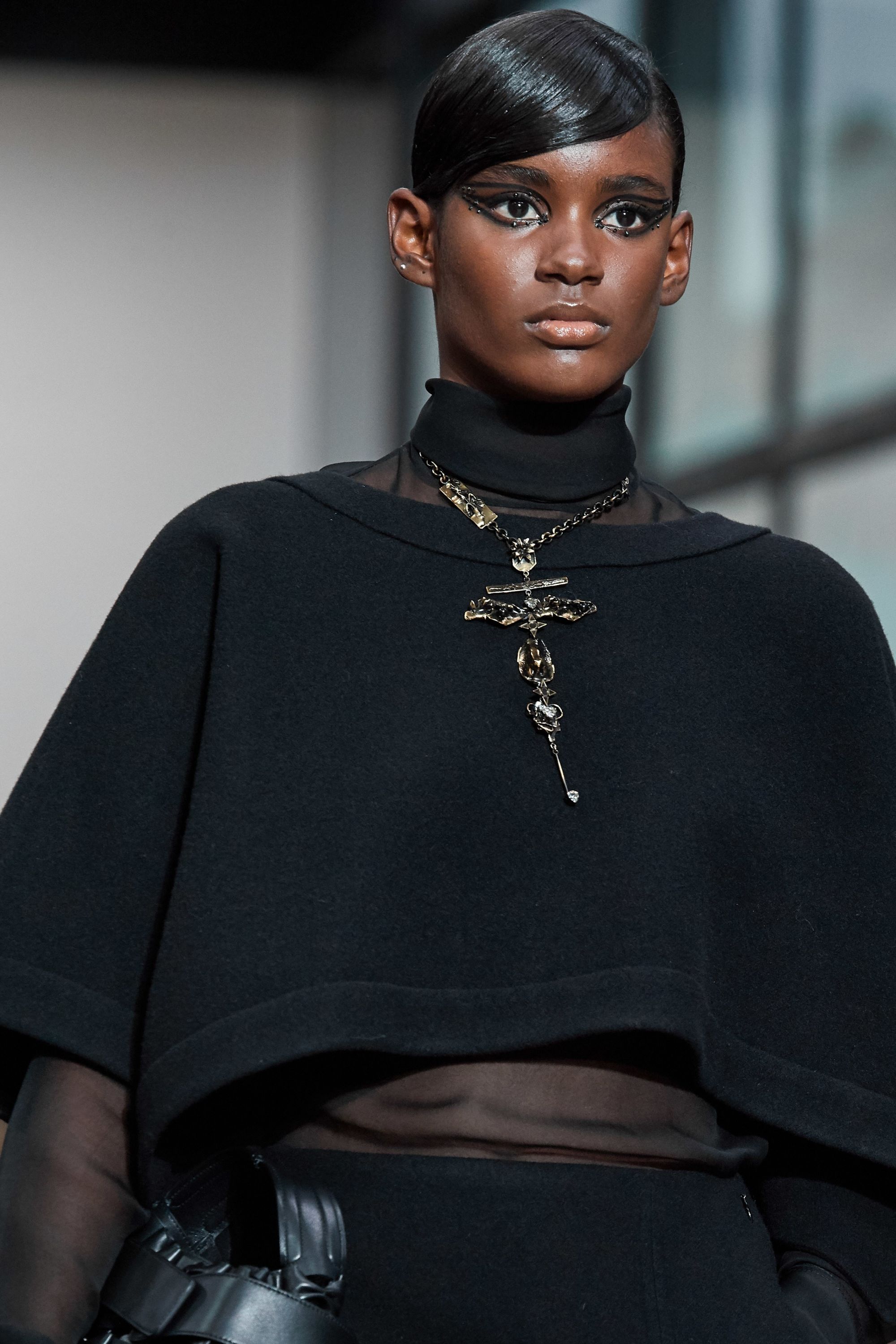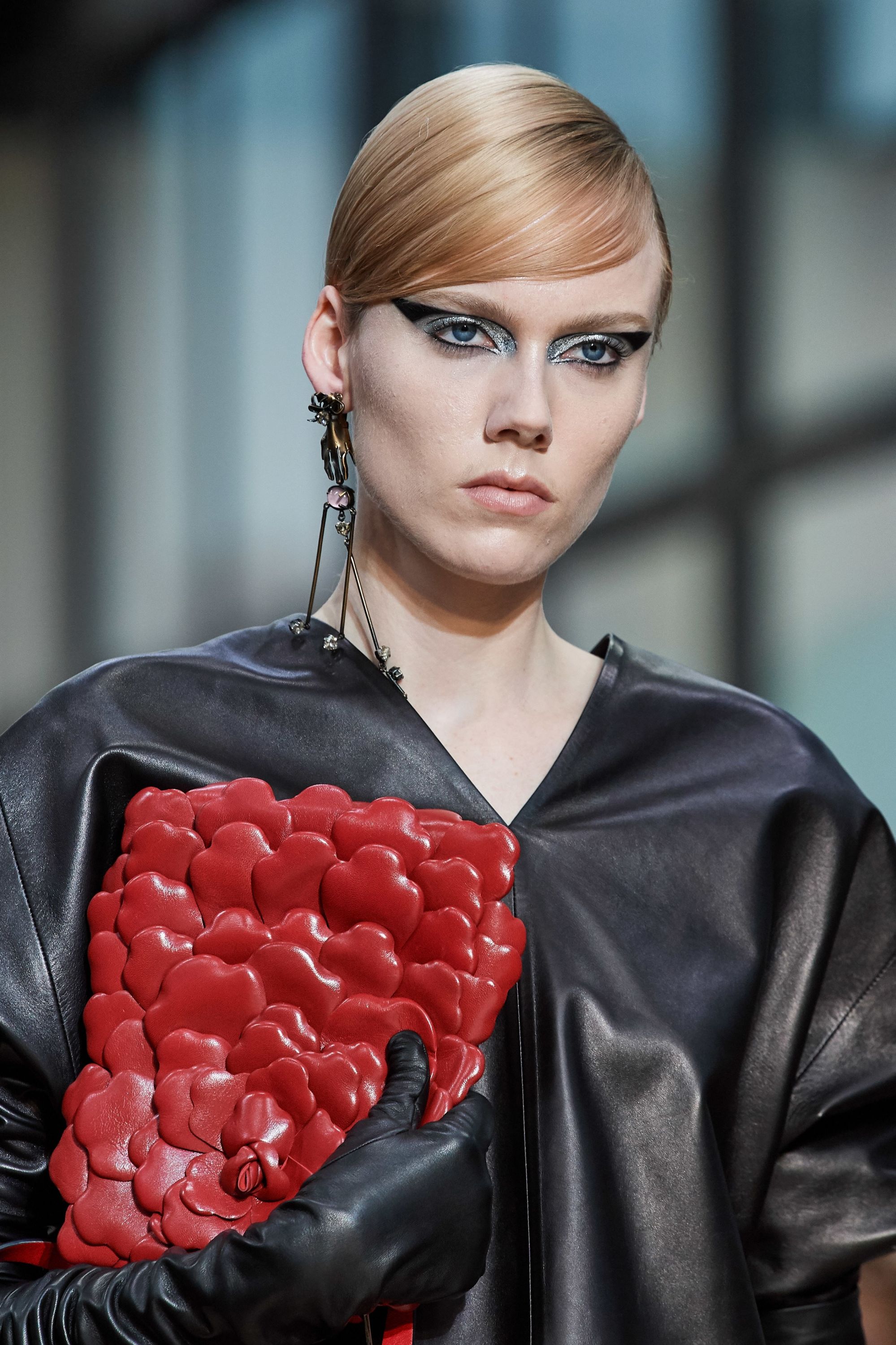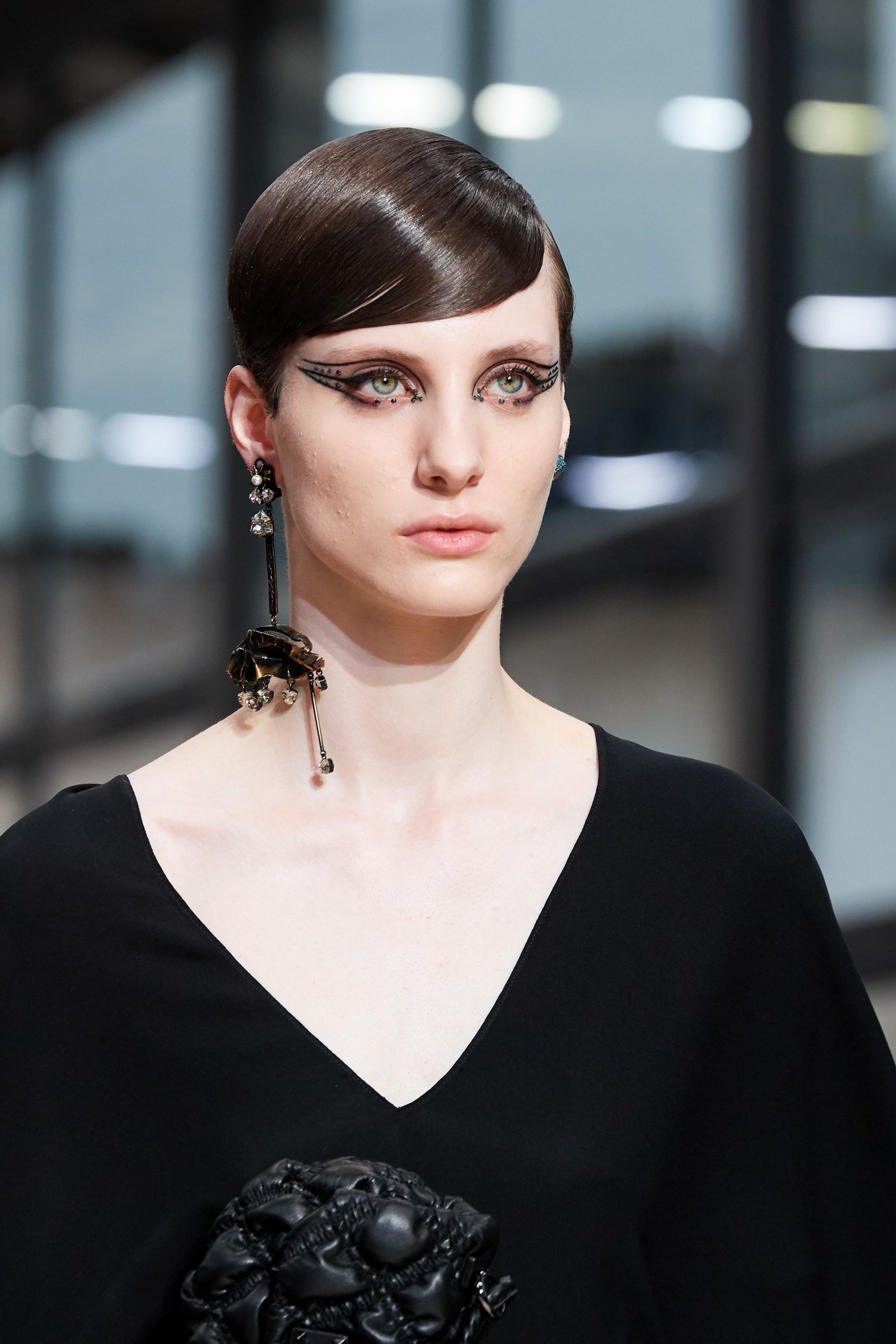 I beauty look di Valentino, creati dalla combo di leggende Pat McGrath e Guido Palau, prevedono un eyeliner grafico impreziosito da piccole "borchie" in total black che illuminano lo sguardo, e capelli effetto liscissimo e wet portati su un lato della fronte. I gioielli sono audaci e vistosi, ma elegantissimi, come tutto il look.